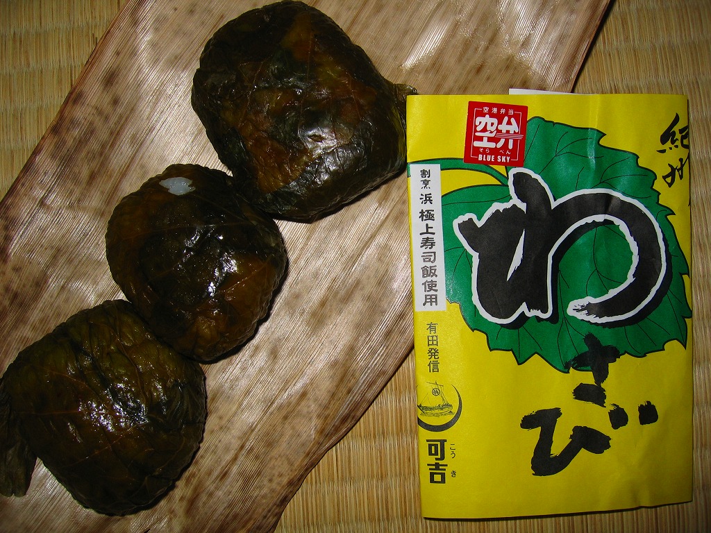 2005年までに関西空港の空弁として登場。商品名を記した掛紙が巻かれた竹皮の中に、それぞれ大根、山くらげ、うなぎを具に入れた、ワサビの葉を巻く握り飯が、個別にラップを巻かれて1個ずつ入る。地域色は豊かなのだろうが、あまりうまいものではないし、空弁としてほとんど話題になっていない。 成田もそうだが、機内食を出す国際線がメインの空港は、空弁需要が限られるのだろうか。あれだけ大規模な空港で、しかも昼下がりの訪問にもかかわらず、出発ロビーの空弁屋はJAL系売店1箇所のみ。しかも商品は1社4種の消費期限が長い寿司と「みち子」シリーズですべてであった。 【関西国際空港】1994(平成6)年9月4日開港 大阪府泉佐野市泉州空港 http://www.kansai-airport.or.jp/ 【有限会社可吉 こうき】和歌山県有田市初島町浜1番地 0737(82)2444 Copyright (C) 2006-2022 まっこうくじら |