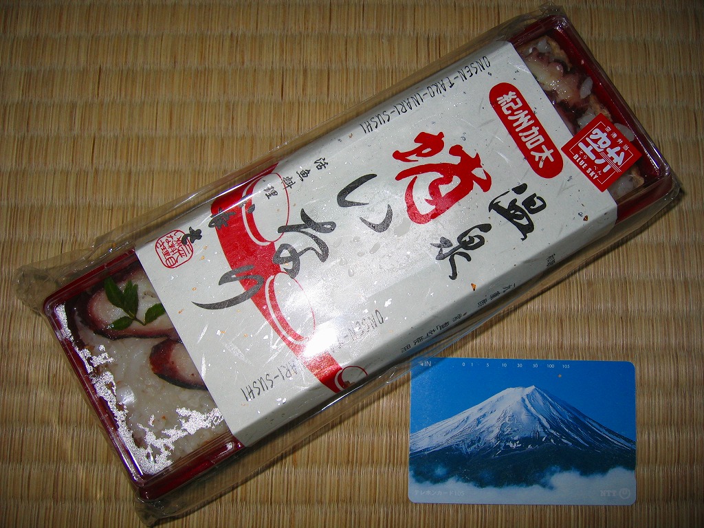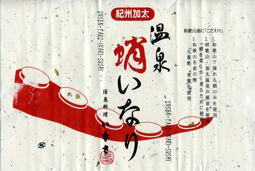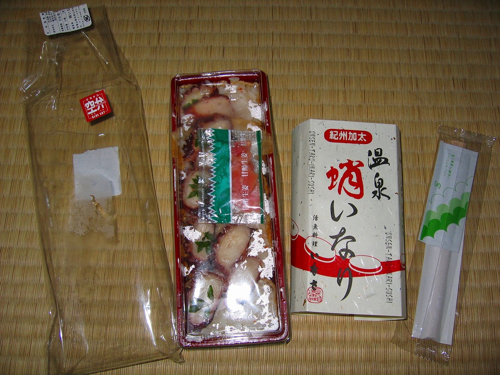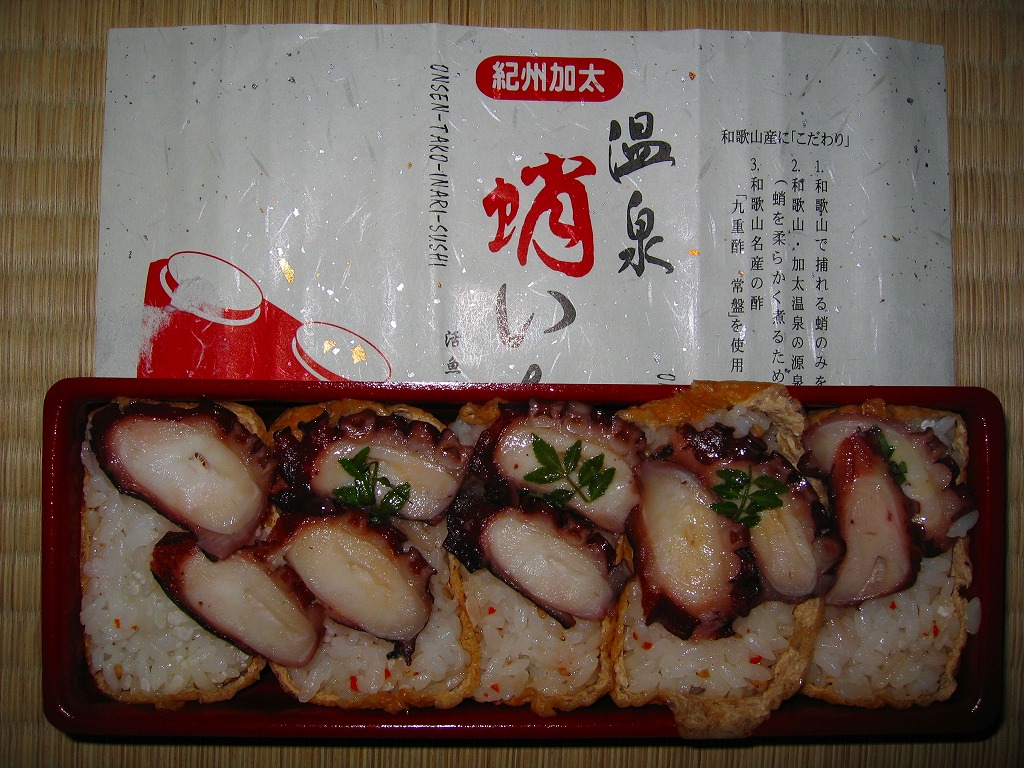 関西空港の国内線の搭乗待合室で買えたカツサンド。見た目は惣菜のカツサンドであるものの、商品名を賑やかに描いた専用のシールを貼っていた。3切れ入りカツサンドの味はとろーり。ヘルメスソースとは、大阪府大阪市の石見食品工業所が製造する瓶入りソース。生産量が少ない、ネット通販が始まる前は900ml入り12本単位で販売した、大阪で狭く深く愛されるなどの理由で、入手が難しいソースだという。 【関西国際空港】1994(平成6)年9月4日開港 大阪府泉佐野市泉州空港 http://www.kansai-airport.or.jp/ 紀州加太温泉蛸いなり(850円) 2006年9月8日に関西国際空港出発ロビー売店で購入