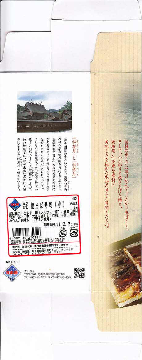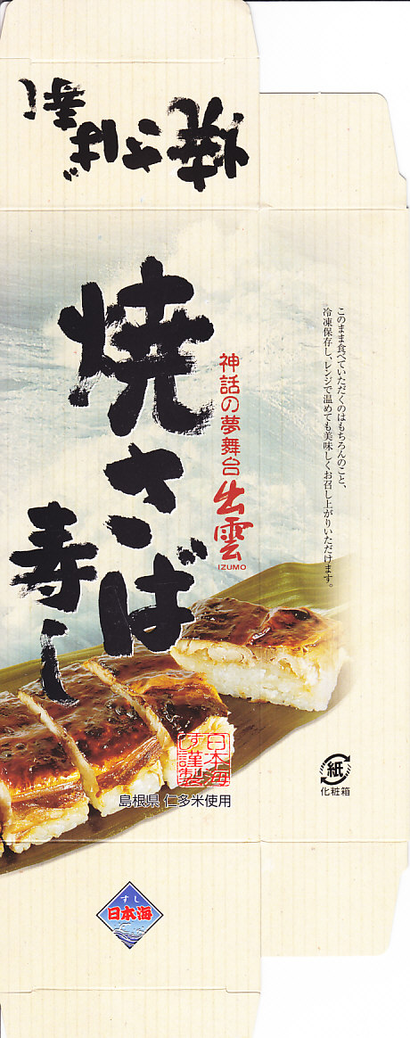 百貨店の駅弁催事で出雲空港の空弁として販売されていた焼サバ棒寿司。島根県産の仁多米を使ったという棒状の酢飯に焼サバを合わせ、ラップに包んで竹皮に包み、透明な袋で密封し醤油と甘酢生姜と割りばしとおしぼりを添え、中身の写真と商品の名前を描いたボール紙のパッケージに収めるもの。 空弁の定番タイプであり、味も個性も出ないが、棒寿司の形状がかなり平べったいため、食感としてはユニーク。しかし出雲空港では本当に空弁が売られているのだろうか。現地ではJR米子駅弁の「吾左衛門鮓」シリーズとJALUXの「みち子」シリーズしか発見できていない。 【出雲空港】1966年6月30日開港 島根県出雲市斐川町沖洲 http://www.izumo-airport.co.jp/ 【株式会社日本海】島根県出雲市高岡町398番地 連絡先の記載なし http://www.sushi-nihonkai.co.jp/ 【有限会社海星】埼玉県朝霞市栄町4−6−20−1F 0120-505-771 Copyright (C) 2006-2022 まっこうくじら |