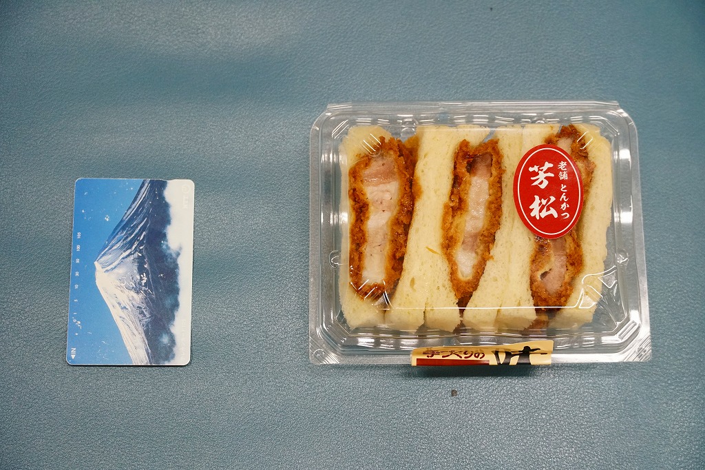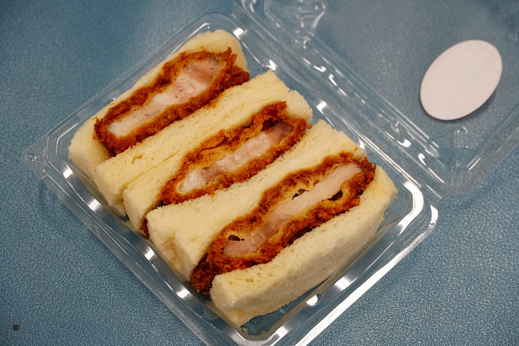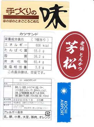 2016年7月に発売。「高知県いの町で25年営業している老舗とんかつ店が、土佐あかうしを得意のカツサンドにして新発売」がキャッチフレーズ。牛肉の薄切りを重ねて揚げたカツを、ソースに浸けて耳あり食パンに挟み、プラ容器に3切れを詰める。1,620円というお値段にびっくりしたが、これが2016年の高知県産業振興推進部「高知家のうまいもの大賞2017」で「土産物・ギフト部門大賞」に選ばれたり、食堂や空港で親しまれたりする。 【高知空港】1944(昭和19)年完成または1960年4月開港 高知県南国市物部 http://www.kochiap.co.jp/ 【とんかつ芳松】高知県吾川郡いの町枝川703−1 連絡先の記載なし 老舗とんかつ芳松(ロースカツサンド)(780円) 2020年8月16日に高知空港の旅客ターミナルビルの売店で購入