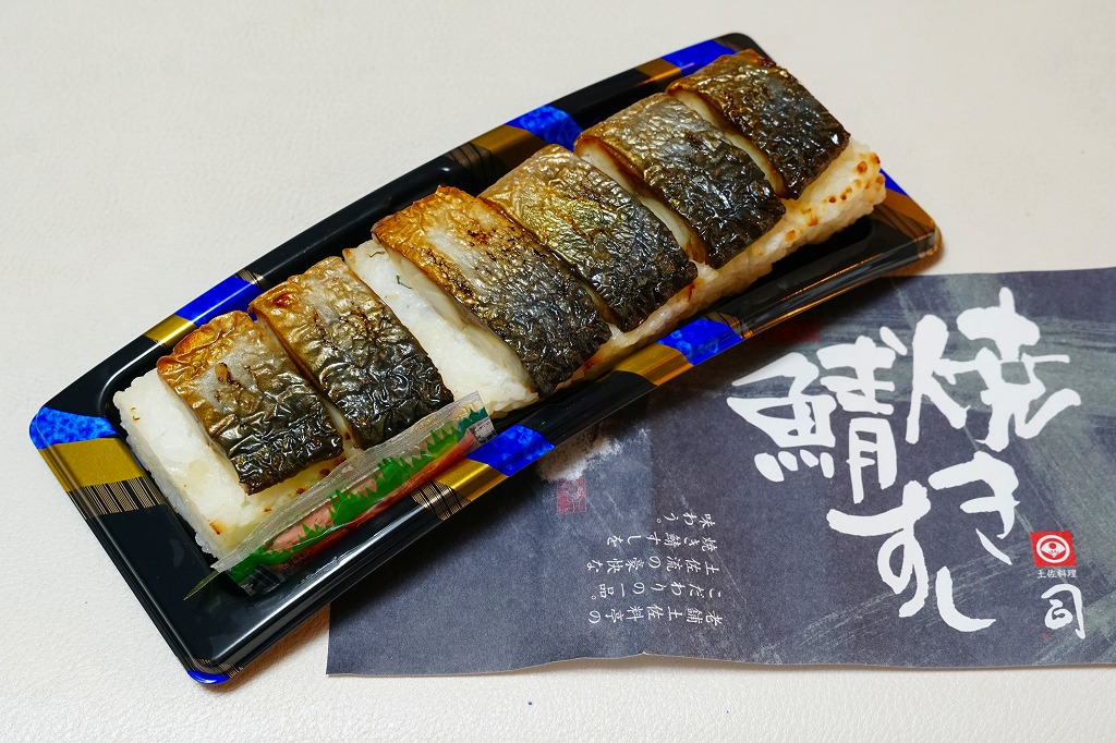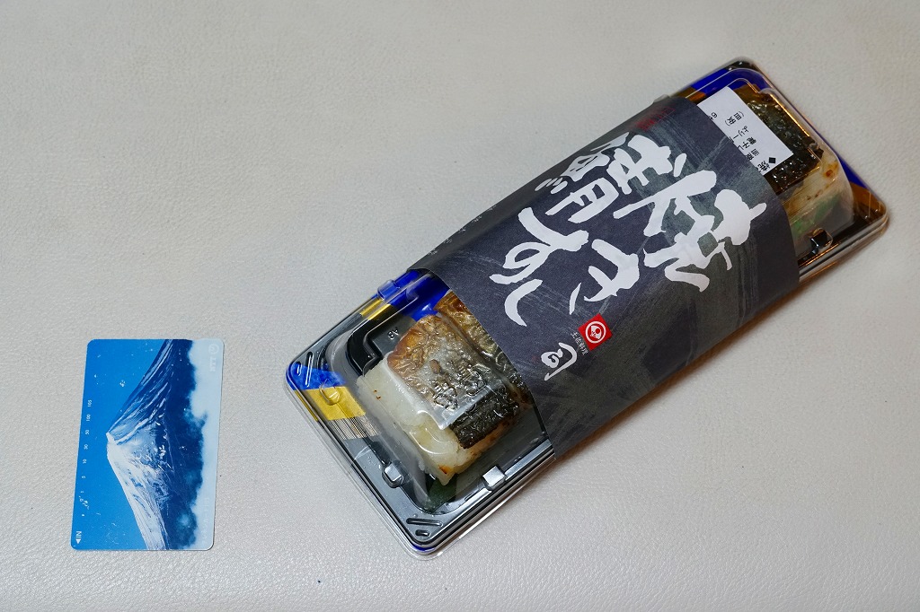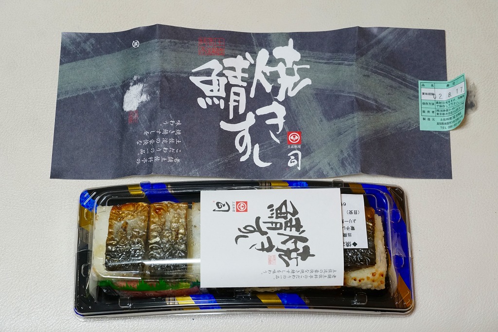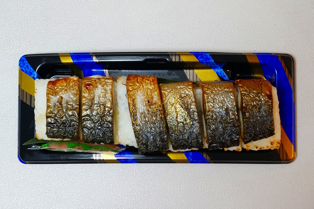 高知県吾川郡いの町の高知県運転免許センター付近にある、人気のとんかつ専門店のカツサンド。ロースカツのソース漬けを耳なし食パンで挟んだ、小さなカツサンドが3切れ、透明なプラ容器に収まる。多量に混じる白い脂肪分の、適度な弾力感が響く。 【高知空港】1944(昭和19)年完成または1960年4月開港 高知県南国市物部 http://www.kochiap.co.jp/ 【とんかつ芳松】高知県吾川郡いの町枝川703−1 連絡先の記載なし 焼き鯖すし(1,000円) 2020年8月16日に高知空港の旅客ターミナルビルの食堂で購入