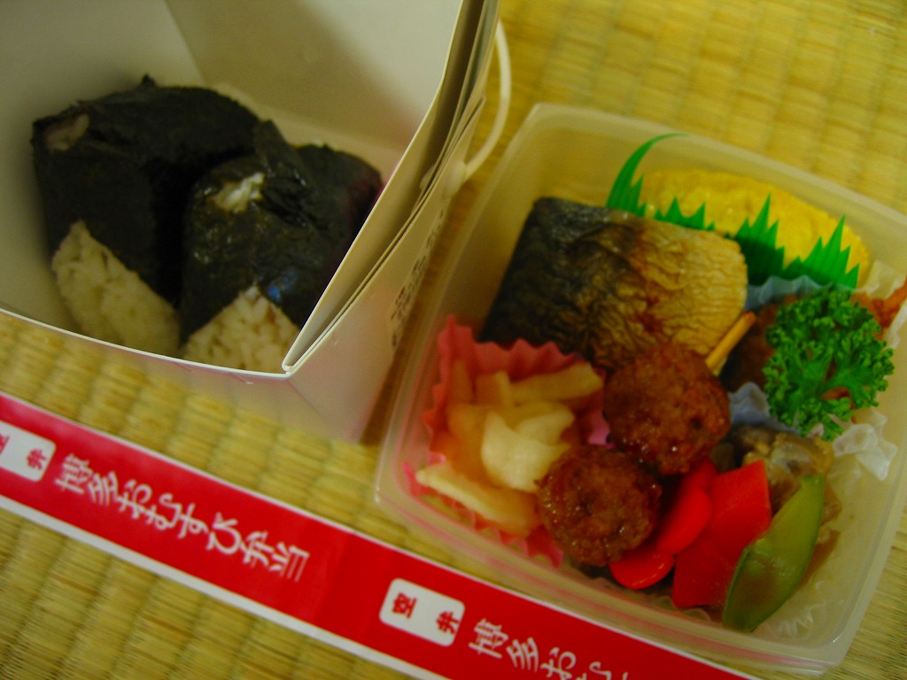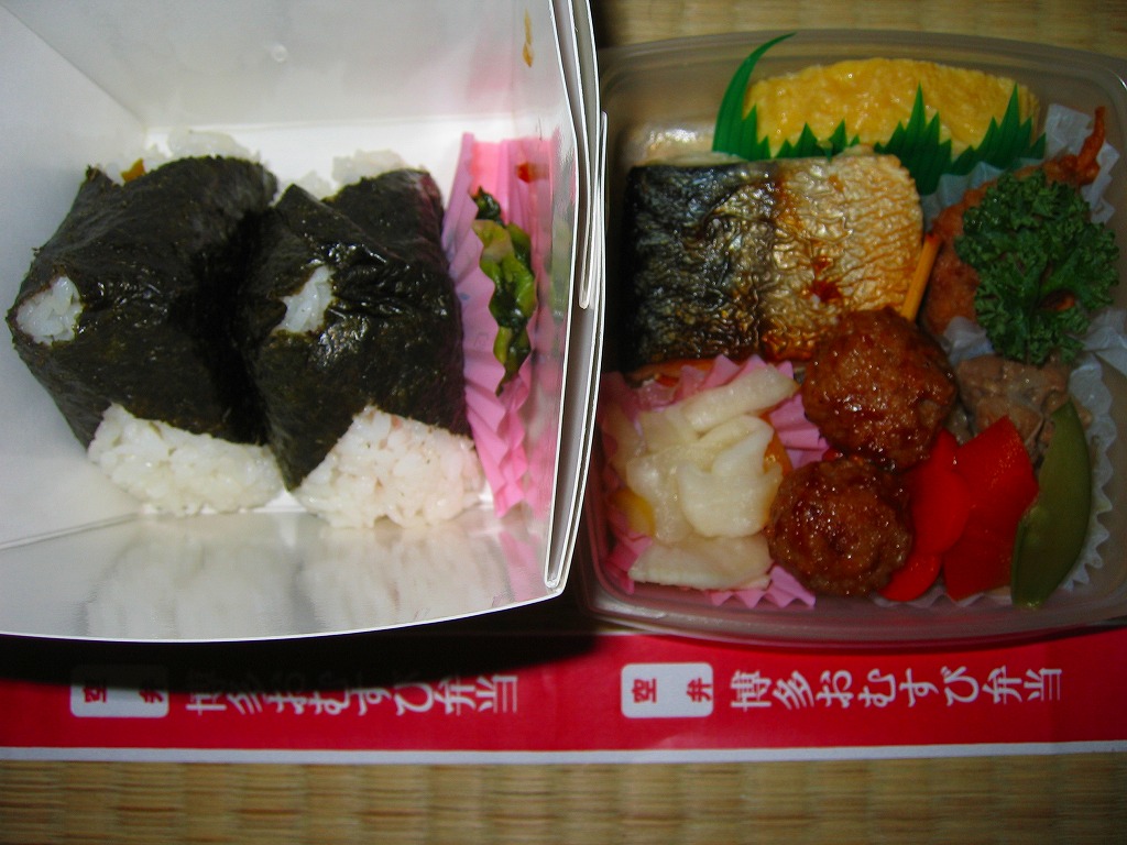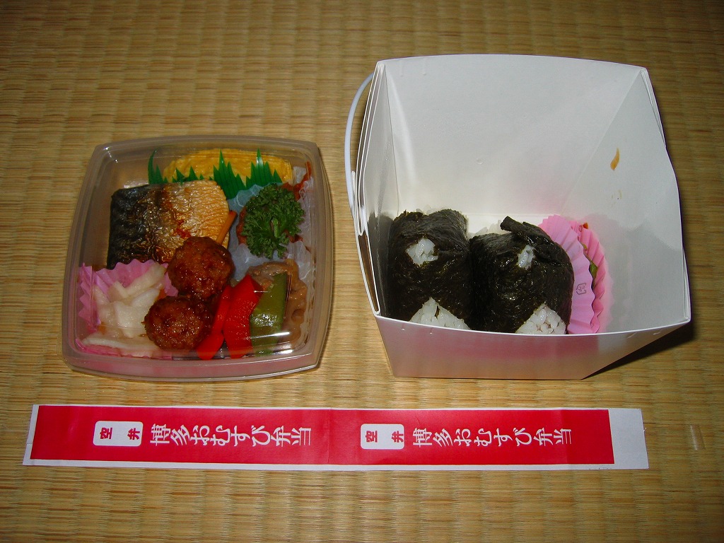 福岡県内の食品業者の通販対応な土産物の棒寿司が、空弁ブームに乗って福岡空港の空弁を名乗るようになったもの。量を持て余す棒寿司にしては珍しくひとり分に丁度良い分量の、鮭フレークを敷いて高菜の漬物を貼り付けた棒寿司が、密封されて割箸や通販チラシと共に竹皮に包まれ掛紙ごと縛られる。 高菜は福岡や熊本の食卓に欠かせない野菜。漬物にしたりこれを焼いたりして、そのまま食べたり御飯に混ぜたりして使う。他の地域では南紀で「めはりずし」に使っているくらいしか見ないと思う。 【福岡空港】1972(昭和47)年4月開港 福岡県福岡市博多区大字下臼井778番地の1 http://www.fuk-ab.co.jp/ 【有限会社清広食品】福岡県粕谷郡須恵町上須恵989−5 092(932)8588 博多おむすび弁当(735円) 2009年2月15日に福岡空港第2ターミナルビル搭乗待合室で購入