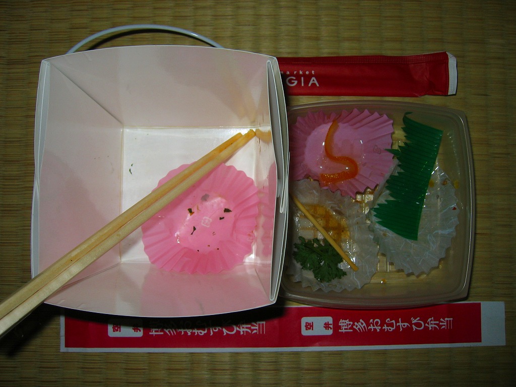 福岡空港の搭乗エリアの売店で購入した、博多の江戸前うなぎ料理屋さんのお弁当。複雑に折り込まれた金色のボール紙を容器とする。中身は椎茸・ごぼう・鰻などが巻かれた太巻。福岡市の中心部まで地下鉄で2〜4駅と抜群の利便性で多くの旅客を集める空港なので駅弁のような空弁があるかと探したが、2002年12月現在で特にそれらしいものはなかった。2004年2月の訪問ではJALUXの売店に三種の弁当と五種の棒寿司が存在。 福岡空港は1972年4月の開港だそうだが、これは運輸大臣(当時)が設置管理する第二種空港として供用が開始された年月で、1951年10月から羽田〜伊丹〜板付の定期便が飛んでいたので、この年月が事実上の開港日か。1944年に日本陸軍が着工した席田(むしろだ)飛行場が、敗戦の後に米軍に接収され板付飛行場となったもの。 【福岡空港】1972(昭和47)年4月開港 福岡県福岡市博多区大字下臼井778番地の1 http://www.fuk-ab.co.jp/ 【博多川扇】福岡県福岡市博多区博多駅東3丁目3−3 092(471)6114 Copyright (C) 2006-2022 まっこうくじら |