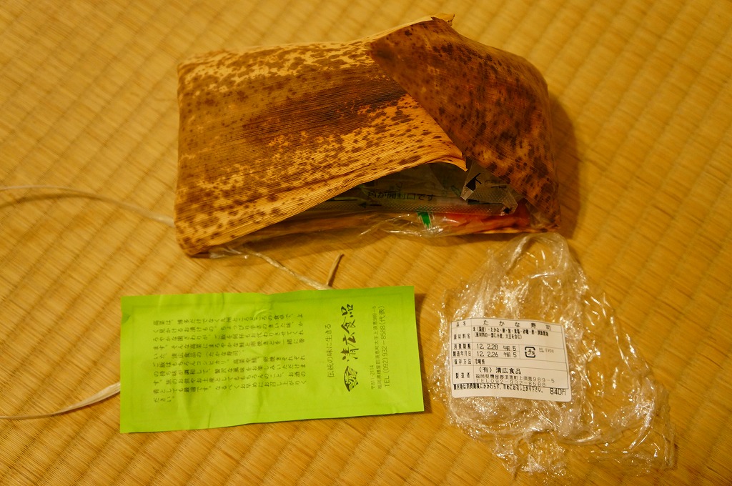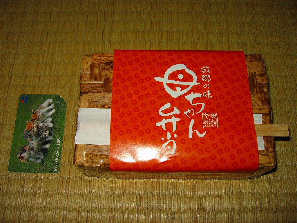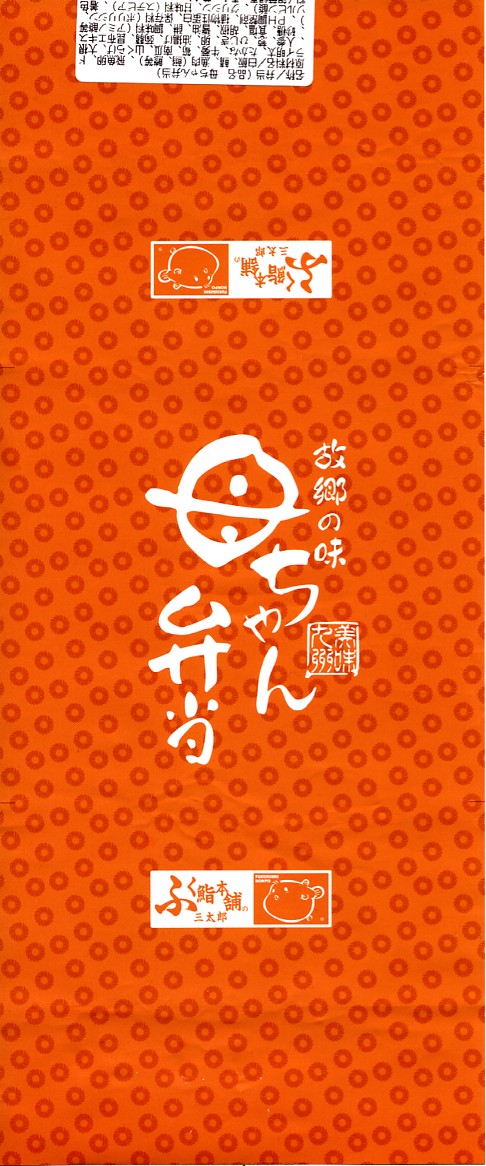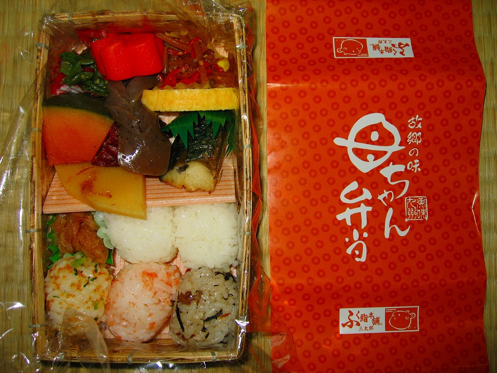 竹皮を編んだ長方形の容器に、中身写真と商品名と博多弁などを印刷した掛紙を巻き、ゴムで留めてラップで包む。透明なトレーに詰める中身は、タケノコのおにぎりが2個に、里芋やこんにゃくなどの煮物、蒲鉾と玉子焼、栗に菜の花など。肉も魚もないヘルシーな、一方でおかずに困る内容。おにぎりの具は季節で変える模様。 2007年の4月か10月に登場したJR小倉駅の駅弁「驛舎竹籠辨當」と中身や容器が全く同じである。製造者が同じなので、共通の商品に掛紙だけ変えて空弁に持ってきたのだろう。しかし駅弁は800円、これは840円。その価格差はどこから出てきたのだろうか。 【福岡空港】1972(昭和47)年4月開港 福岡県福岡市博多区大字下臼井778番地の1 http://www.fuk-ab.co.jp/ 【北九州駅弁当株式会社】福岡県北九州市小倉北区下富野3−11−6 093(531)0036 故郷の味 母ちゃん弁当(840円) 2008年3月30日に福岡空港第2ターミナルビル搭乗待合室で購入