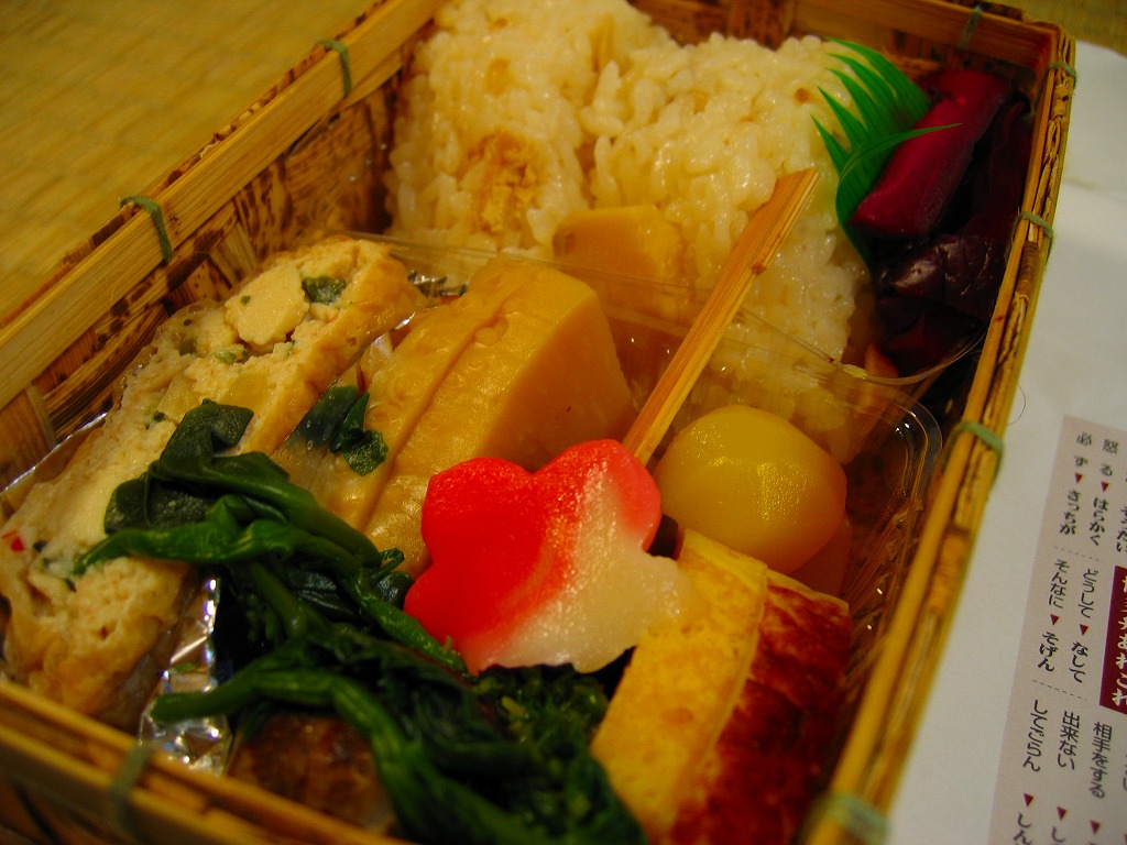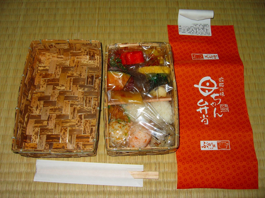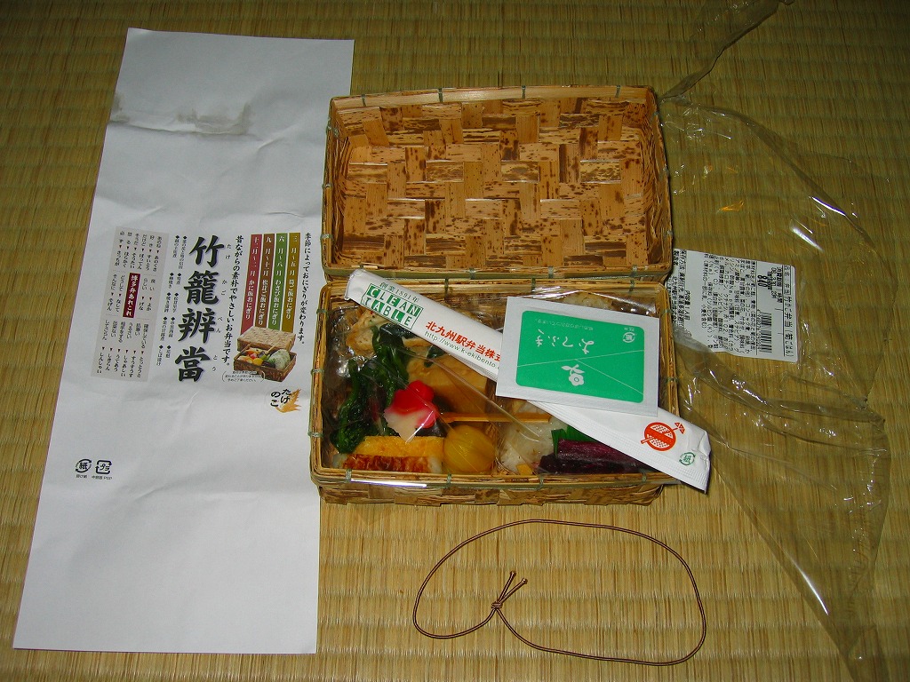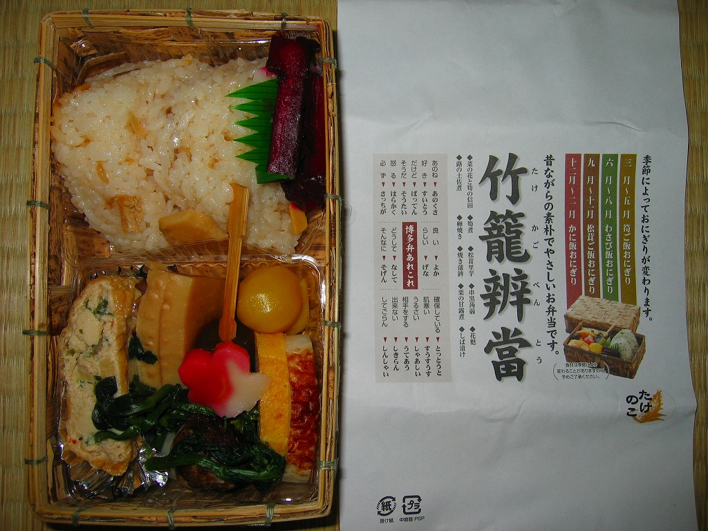 三角形の透明なプラ製ケースに、海苔を直に巻いたおにぎりが1個入る。明太子で有名な業者の名前が商品名に入り、そんな大きめなシールをわざわざ貼っていたから、どんな味なのかと思い購入したものの、中身は本当にただのツナマヨネーズおにぎり。コンビニで105円な内容に、期待はずれ。他の具が入るものも数種類、併売されていた。 【福岡空港】1972(昭和47)年4月開港 福岡県福岡市博多区大字下臼井778番地の1 http://www.fuk-ab.co.jp/ 【株式会社ヤマコウ】福岡県福岡市南区柳瀬2丁目9−14 092(575)1533 http://yamakou1986.com/ 竹籠辨當(840円) 2008年3月30日に福岡空港第2ターミナルビル搭乗待合室で購入