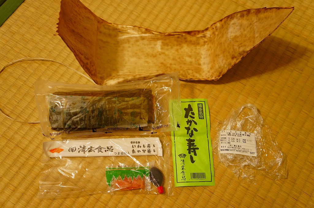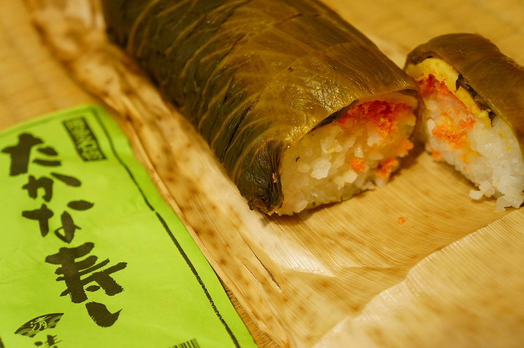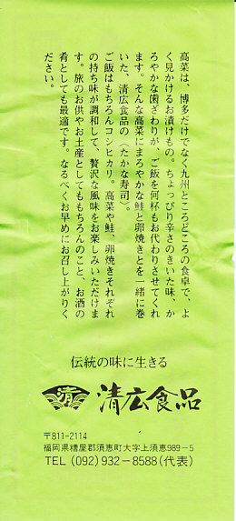2013年の発売か。弁当向け惣菜容器に福岡米「元気つくし」の白御飯を詰め、ブリ照焼、鶏つくね、タケノコやニンジンなどの煮物、高菜漬け、辛子明太子カップを添えるもの。スーパーやコンビニのお弁当に見られそうな普通の姿をしながら、中身に福岡がたくさん詰まる。JR博多駅での収穫報告も見られる。調製元は福岡市内の弁当宅配店。 「元気つくし」は、福岡県農業総合試験場で2009(平成21)年に誕生したイネの品種。福岡県や九州での主流であるヒノヒカリの弱点である高温登熱性に優れる、つまり夏が暑過ぎてもイネの種子つまりコメがよく発育・肥大・成熟してくれるうえで、収量や食味も良い品種として、今後の栽培の拡大が期待されている。 【福岡空港】1972(昭和47)年4月開港 福岡県福岡市博多区大字下臼井778番地の1 http://www.fuk-ab.co.jp/ 【株式会社マンジャ】福岡県福岡市中央区小笹1−22−25 092(531)9888 http://www.mangia.jp/ 博多名物たかな寿し(840円) 2012年2月26日に福岡空港搭乗待合室内売店で購入