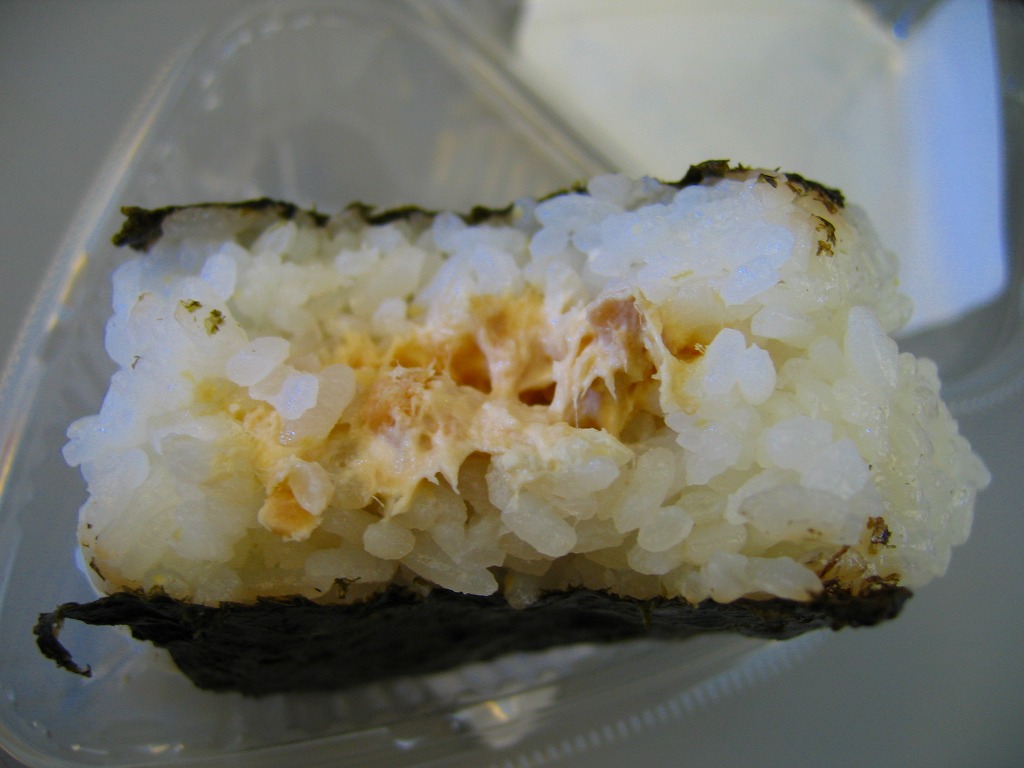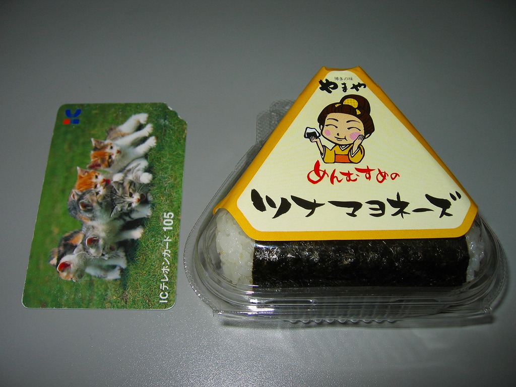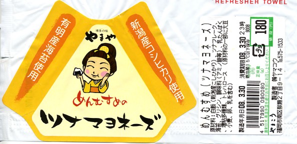 2009年の登場か。白いボール紙製の深い正方形容器に取っ手がついている。中身は辛子明太子と高菜のおにぎりが各1個、その上に透明なトレーで、焼サバ、鶏つくね、玉子焼、きんぴらごぼう、柚なますなどのおかずを重ねている。可もなく不可もない、幕の内タイプのお弁当。おにぎりの具でとりあえず九州っぽさは出ているが。 今回の訪問では夕刻という時間帯が悪かったのか、以前あれほど賑わっていた空弁販売がうそのように静か。惣菜を売るすべての売店に「空弁」の文字はあったものの、棒寿司は消え、販売ケースは小さく、品揃えもミニコンビニ程度で、九州や福岡・博多の個性を伝えるような商品に乏しかった。 【福岡空港】1972(昭和47)年4月開港 福岡県福岡市博多区大字下臼井778番地の1 http://www.fuk-ab.co.jp/ 【株式会社ヤマコウ】福岡県福岡市南区柳瀬2丁目9−14 092(575)1533 http://yamakou1986.com/ めんむすめのツナマヨネーズ(180円) 2008年3月30日に福岡空港第2ターミナルビル搭乗待合室で購入