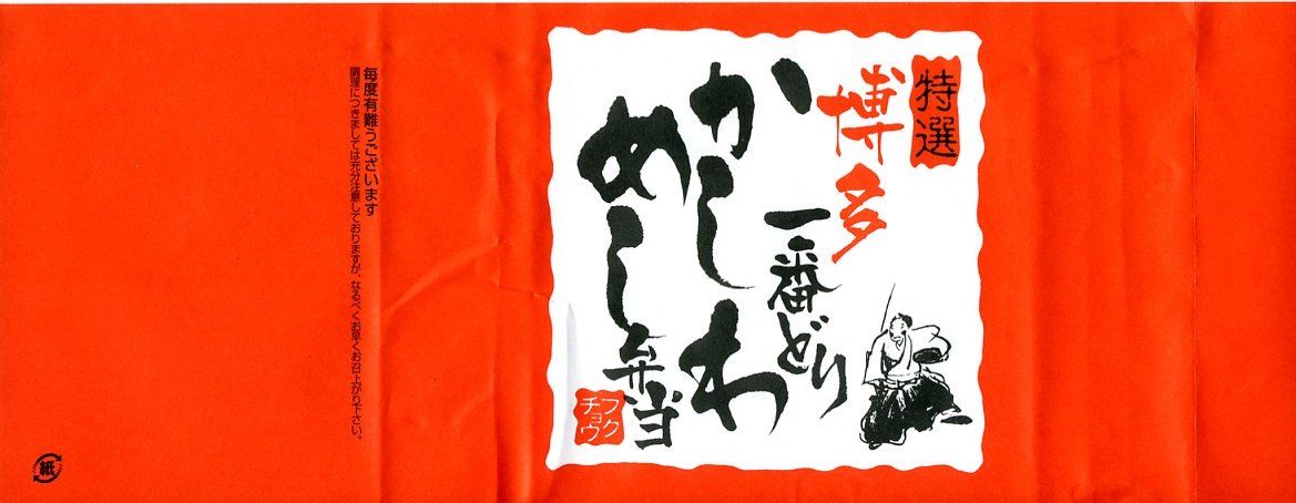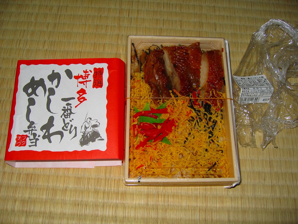 2005年3月31日登場。小さなボール紙箱に窓を開けて、丸々としたプラ製トレーに入る中身が見えるようにしている。中身は一口サイズに収まらない、焼鶏ときんぴらのおいなりさん。ややゲテモノに聞こえて、しかし具と飯はかなり合う、食べ辛さと味が意外に抜群な軽食群。ケーキ感覚で食べるイナリ寿司なんだとか。パッケージの空弁マークや空港名の表示は、現地販売版にはなかった。 【福岡空港】1972(昭和47)年4月開港 福岡県福岡市博多区大字下臼井778番地の1 http://www.fuk-ab.co.jp/ 【株式会社ドゥイットナウ仕出し工房事業部】福岡県福岡市西区福重3丁目33−28 092(882)3305 http://www.santaro.co.jp/doitnow/ 特選博多一番どりかしわめし弁当(450円) 2005年9月12日に福岡空港第1ターミナル搭乗待合室内売店で購入