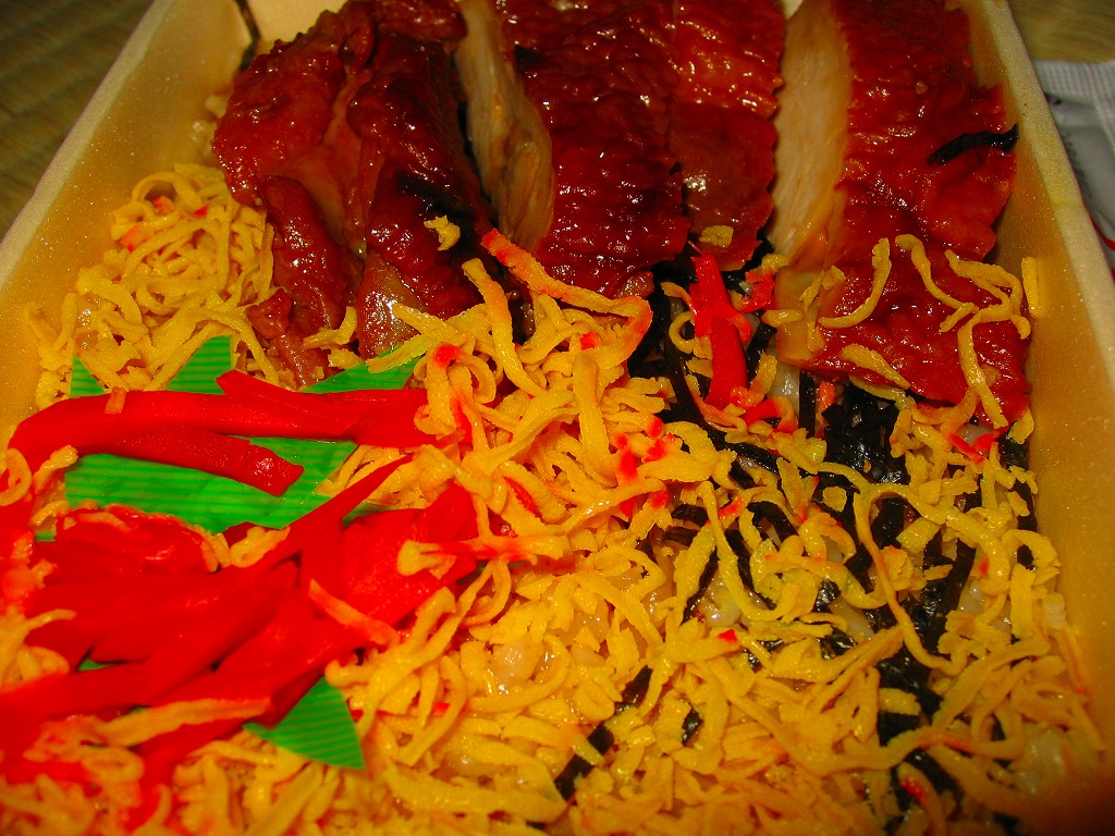 惣菜弁当用な透明フタの長方形発泡材容器をゴムで留めて掛紙を巻く。中身は鳥御飯の上に錦糸卵を敷き鳥照焼を貼る、駅弁で言えばかしわめしというより鳥めし。 価格が示すとおり、いわば掛紙付きコンビニ弁当で、品質や風味もそれなりだが、こんな空弁が存在すること自体が、福岡空弁の多様性の現れかと。なお、調製元は博多駅弁も出している。 【福岡空港】1972(昭和47)年4月開港 福岡県福岡市博多区大字下臼井778番地の1 http://www.fuk-ab.co.jp/ 【株式会社フクチョウ】福岡県福岡市博多区上牟田1−29−28 092(431)5134 牛めし(1,000円) 2005年9月12日に福岡空港第1ターミナル搭乗待合室内売店で購入