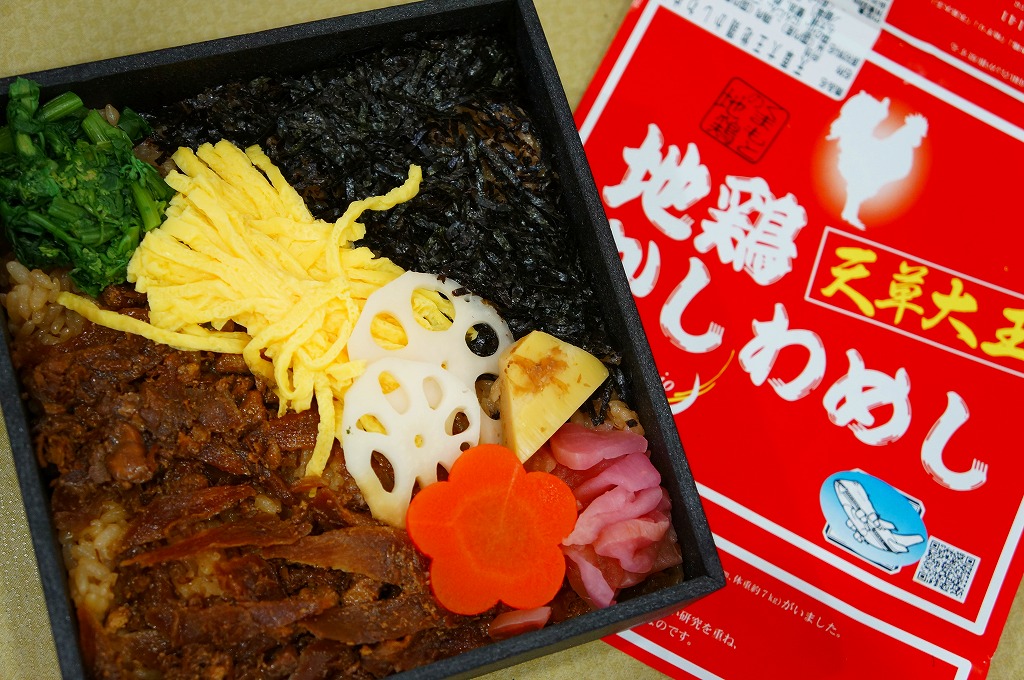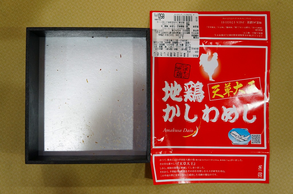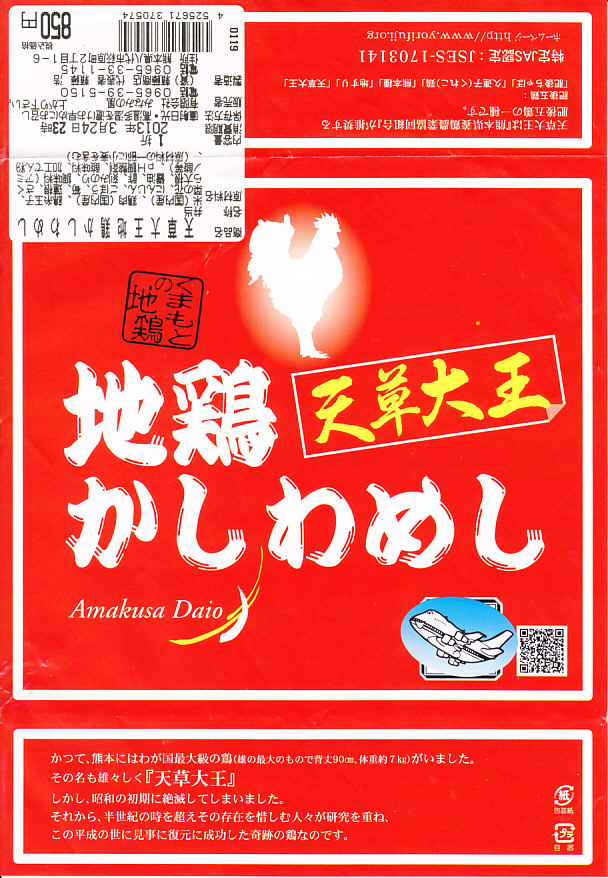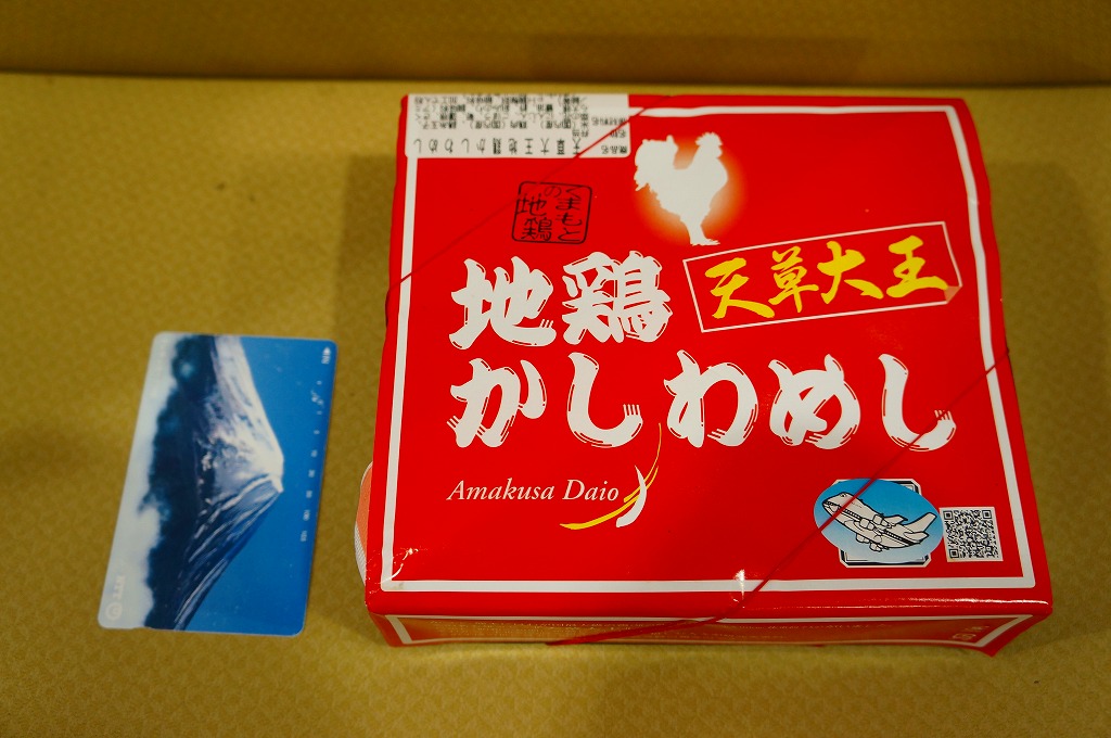 2017年頃の発売か。売店の壁に「九州一周味めぐり弁当」「おにぎり弁当」「贅沢和牛弁当」「ひとくち巡り弁当」とこの「和牛丼」を紹介する大きなポスターが貼られていた。調製元はJR博多駅に駅弁を卸す業者で、これらは駅弁と共通の商品と考えられる。コンビニ弁当タイプのふたが透明なプラ容器に、商品名の帯を巻いた外観。中身は白飯、牛肉、ピクルス2本、はじかみという超シンプル。佐賀米と九州産黒毛和牛と九州醤油を使うと帯にあるが、牛肉がガチガチに固いC級グルメだった。味や香りは良いのだが。 【福岡空港】1972(昭和47)年4月開港 福岡県福岡市博多区大字下臼井778番地の1 http://www.fuk-ab.co.jp/ 【株式会社 グルメトラベラー】福岡県福岡市中央区草香江1−8−19 092(724)3008 http://www.gourmet-traveler.co/ 天草大王地鶏かしわめし(850円) 2013年3月24日に福岡空港ターミナルビルANAFESTAで購入
