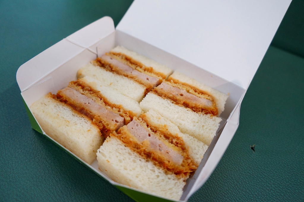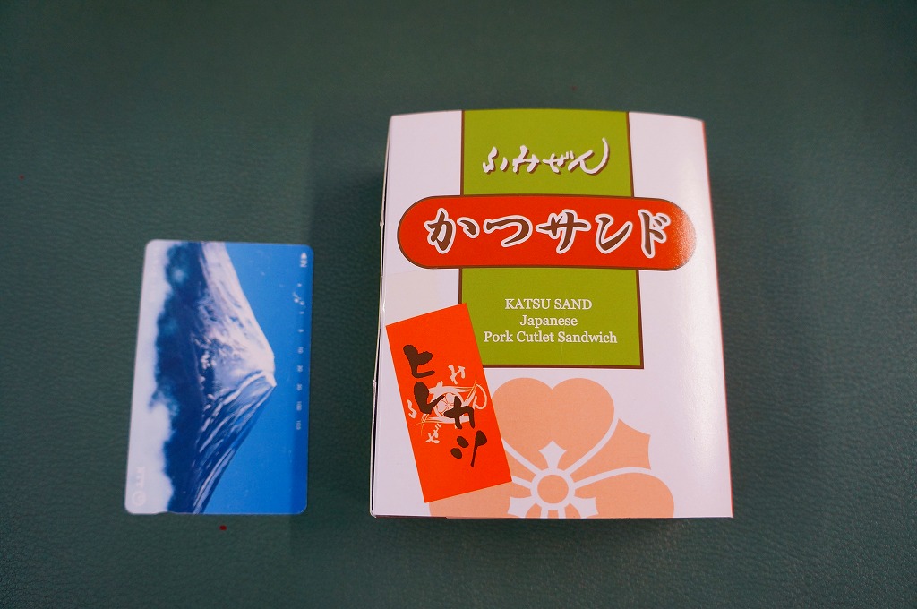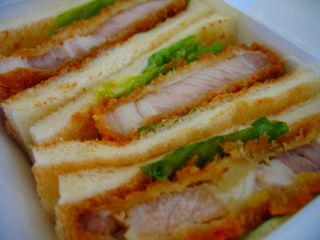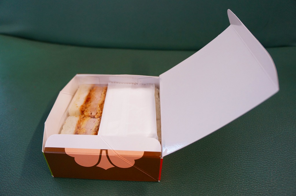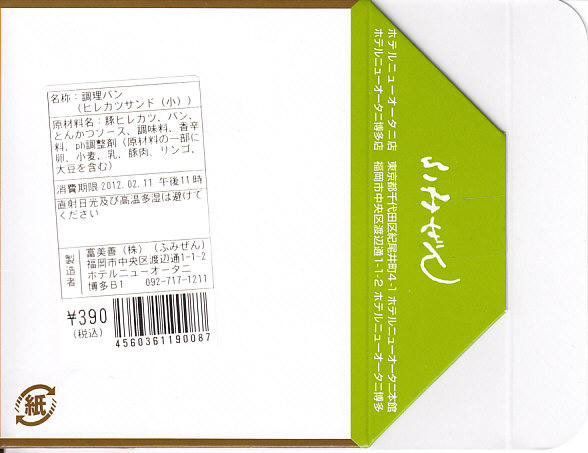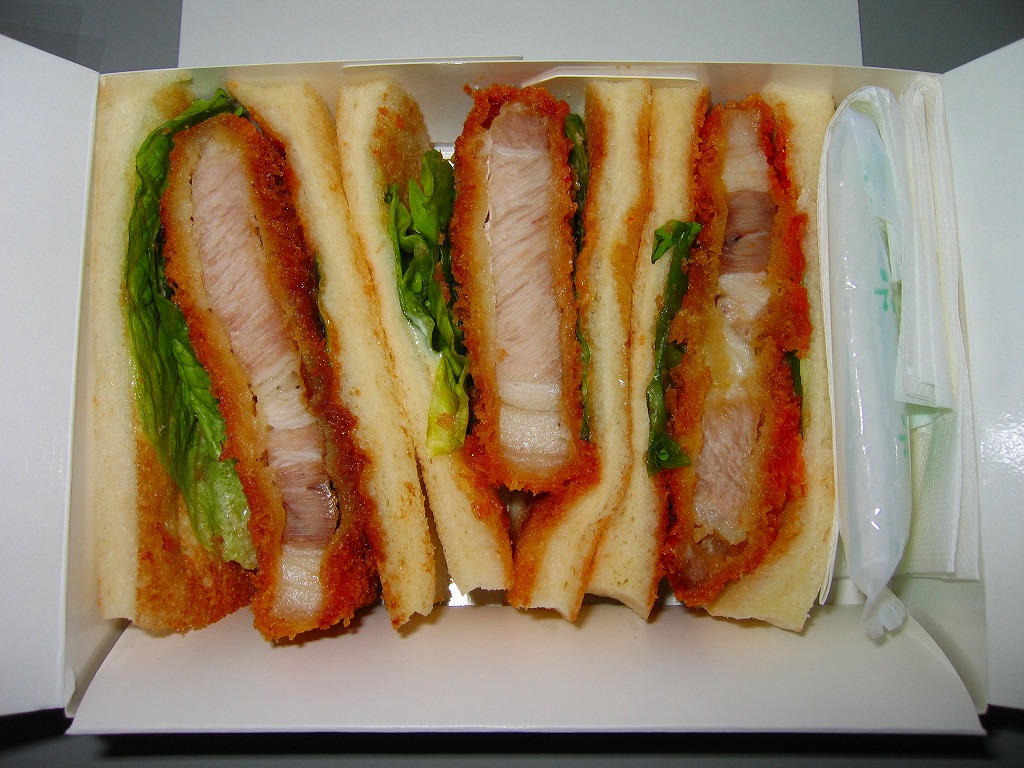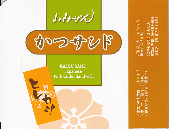 小柄で黒い折箱に鶏飯を詰め、黒く煮た鶏肉、線状の玉子焼、刻み海苔でストライプを描き、菜の花やレンコンや大根桜漬などを添える。北部九州名物のかしわ飯のようで、なんとなくそう見えないのは、調製元が熊本県の駅弁屋だから。熊本の空弁「天草大王」とだいたい同じものであり、「新八代駅の駅弁」と同じようなもの。駅弁マークがB747らしき飛行機のシールの下に隠れている。 【福岡空港】1972(昭和47)年4月開港 福岡県福岡市博多区大字下臼井778番地の1 http://www.fuk-ab.co.jp/ 【有限会社みなみの風】所在地の記載なし 0965(39)5150 【合資会社頼藤商店】熊本県八代市萩原町2丁目1−6 0965(33)1145 http://www.yorifuji.org/ ふみぜんかつサンド(390円) 2012年2月11日に福岡空港ターミナルビルANAFESTAで購入