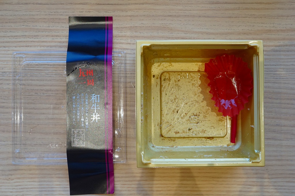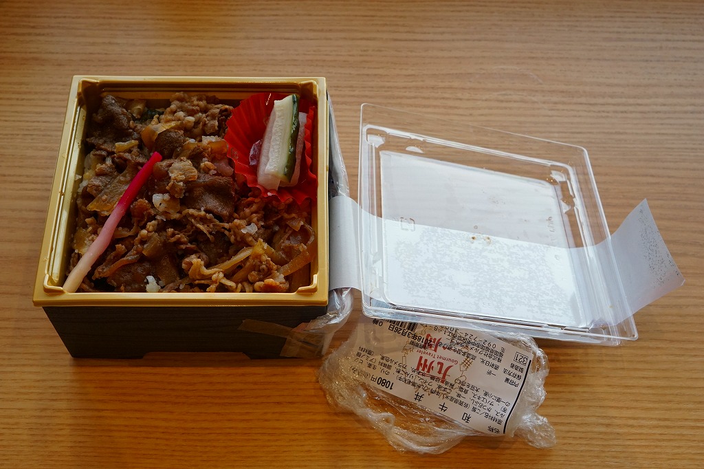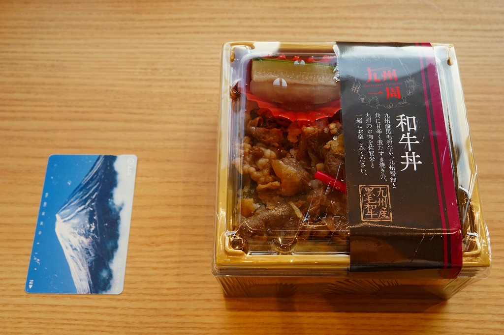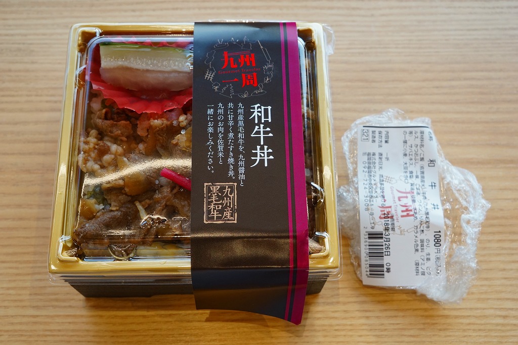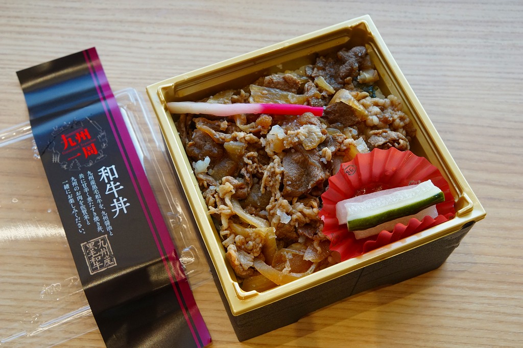 辛子明太子の製造販売で知られるやまやコミュニケーションズと、アニメなどのキャラクターグッズを販売するウララキューブが、2020(令和2)年4月下旬からの販売を発表した、テレビアニメ「キングダム」のキャラクター弁当シリーズのひとつ。「やまや飛信の膳」と「やまや中華統一の膳」を羽田空港と東京駅と新横浜駅で、「やまや巫舞の膳」を新大阪駅で、この「やまや怪鳥の膳」を福岡空港と博多駅で販売した。 直方体に固まる明太子飯を、鴨肉ステーキと明太子とつくねと海苔で覆い、いかしゅうまいと胡麻団子を添える。中国の春秋戦国時代を舞台にした、集英社の漫画雑誌「週刊ヤングジャンプ」での連載作品「キングダム」に登場する、秦の六大将軍の一人「王騎」が怪鳥の異名を持つことにちなんだのだろう。海苔で描く鳥が細い線でつくられていて、作るのが大変そうだと思った。 公式発表によると、新型コロナウイルス感染拡大を防止するための緊急事態宣言を受け、発売日を7月3日に延期、さらに新型コロナウイルス感染症の影響により、他県への移動が難しいことなどから、9月30日をもって販売終了。政府の新型コロナウイルス感染症対策で、新幹線駅や空港の利用者が激減したとはいえ、高額な弁当であり、4種類とも売店の見た目では、あまり売れていなかったのではないかと思う。 【福岡空港】1972(昭和47)年4月開港 福岡県福岡市博多区大字下臼井778番地の1 http://www.fuk-ab.co.jp/ 【株式会社 玄天】福岡県福岡市東区松島4丁目1−15 連絡先の記載なし 和牛丼(1,080円) 2018年3月25日に福岡空港ターミナルビル搭乗待合室の売店で購入