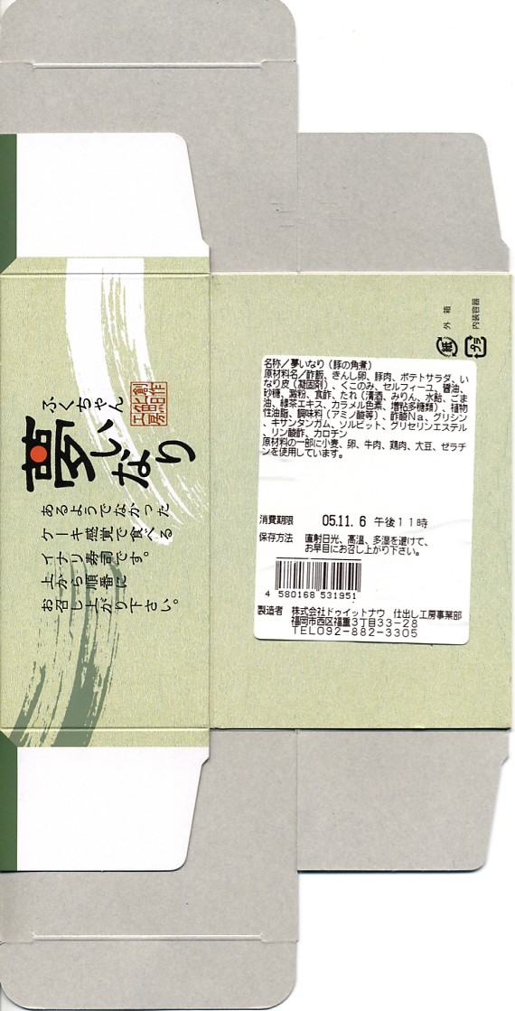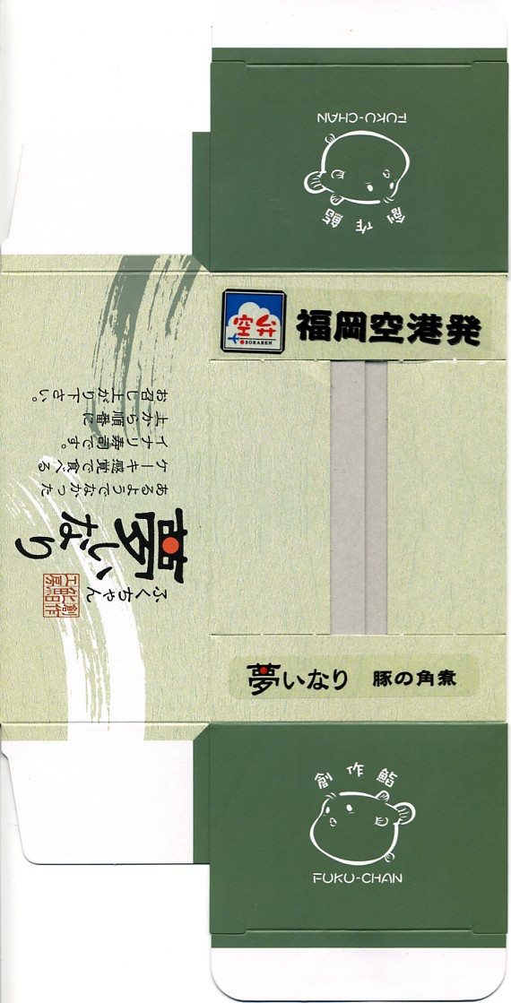 豚のシルエットを描く白い紙箱の中にカツサンドが3切れ。豚肉は糸島豚を使ったというがブランド豚らしくない固さと硬さがあり、ソースをマスタード・カクテル(?)・みそと1切れずつ使い分けたというが風味の差は感じられず。こう考えると800円は高い。カツサンドは羽田に限る。 【福岡空港】1972(昭和47)年4月開港 福岡県福岡市博多区大字下臼井778番地の1 http://www.fuk-ab.co.jp/ 【株式会社福岡サンパレス】福岡県福岡市博多区築港本町2−1 092(272)1123 http://www.f-sunpalace.com/ ふくちゃん夢いなり 豚の角煮(350円) 2006年11月6日に京急ストア日の出町店駅弁大会で購入
