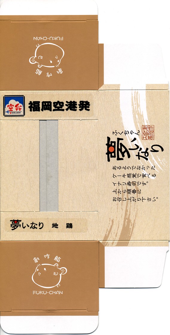 2005年3月31日登場。小さなボール紙箱に窓を開けて、丸々としたプラ製トレーに入る中身が見えるようにしている。中身は一口サイズに収まらない、豚角煮とポテトサラダのおいなりさん。ゲテモノに聞こえて、しかし具と飯はかなり合う、食べ辛さと味が意外に抜群な軽食群。ケーキ感覚で食べるイナリ寿司なんだとか。パッケージの空弁マークや空港名の表示は、現地販売版にはなかった。 【福岡空港】1972(昭和47)年4月開港 福岡県福岡市博多区大字下臼井778番地の1 http://www.fuk-ab.co.jp/ 【株式会社ドゥイットナウ仕出し工房事業部】福岡県福岡市西区福重3丁目33−28 092(882)3305 ふくちゃん夢いなり 地鶏(350円) 2006年11月6日に京急ストア日の出町店駅弁大会で購入