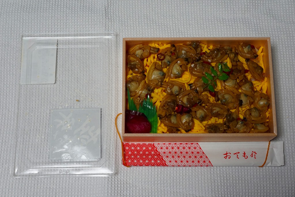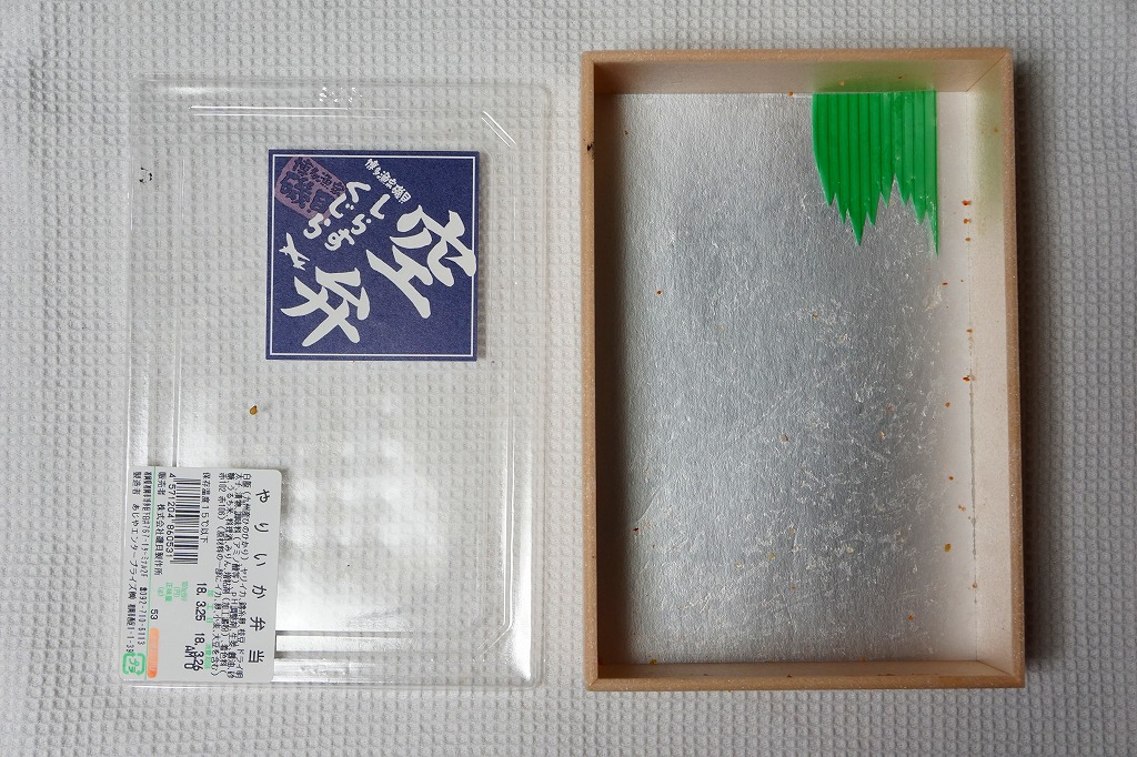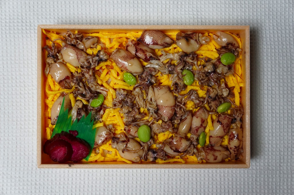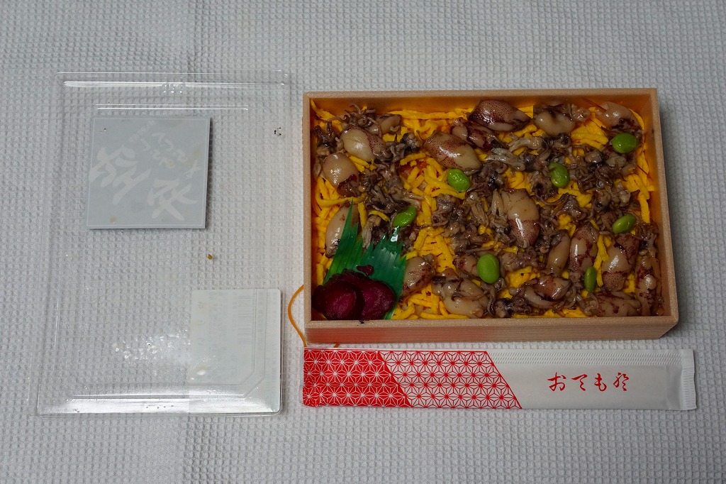 福岡空港の搭乗待合室で2017年11月にオープンした居酒屋チェーン店の店頭で売られていた「空弁」のひとつ。惣菜向けプラ容器の透明なふたに、全商品で共通の空弁シールを貼っていた。食品表示ラベルでの品名が「漁り弁当」。白飯を浅く敷き、太めの錦糸卵で覆い、アサリ煮を散らし、柴漬けなどを添えるもの。シンプルで、アサリがプリプリして、みずみずしく、手軽でなかなか美味な海鮮弁当。 【福岡空港】1972(昭和47)年4月開港 福岡県福岡市博多区大字下臼井778番地の1 http://www.fuk-ab.co.jp/ 【株式会社 磯貝製作所】福岡県福岡市博多区下白井757−1ターミナル2F 092(710)6113 https://www.hakata-isogai.net/ 【あじやエンタープライズ 株式会社】福岡県福岡市西区1−1−39 連絡先の記載なし やりいか弁当(950円) 2018年3月25日に福岡空港ターミナルビル搭乗待合室の食堂で購入