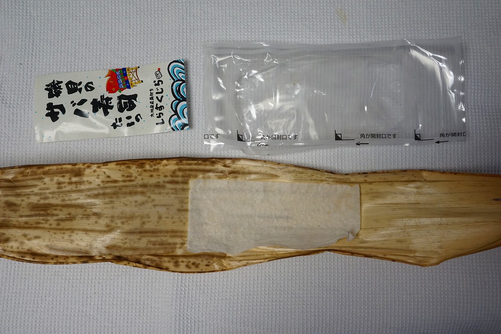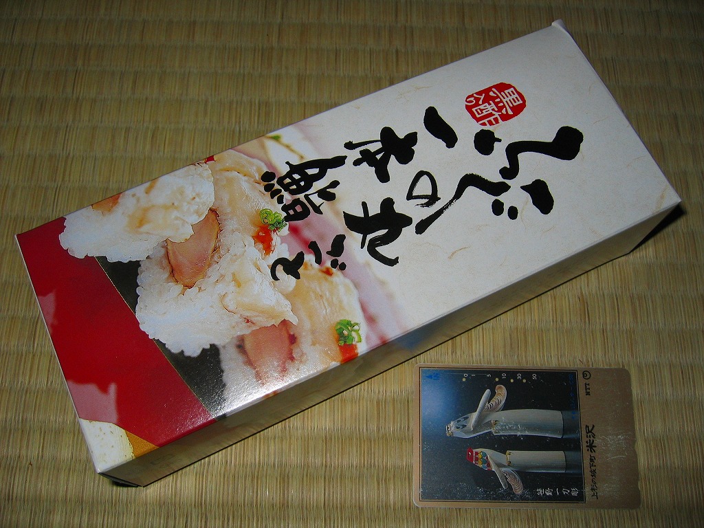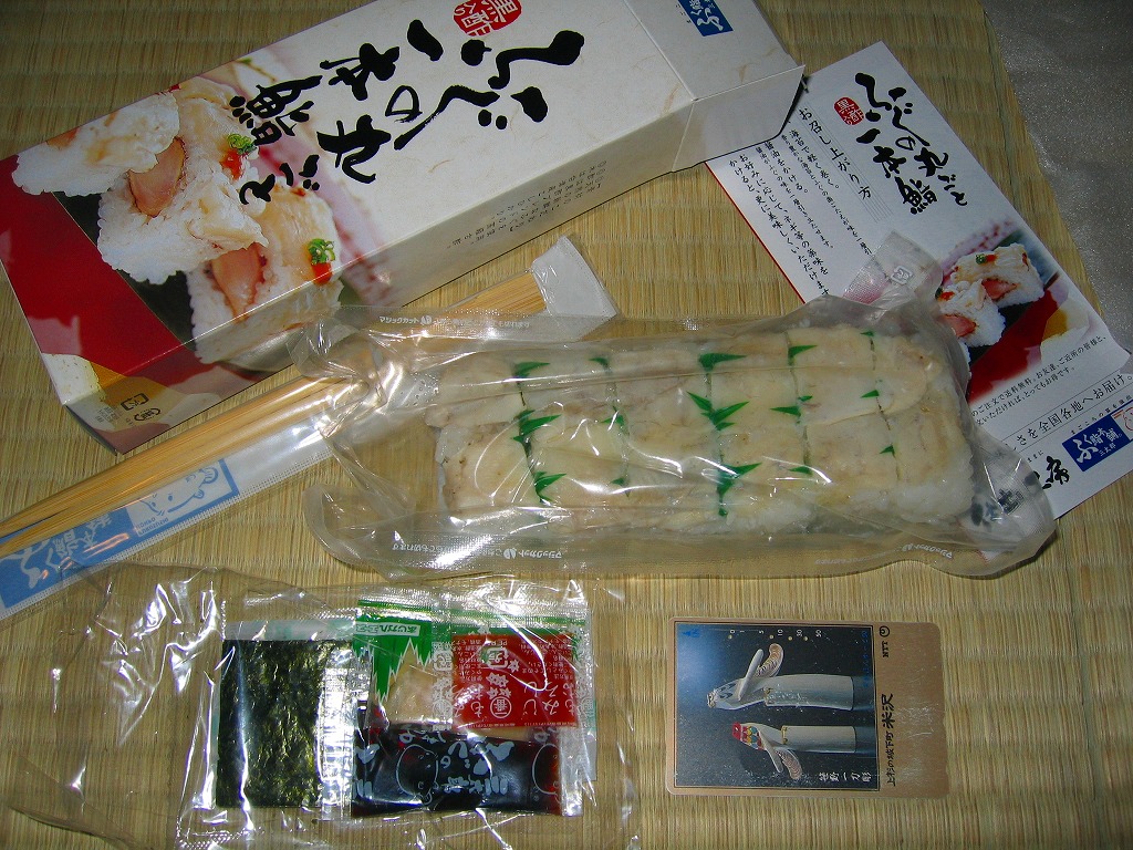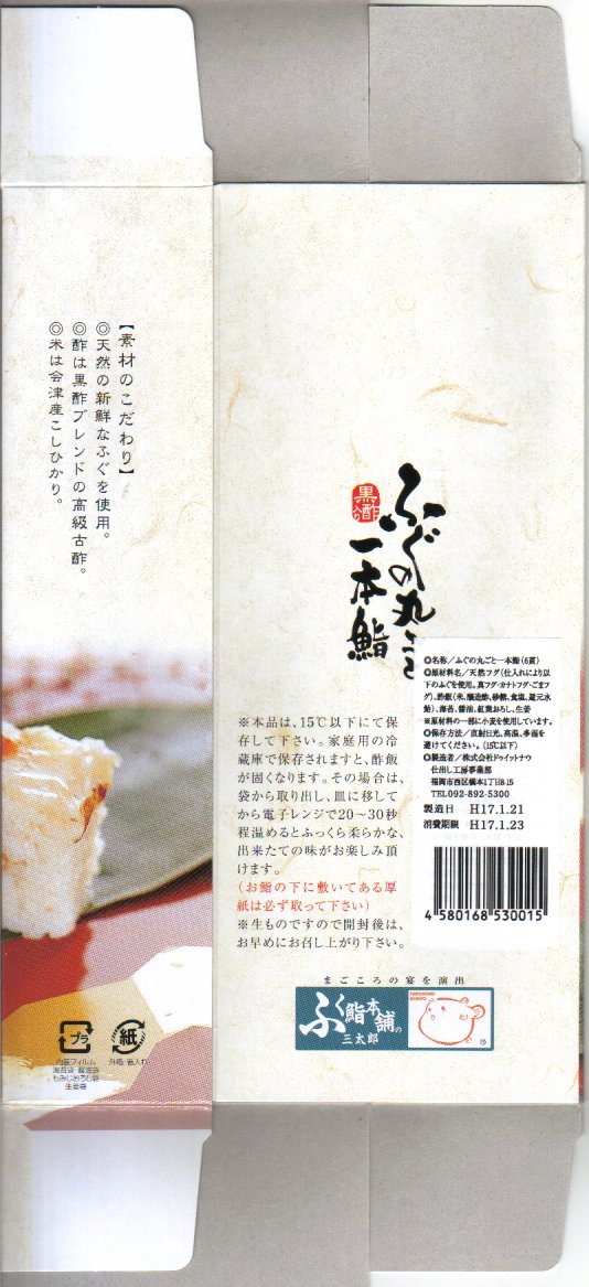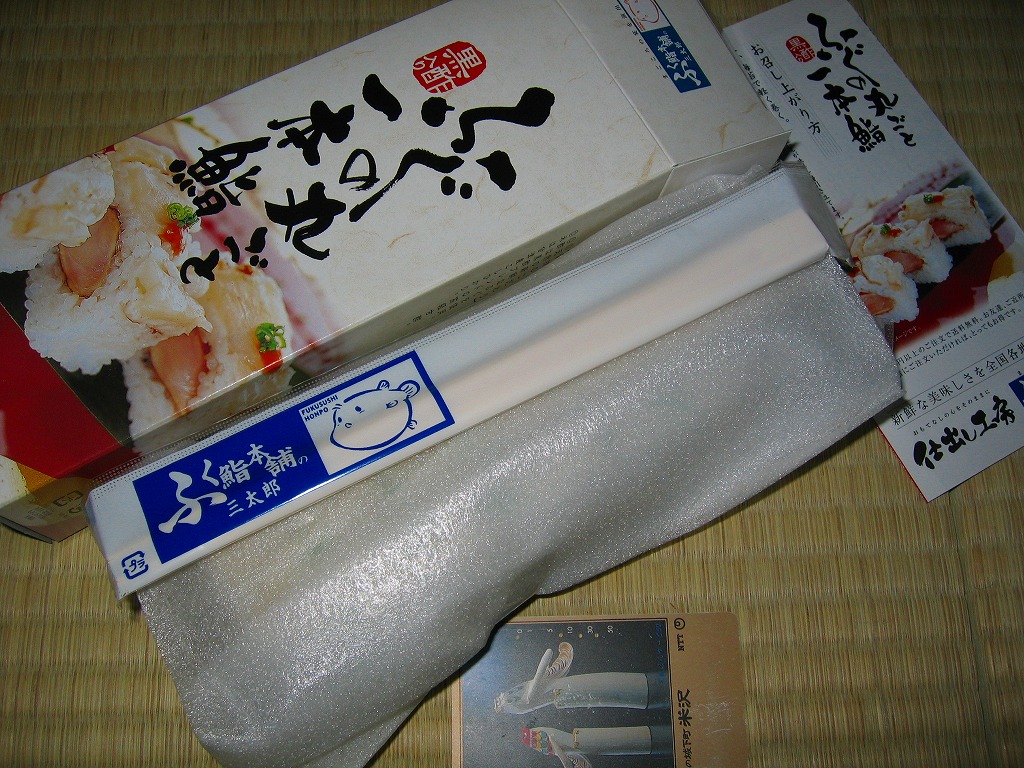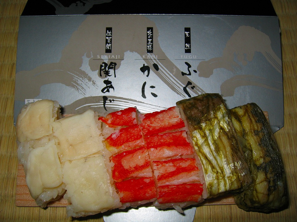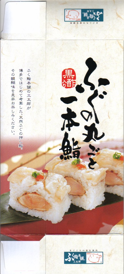ふく鮨本舗の三太郎の空弁の最高峰。銀色というかプラチナ色の紙箱の中に、ふぐ・かに・関あじのばってらが、わずか2センチ幅各2個ずつ、密封パックで入る。甘いカニが美味く、出荷証明も付ける関あじは高価なのだろうが、この分量と風味で千五百円では、たぶんリピーターは付かないと思う。うまく宣伝して離陸できるかどうか。 【福岡空港】1972(昭和47)年4月開港 福岡県福岡市博多区大字下臼井778番地の1 http://www.fuk-ab.co.jp/ 【ふく鮨本舗の三太郎(株式会社ドゥイットナウ)】福岡県福岡市西区橋本1丁目8−15 092(892)5300 ふぐの丸ごと一本鮨(1,500円) 2005年1月23日に京王百貨店駅弁大会で購入