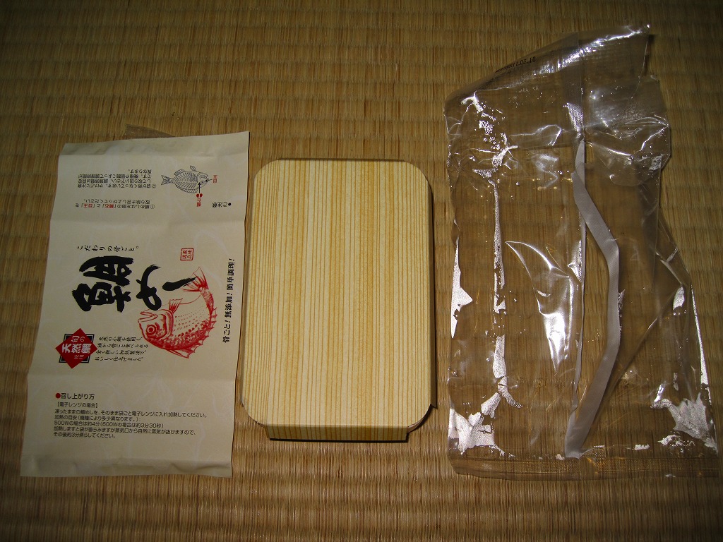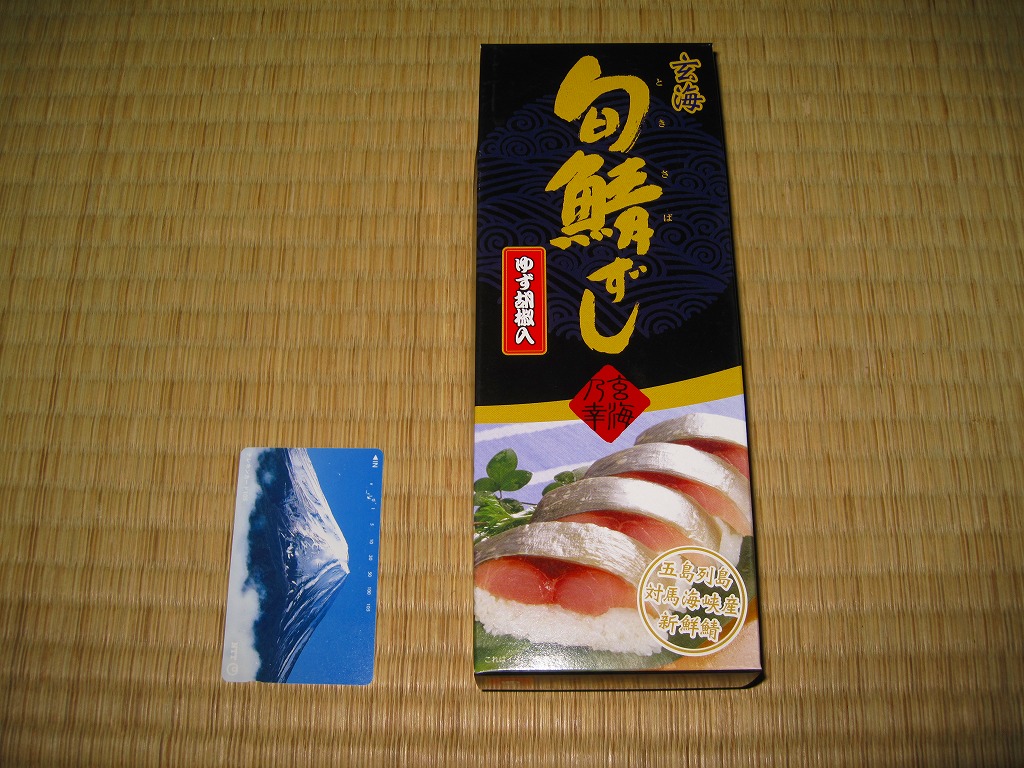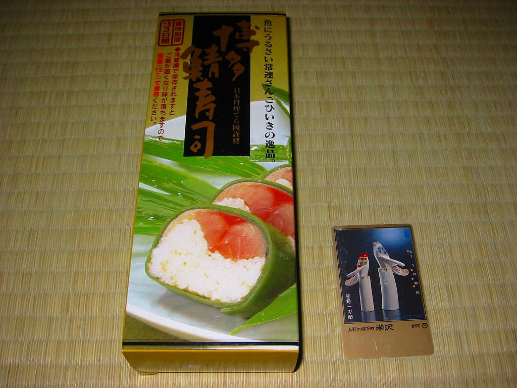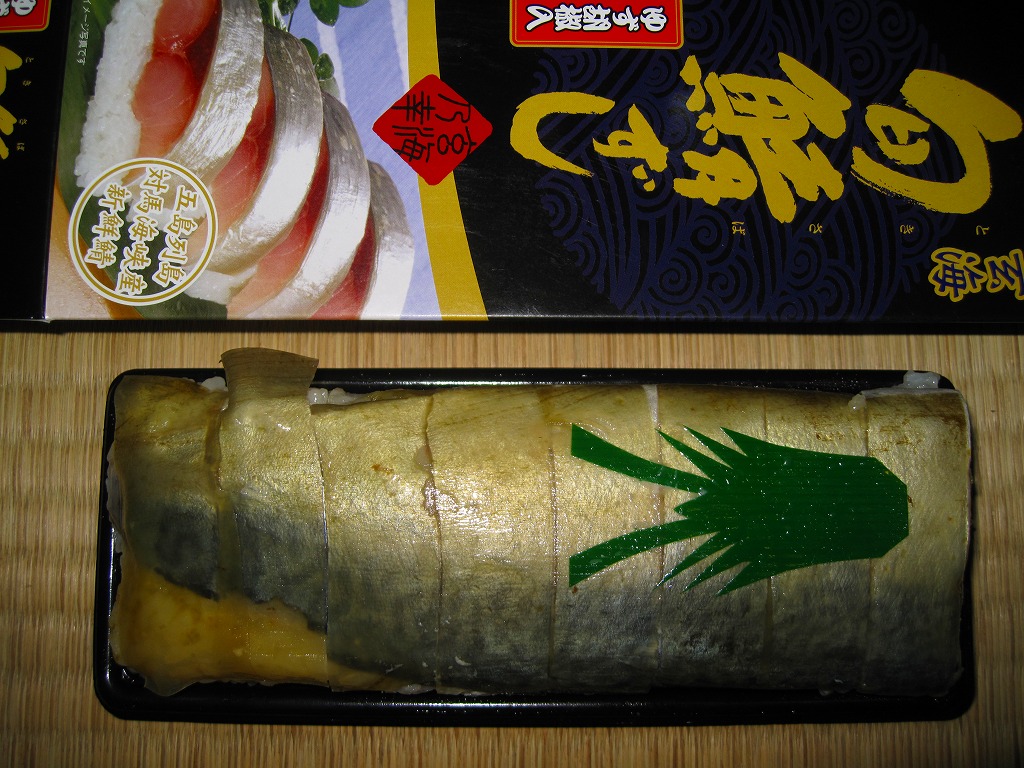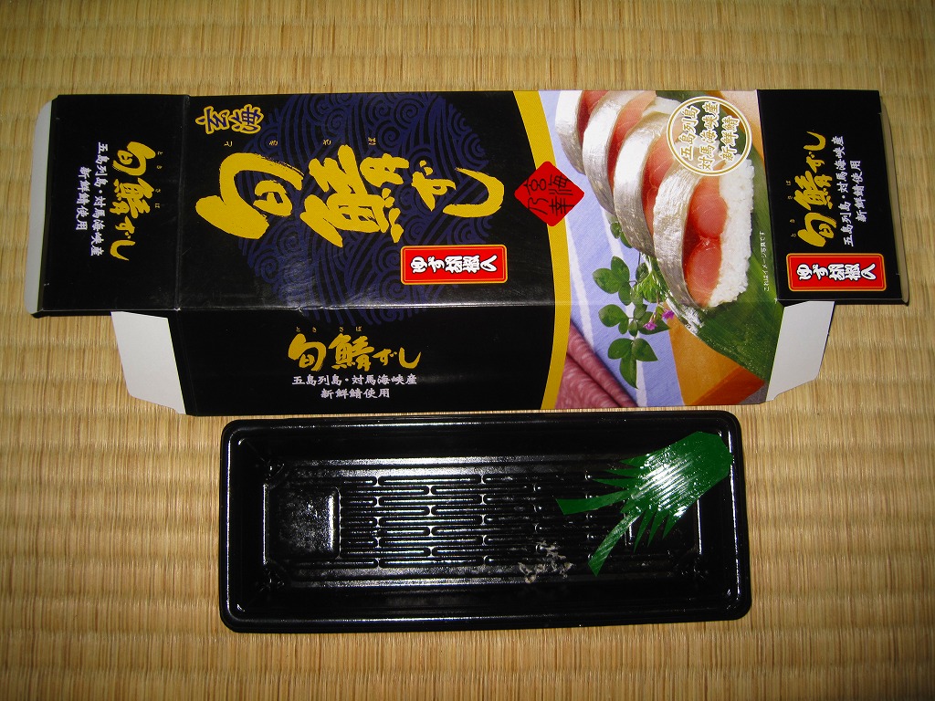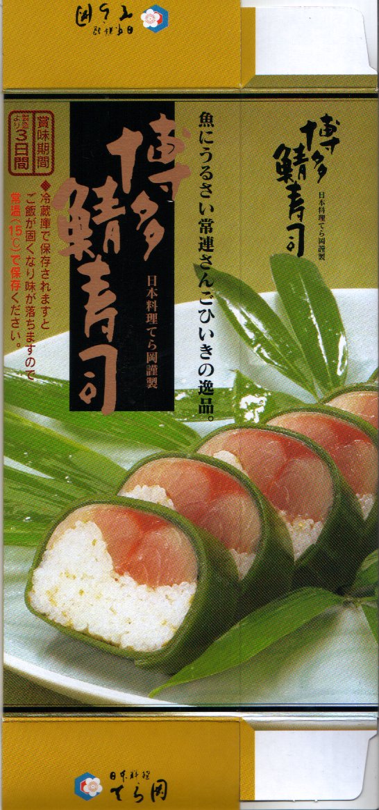 2009年までには福岡空港のJALUXで登場か。弁当がまるごと冷凍された状態で販売される土産物。小さな長方形の木製容器に、木目柄のボール紙でふたをして、商品名や宣伝文や注意書きを書いた掛紙を巻き、まるごと透明な袋で密封する。中身は炊込飯の上にタイ塩焼がまるごと載るもの。飯も身もダシが効いている感じで、宣伝のとおり確かに尾頭丸ごと食べられた。 【福岡空港】1972(昭和47)年4月開港 福岡県福岡市博多区大字下臼井778番地の1 http://www.fuk-ab.co.jp/ 【日本鮮食株式会社YO】福岡県糸島市二丈深江2142番地3 092(325)1278 http://www.nihon-sensyoku.co.jp/ 玄海旬鯖ずし(1,500円) 2011年3月21日に福岡空港ターミナルビルJALUXで購入