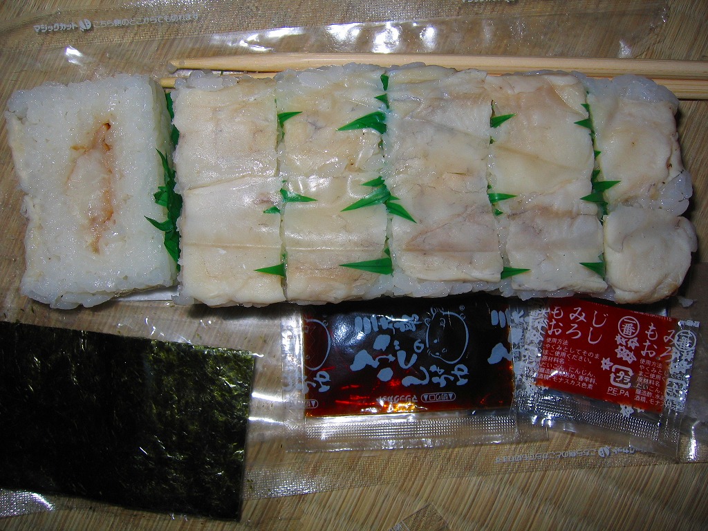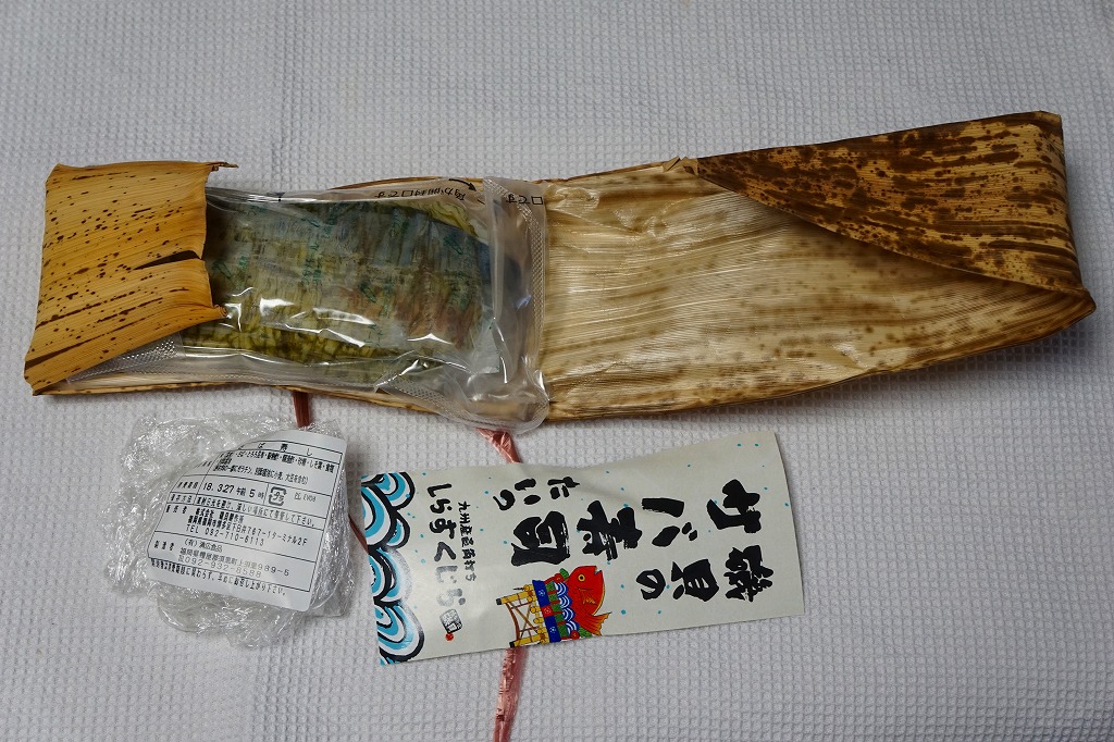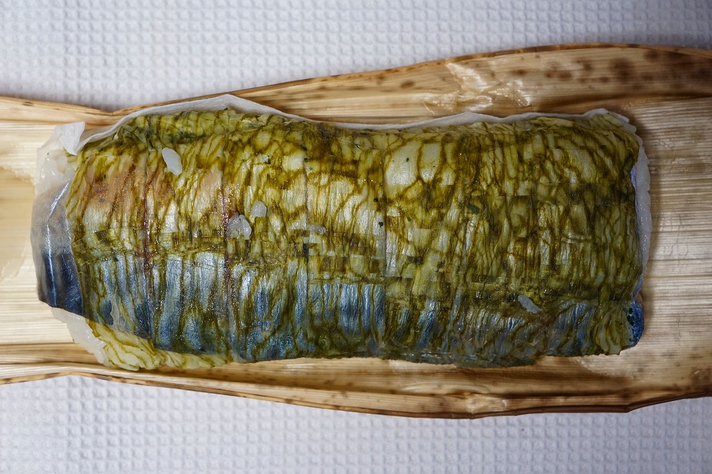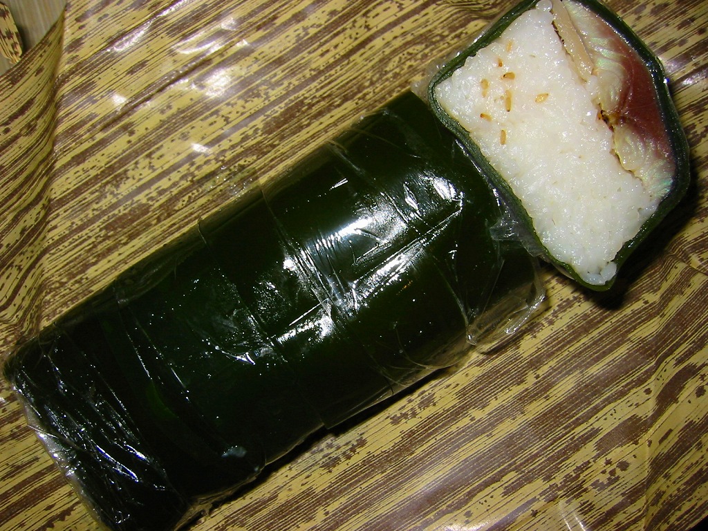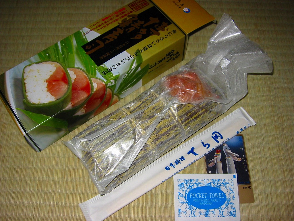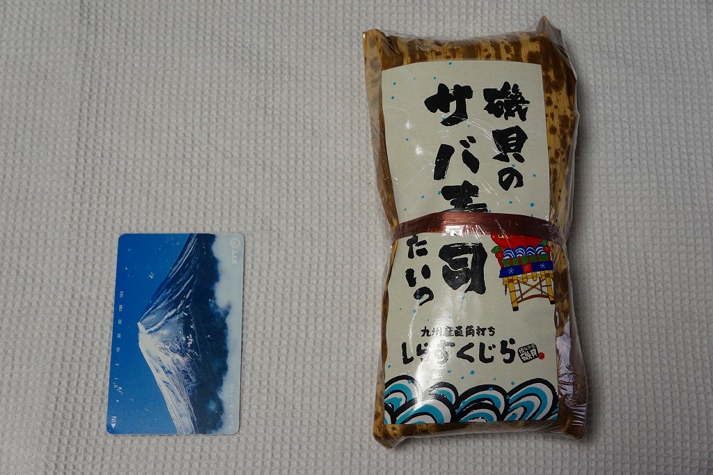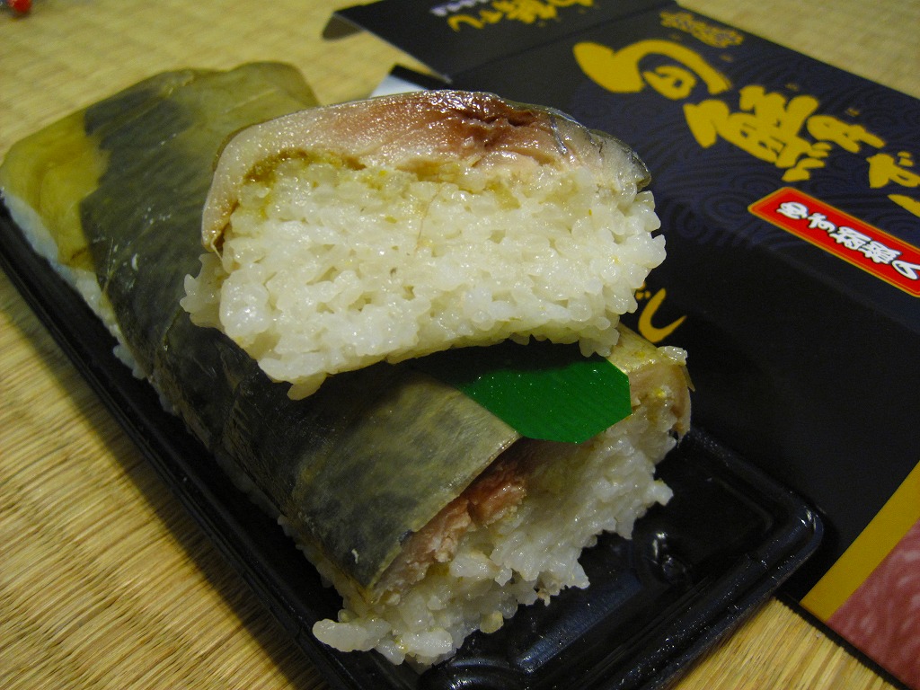 2009年までには福岡空港のJALUXで登場か。弁当がまるごと冷凍された状態で販売される土産物。小さな長方形の木製容器に、木目柄のボール紙でふたをして、商品名や宣伝文や注意書きを書いた掛紙を巻き、まるごと透明な袋で密封する。中身は炊込飯の上にタイ塩焼がまるごと載るもの。飯も身もダシが効いている感じで、宣伝のとおり確かに尾頭丸ごと食べられた。 【福岡空港】1972(昭和47)年4月開港 福岡県福岡市博多区大字下臼井778番地の1 http://www.fuk-ab.co.jp/ 【日本鮮食株式会社YO】福岡県糸島市二丈深江2142番地3 092(325)1278 http://www.nihon-sensyoku.co.jp/ 玄海旬鯖ずし(1,500円) 2011年3月21日に福岡空港ターミナルビルJALUXで購入