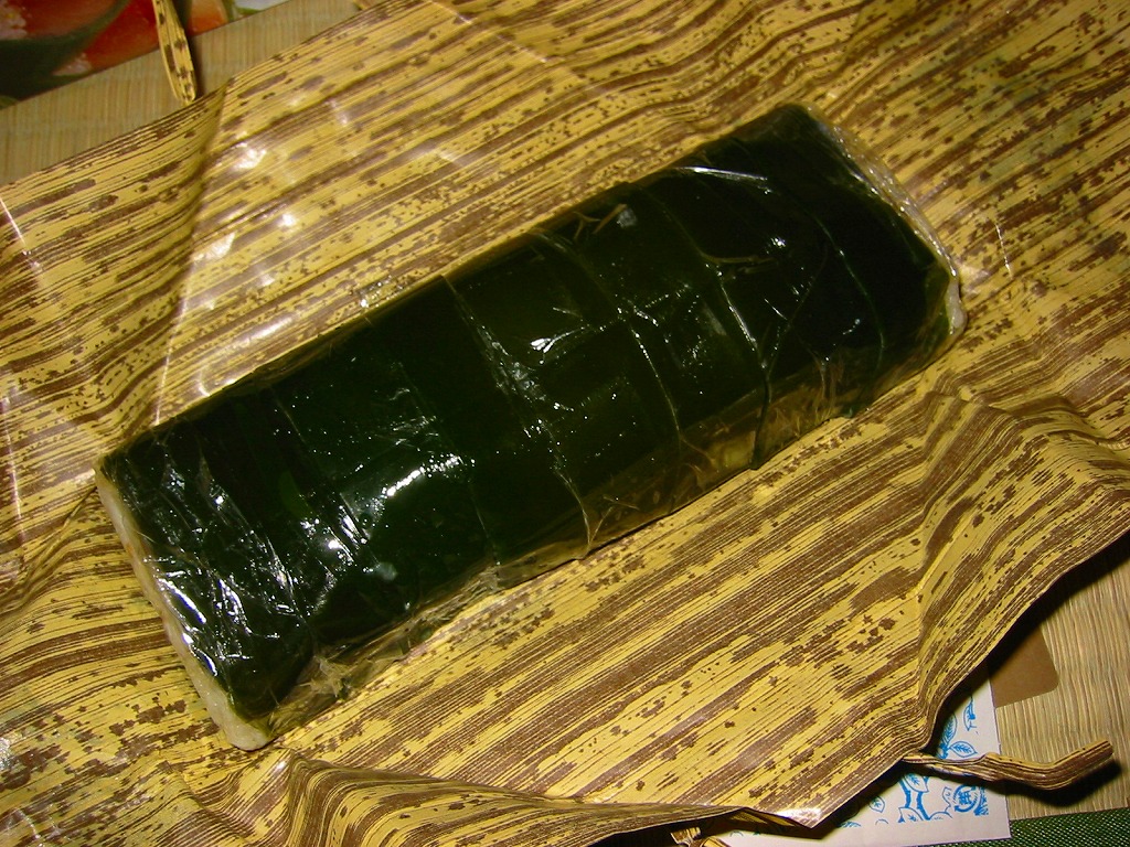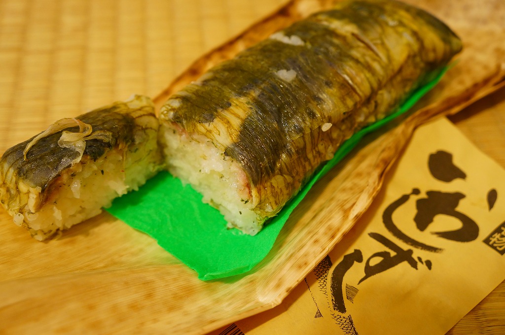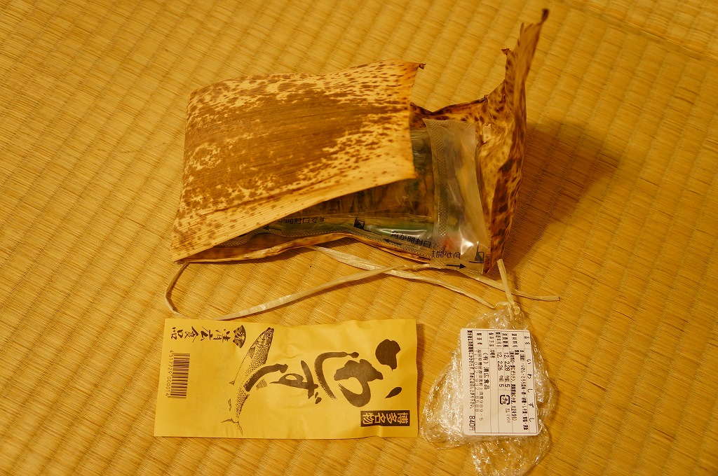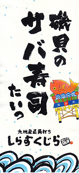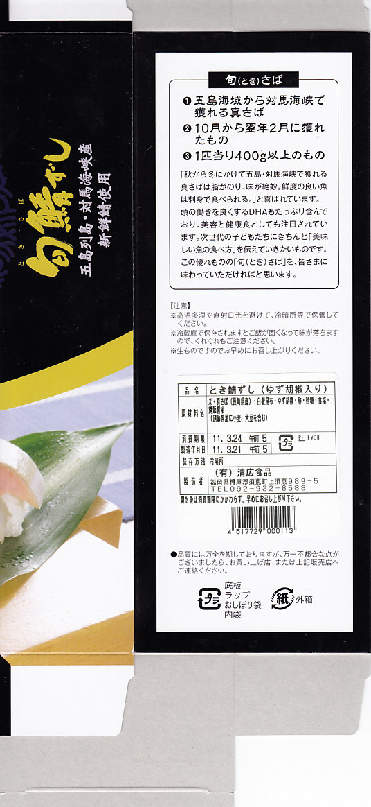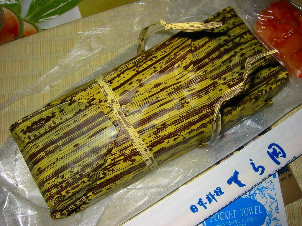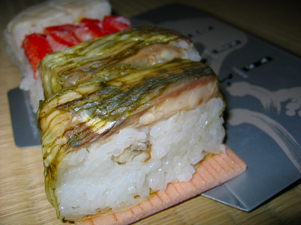 2009年までには福岡空港のJALUXで登場か。弁当がまるごと冷凍された状態で販売される土産物。小さな長方形の木製容器に、木目柄のボール紙でふたをして、商品名や宣伝文や注意書きを書いた掛紙を巻き、まるごと透明な袋で密封する。中身は炊込飯の上にタイ塩焼がまるごと載るもの。飯も身もダシが効いている感じで、宣伝のとおり確かに尾頭丸ごと食べられた。 【福岡空港】1972(昭和47)年4月開港 福岡県福岡市博多区大字下臼井778番地の1 http://www.fuk-ab.co.jp/ 【日本鮮食株式会社YO】福岡県糸島市二丈深江2142番地3 092(325)1278 http://www.nihon-sensyoku.co.jp/ 玄海旬鯖ずし(1,500円) 2011年3月21日に福岡空港ターミナルビルJALUXで購入