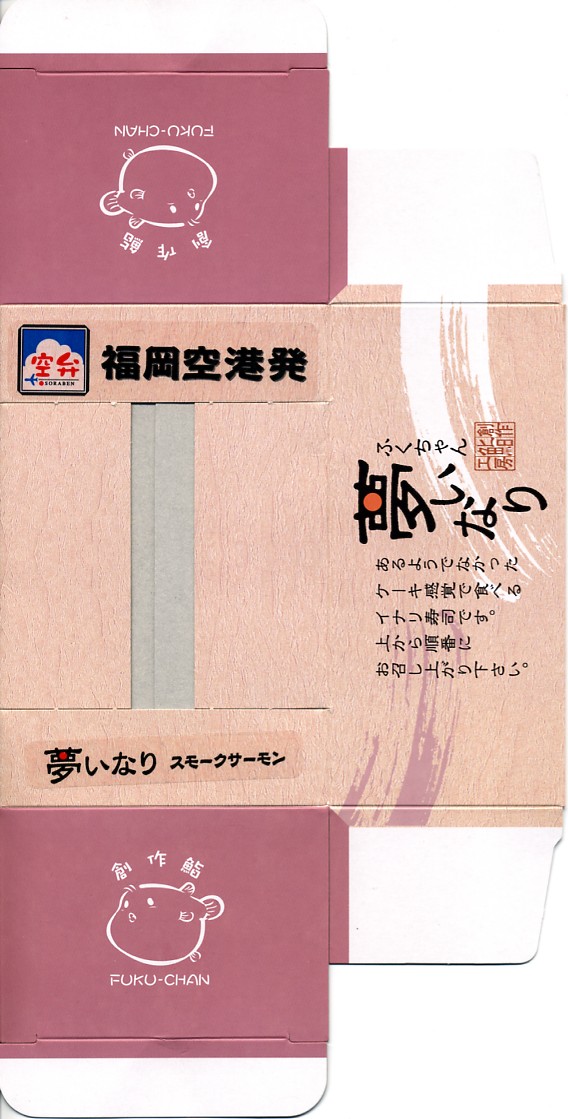 円形のわっぱ型容器に縁付きのふたをして、商品名と鯛と海を描いた掛紙をかけて四隅をセロハンテープで固定し、ひもで十字に固結びでしばる厳重包装。中身は炊込飯の上に玉子焼、れんこん、鯛、椎茸、タクアンを2切れずつと明太子を少々載せるもの。メインの鯛は見た目で薄く小さいのが2切れだけだが、御飯に粒や出汁としてたっぷり入るのか、おかず抜きにこれだけ食べていてもよい味が出ていた。 【福岡空港】1972(昭和47)年4月開港 福岡県福岡市博多区大字下臼井778番地の1 http://www.fuk-ab.co.jp/ 【株式会社福岡サンパレス】福岡県福岡市博多区築港本町2−1 092(272)1123 http://www.f-sunpalace.com/ ふくちゃん夢いなり スモークサーモン(350円) 2006年11月6日に京急ストア日の出町店駅弁大会で購入