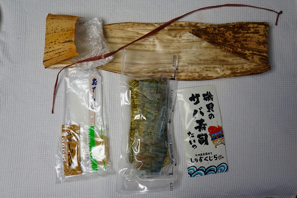 福岡空港の搭乗待合室で2017年11月にオープンした居酒屋チェーン店の店頭で売られていた「空弁」のひとつ。惣菜向けプラ容器の透明なふたに、全商品で共通の空弁シールを貼っていた。食品表示ラベルでの品名が「やりいか弁当」。白飯を浅く敷き、太めの錦糸卵で覆い、ヤリイカを散らし、柴漬けなどを添えるもの。シンプルで、イカがプリプリして、みずみずしく、手軽でなかなか美味な海鮮弁当。 【福岡空港】1972(昭和47)年4月開港 福岡県福岡市博多区大字下臼井778番地の1 http://www.fuk-ab.co.jp/ 【株式会社 磯貝製作所】福岡県福岡市博多区下白井757−1ターミナル2F 092(710)6113 https://www.hakata-isogai.net/ 【あじやエンタープライズ 株式会社】福岡県福岡市西区1−1−39 連絡先の記載なし 磯貝のサバ寿司たいっ(1,620円) 2018年3月25日に福岡空港ターミナルビル搭乗待合室の食堂で購入