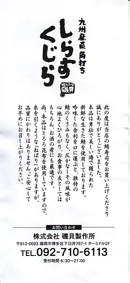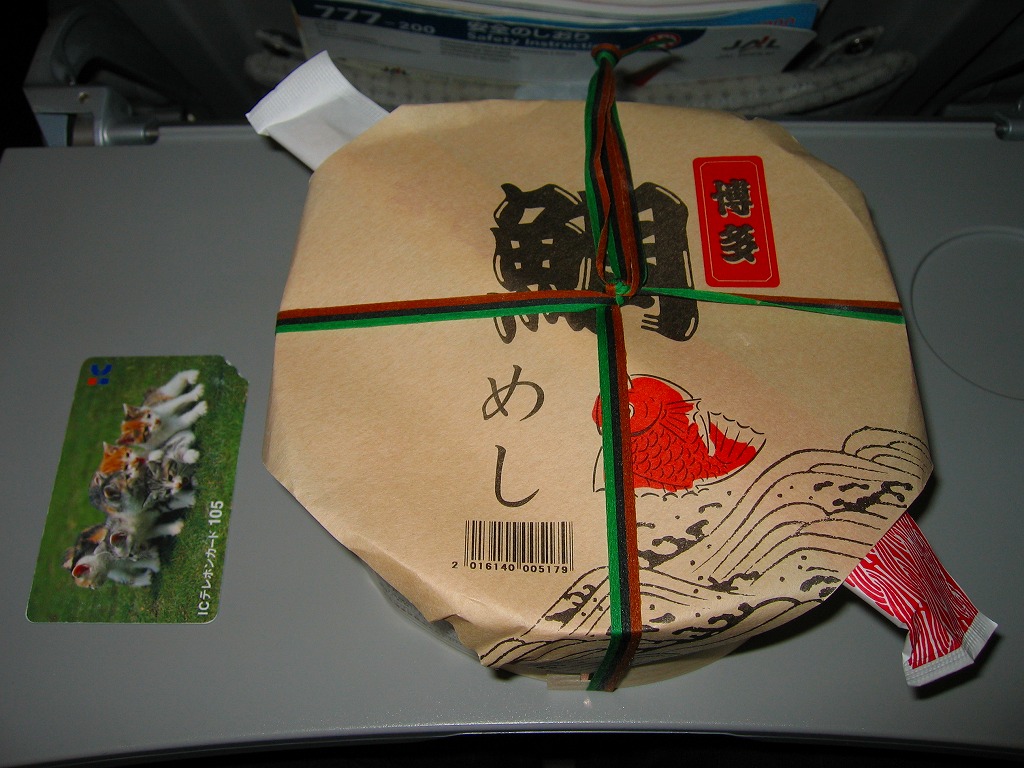 福岡県内の食品業者の通販対応な土産物の棒寿司が、空弁ブームに乗って福岡空港の空弁を名乗るようになったもの。量を持て余す棒寿司にしては珍しくひとり分に丁度良い分量のとろろ昆布巻いわし棒寿司が、密封されて割箸や通販チラシと共に竹皮に包まれ掛紙ごと縛られる。 封を切ると脂でべたべたするので、待合室や機内で食べるのは面倒だが、鉄道と異なり航空機内では客室乗務員がお茶でもおしぼりでも持ってきてくれるので、それをあてにすれば大丈夫。他に鯖と高菜のバージョンもあり、後者は九州らしい商品。JR九州の特急列車内で販売されていたという報告もある。 ※2012年12月補訂:写真の更新 【福岡空港】1972(昭和47)年4月開港 福岡県福岡市博多区大字下臼井778番地の1 http://www.fuk-ab.co.jp/ 【有限会社清広食品】福岡県粕谷郡須恵町上須恵989−5 092(932)8588 博多鯖寿司(1,575円) 2004年3月1日に福岡空港搭乗待合室内売店で購入