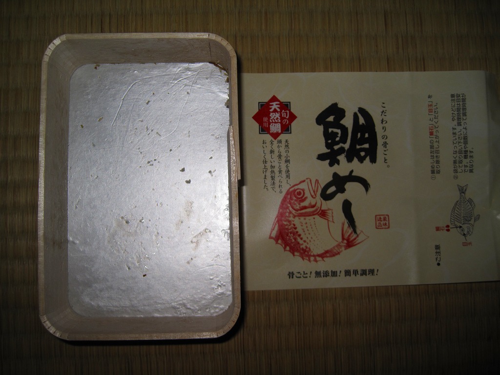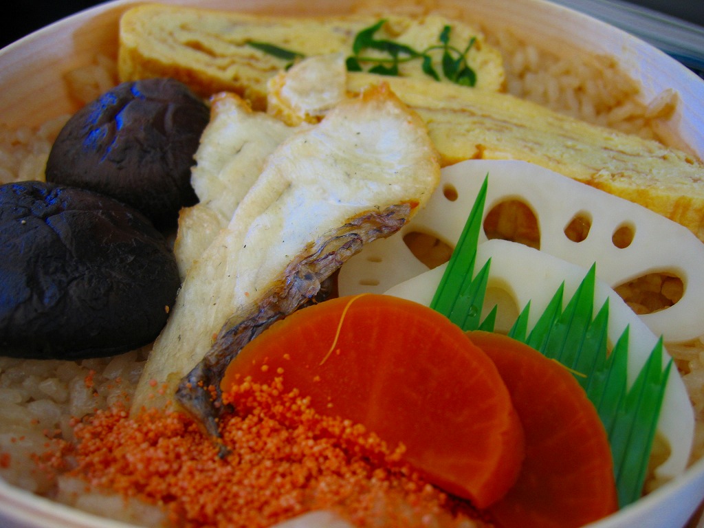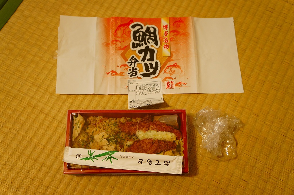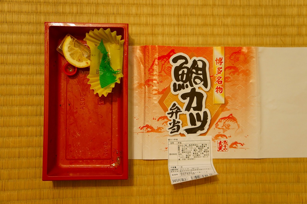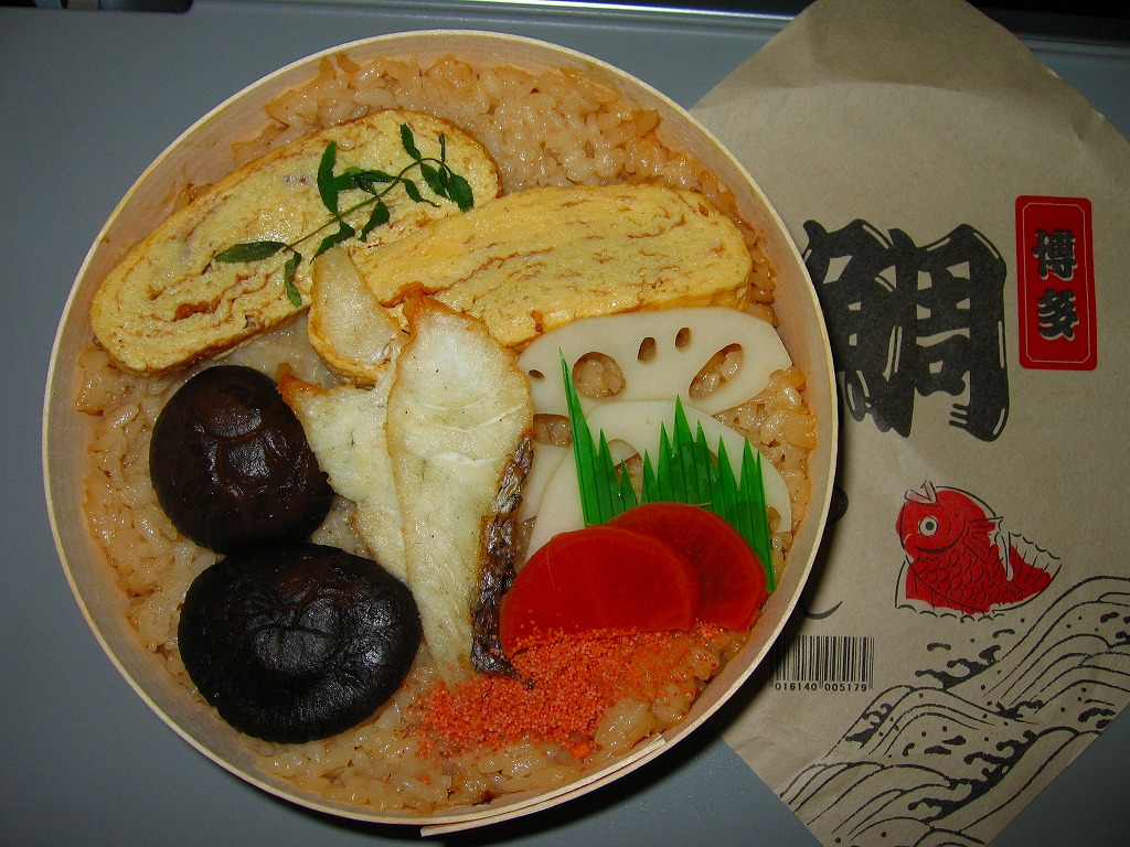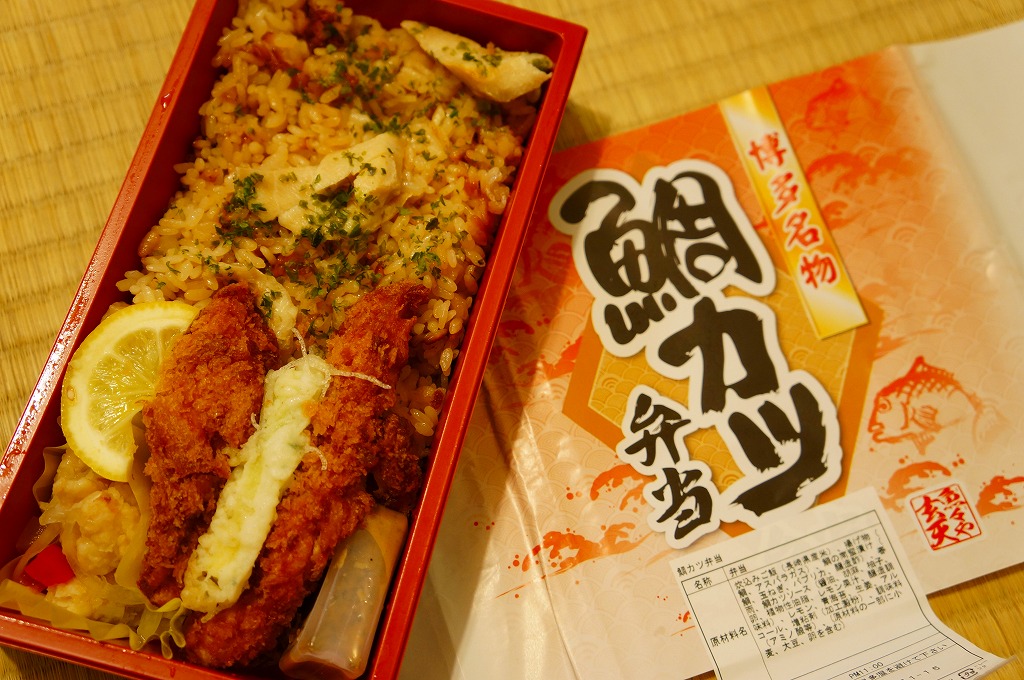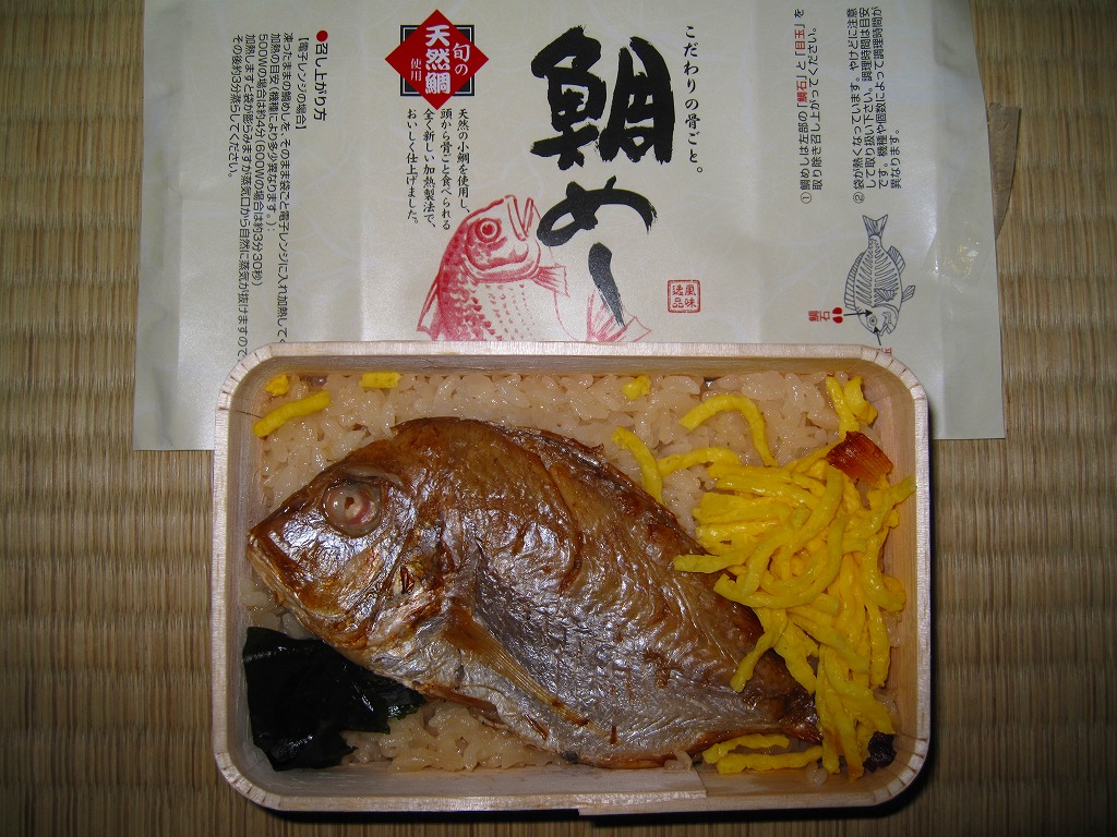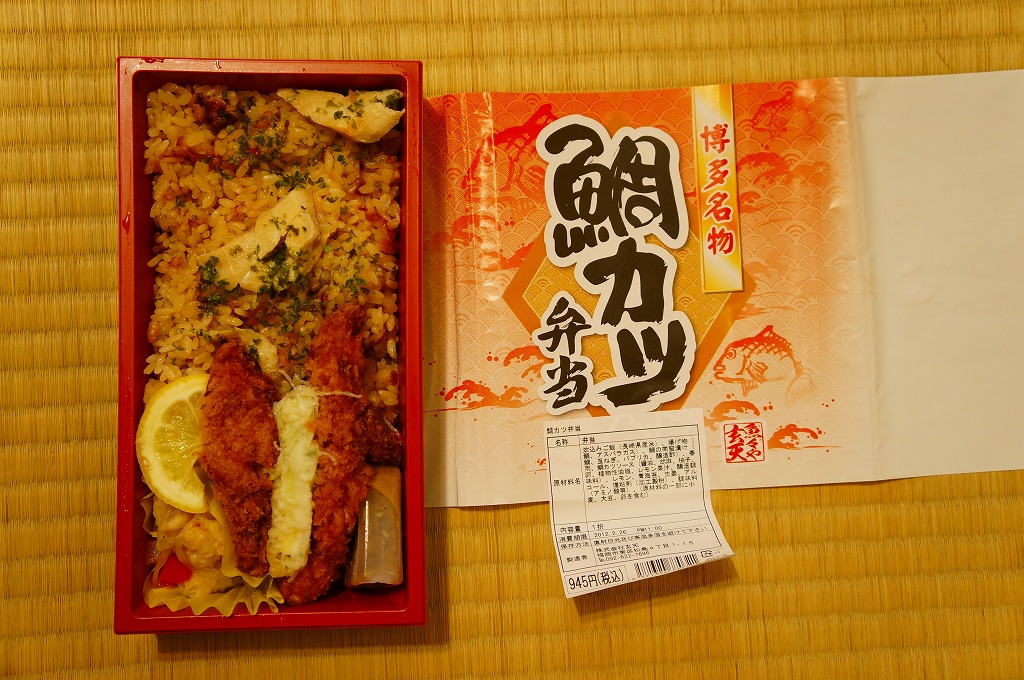 2011年の登場か。タイの絵柄や色に商品名を描いた掛紙を巻いた長方形の惣菜容器にタイの炊込飯を敷き、タイの揚げ物、タイの南蛮漬、春雨、レモンなどを載せたもの。鯛カツや鯛カツ弁当は断じて博多の名物ではないと思うが、シンプルな内容でもありモリモリと食べられるお弁当。JR博多駅の駅弁にもなっているという。調製元は魚の惣菜の通信販売ショップか。 【福岡空港】1972(昭和47)年4月開港 福岡県福岡市博多区大字下臼井778番地の1 http://www.fuk-ab.co.jp/ 【株式会社玄天】福岡県福岡市東区松島4丁目1−15 092(622)7696 http://www.genten-net.jp/ 鯛めし(980円) 2011年3月21日に福岡空港ターミナルビルJALUXで購入