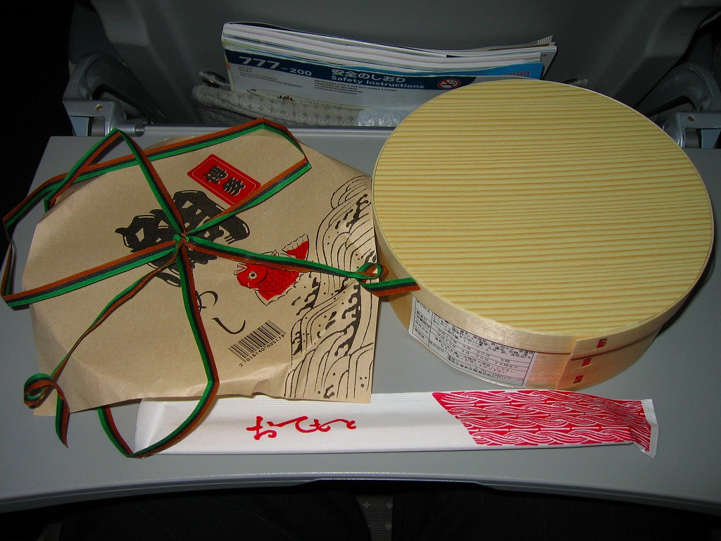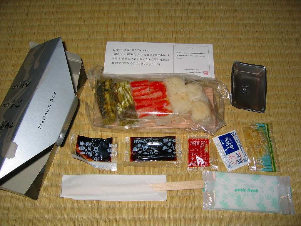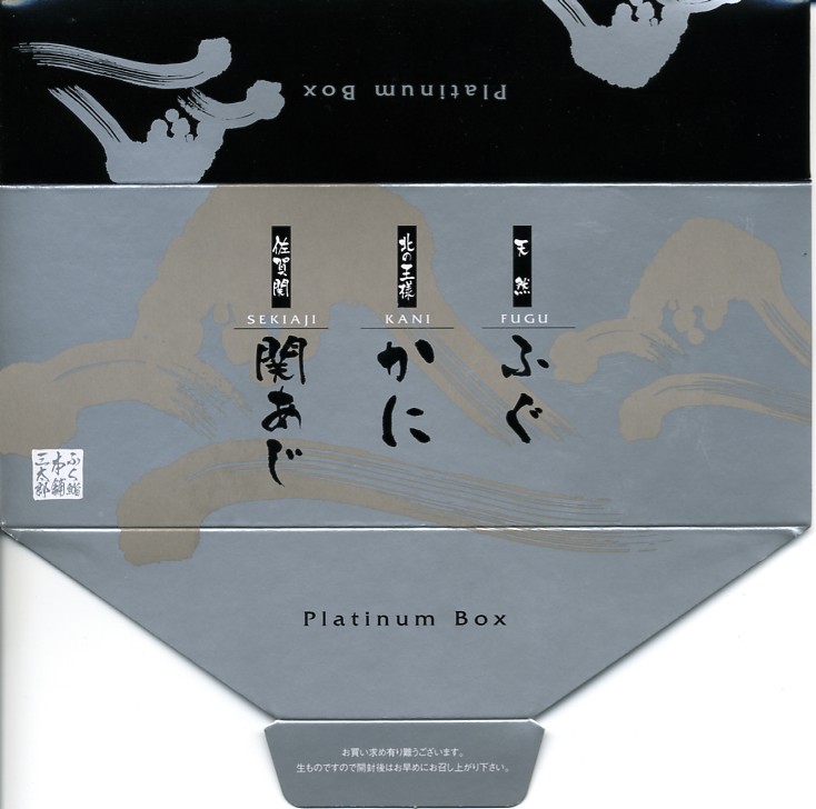 2005年3月31日登場。小さなボール紙箱に窓を開けて、丸々としたプラ製トレーに入る中身が見えるようにしている。中身は一口サイズに収まらない、スモークサーモンとポテトサラダのおいなりさん。ゲテモノに聞こえて、しかし具と飯はかなり合う、食べ辛さと味が意外に抜群な軽食群。ケーキ感覚で食べるイナリ寿司なんだとか。パッケージの空弁マークや空港名の表示は、現地販売版にはなかった。 【福岡空港】1972(昭和47)年4月開港 福岡県福岡市博多区大字下臼井778番地の1 http://www.fuk-ab.co.jp/ 【株式会社ドゥイットナウ仕出し工房事業部】福岡県福岡市西区福重3丁目33−28 092(882)3305 プラチナBOX(1,500円) 2006年1月13日に京王百貨店駅弁大会で購入