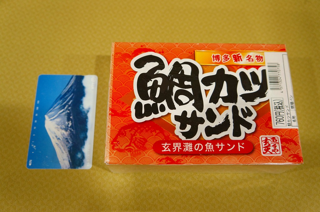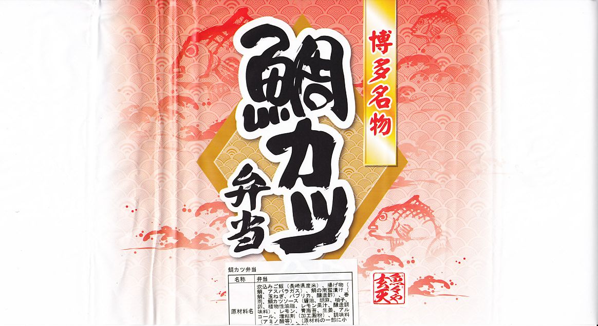 下記「鯛カツ弁当」のサンドイッチ版か。その掛紙と同じ意匠のボール紙箱に、タルタルソースを塗ったタイの揚げ物をトーストで挟んだサンドイッチが4切れ収まる。重量感たっぷり。カツサンドはどこにでもあるが、お魚のサンドイッチは珍しい。特に空弁や駅弁ではほとんど見ない。お値段は高いが、ありがたい味。 今回の夕方の福岡空港搭乗待合室は、てら岡や清広の定番な棒寿司空弁に加えて、駅弁っぽい外装の未収穫品も加えて10種程度がANAFESTAに数個ずつ、賑やかに陳列されていた。ここにはいつも夜しか入れず、セキュリティチェックの外側では弁当販売が見られず、いつも寂しい思いをしていたものだ。 【福岡空港】1972(昭和47)年4月開港 福岡県福岡市博多区大字下臼井778番地の1 http://www.fuk-ab.co.jp/ 【株式会社玄天】福岡県福岡市東区松島4丁目1−15 092(622)7696 http://www.genten-net.jp/ 博多名物鯛カツ弁当(945円) 2012年2月26日に福岡空港ターミナルビルANAFESTAで購入