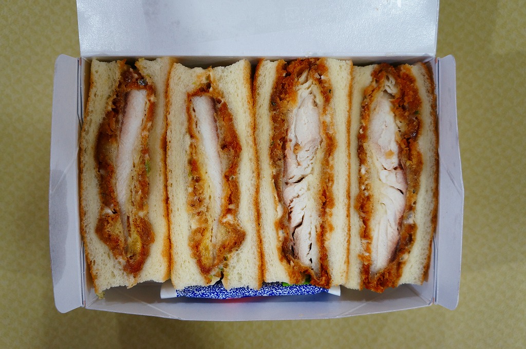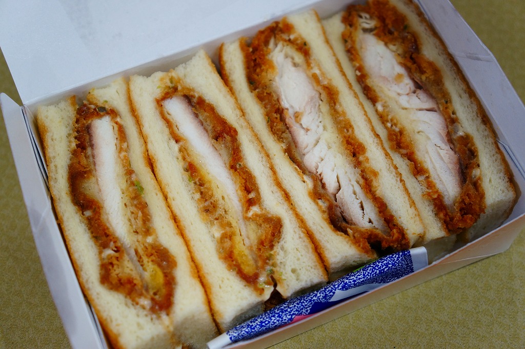 福岡空港の搭乗待合室で2017年11月にオープンした居酒屋チェーン店の店頭で売られていた「空弁」のひとつ。かつての福岡空港でたくさん売られていた、懐かしい棒寿司。焼かないシメサバを、しその葉を混ぜた酢飯に合わせ、とろろ昆布で覆って密封し、竹皮に包んで、掛紙ごとラップに巻く。脂がしみ出ないお土産品。 製造者は清広食品とある。国鉄がJRになった昭和末期頃から、博多駅や特急列車の車内販売で売られた棒寿司群の調製元で、その当時のサバ寿司と同じような分量と中身と味。同社のさば寿しは2018年現在で980円にて売られており、これはずいぶんと高価。 【福岡空港】1972(昭和47)年4月開港 福岡県福岡市博多区大字下臼井778番地の1 http://www.fuk-ab.co.jp/ 【株式会社 磯貝製作所】福岡県福岡市博多区下白井757−1ターミナル2F 092(710)6113 https://www.hakata-isogai.net/ 【清弘食品 株式会社】福岡県粕屋郡須恵町大字上須恵985−5 092(932)8588 http://www.kiyohiro.com/ 博多新名物鯛カツサンド(760円) 2013年3月24日に福岡空港ターミナルビルANAFESTAで購入