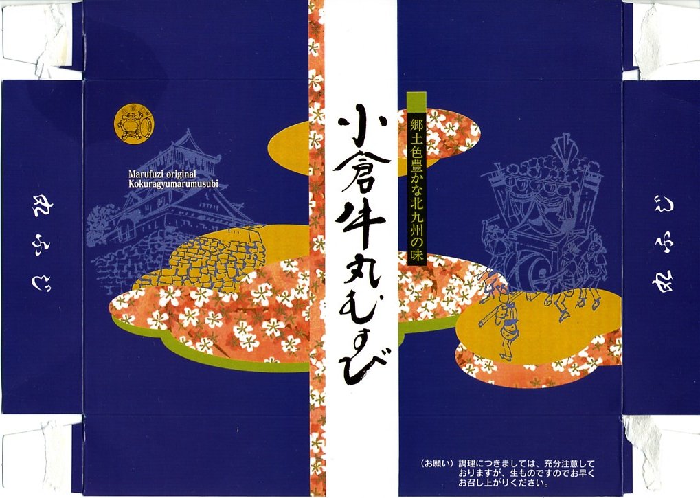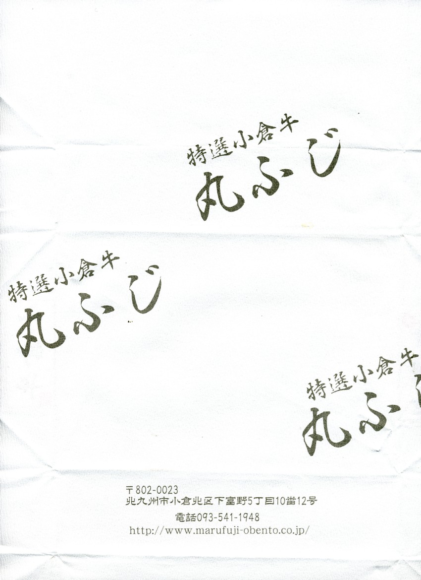2006年3月16日の北九州空港移転開港に伴い空弁デビュー。深めの木目調長方形発泡材容器に、商品名と小倉城や小倉祇園太鼓?などを描いたボール紙のふたをして、ラップで包み調製シールを貼る。6区画の中身は小倉牛軍艦巻が2つと、俵飯に焼肉を巻き付けた小倉牛巻、エビフライ巻き、タケノコ軍艦、大根の酢の物とパインとサクランボなど。 空弁デビュー前の1998年からの弁当業者の看板商品で、街弁や駅弁としての紹介例もある。小倉牛とは北九州市内で育つ黒毛和牛、この空弁でのその味は、表面で赤身ビーフの風味と見栄えを出しながら豊かな脂肪分を内包する感じ。 【北九州空港】1944(昭和19)年9月1日開港 北九州市小倉南区空港北町 http://www.kitakyu-air.jp/ 【株式会社丸ふじ】福岡県北九州市小倉北区下富野5丁目10−12 093(541)1948 http://www.marufuji-obento.co.jp/ 特選小倉牛弁当(1,575円) 2006年3月19日に横浜高島屋九州物産展で購入