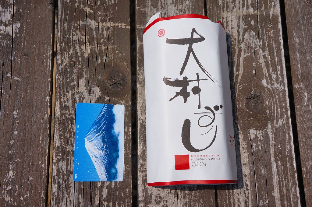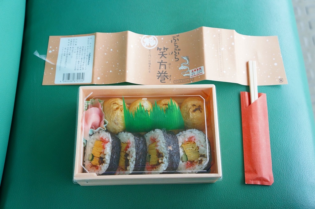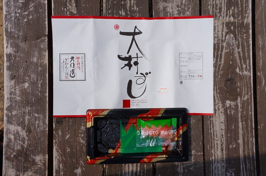 商品名や調製情報をゆるく描いた掛紙が巻かれる惣菜弁当向けプラ製容器に、玉子焼やキュウリやかんぴょうや桜でんぶなどを巻いた太巻き寿司が4切れと、タコ焼きのような形をしたおいなりさんが4個収まる。商品名はもはや節分の国民的行事となった恵方巻をもじったものだろうか。2月3日前後によらず、一年中販売されている模様。調製元は佐世保市内の寿司屋さん。 もともと平地が少なく歩く人が多い、坂道が多く歩かざるを得ない人が多い長崎市街は、2006年の「長崎さるく博」の成功により、ぶらぶら歩くことを主眼とした観光案内やイベントが行われるようになった。飛行機や電車や自動車では「ぶらぶら」とはいかない。 【長崎空港】1955(昭和30)年5月1日開港 長崎県大村市箕島町593 http://www.nabic.co.jp/ 【合資会社和企画】長崎県佐世保市田原町13−5 0956(49)7362 大村ずし(462円) 2012年3月30日に長崎空港旅客ターミナルビル内エアポートショップで購入