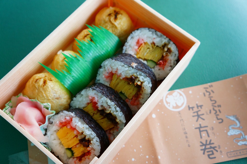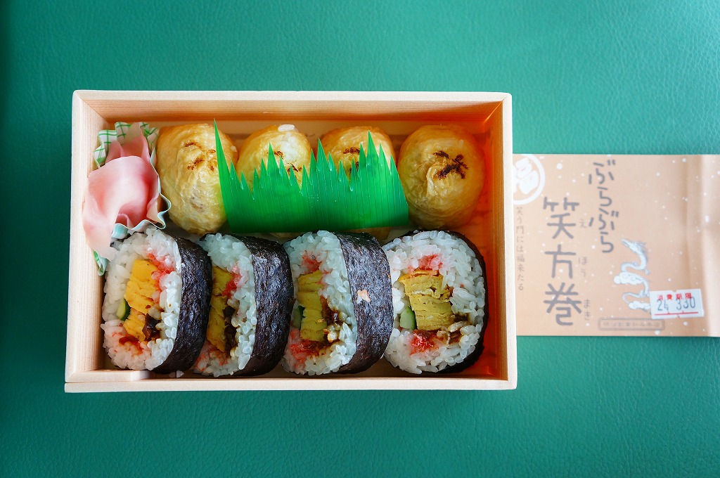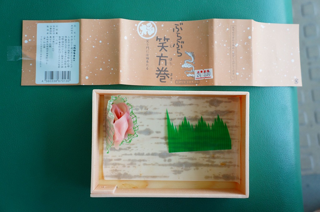 墨字が力強い掛紙をかけた、小柄でポップなボール紙の箱に、大村寿司が4個分、ぴったり収まる。ゴボウとニンジンが中に挟まれ、ゴマとかんぴょうとかまぼこと錦糸卵を載せたこの大村寿司は、見た目によらず重量級で、他の大村寿司よりちょっと高価。調製元は玖島城(くしまじょう)の城址にあたる大村公園の中で明治時代から営業する大村寿司屋さん。 【長崎空港】1955(昭和30)年5月1日開港 長崎県大村市箕島町593 http://www.nabic.co.jp/ 【有限会社梅ヶ枝】長崎県大村市玖島1−36 0120-52-1389 ぶらぶら笑方巻(580円) 2012年3月30日に長崎空港旅客ターミナルビル内エアポートショップで購入