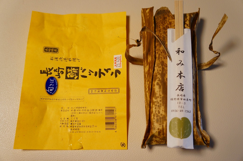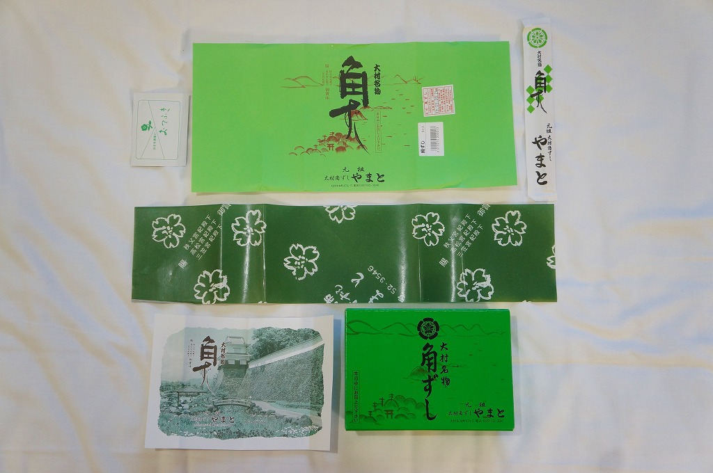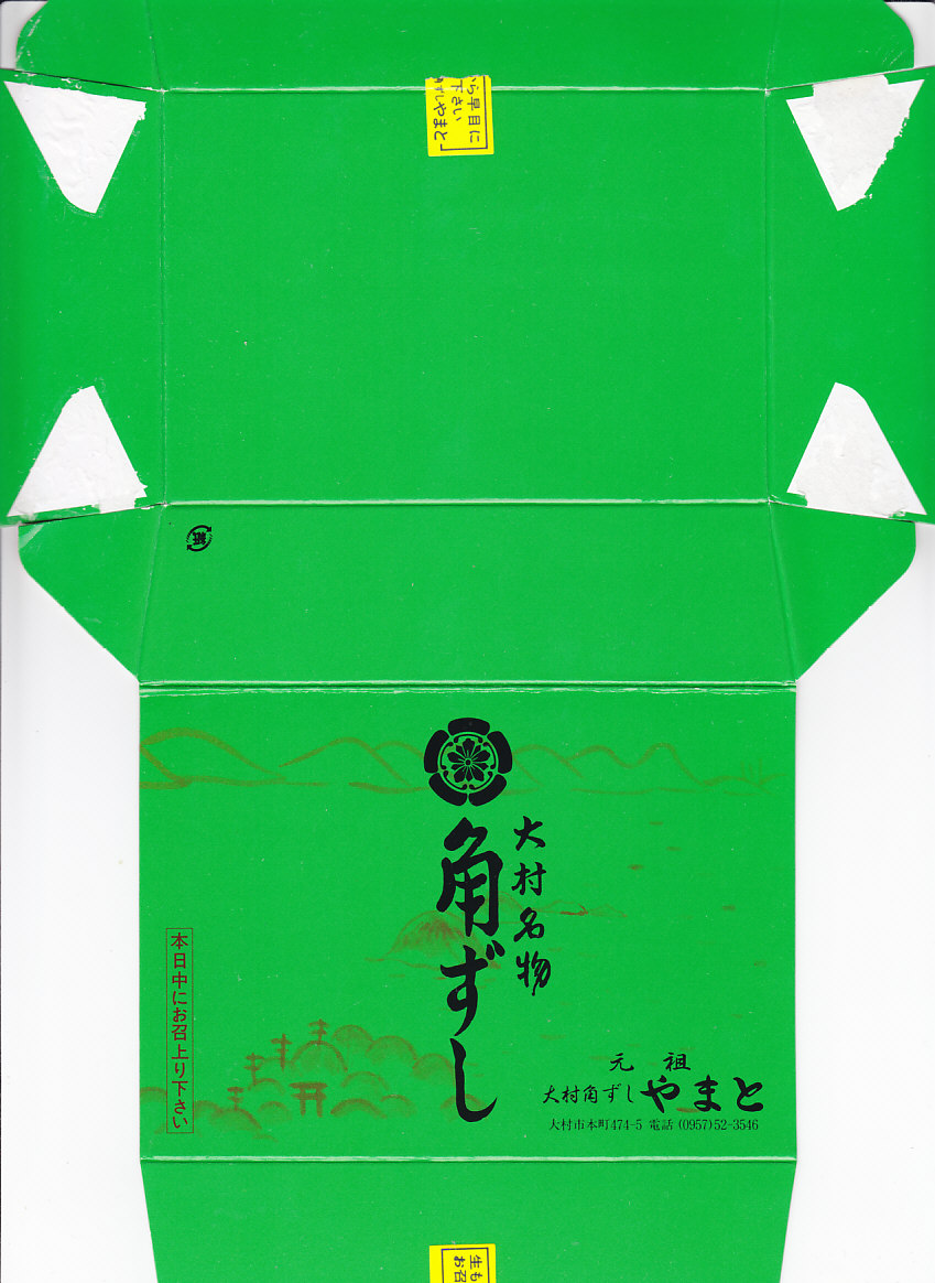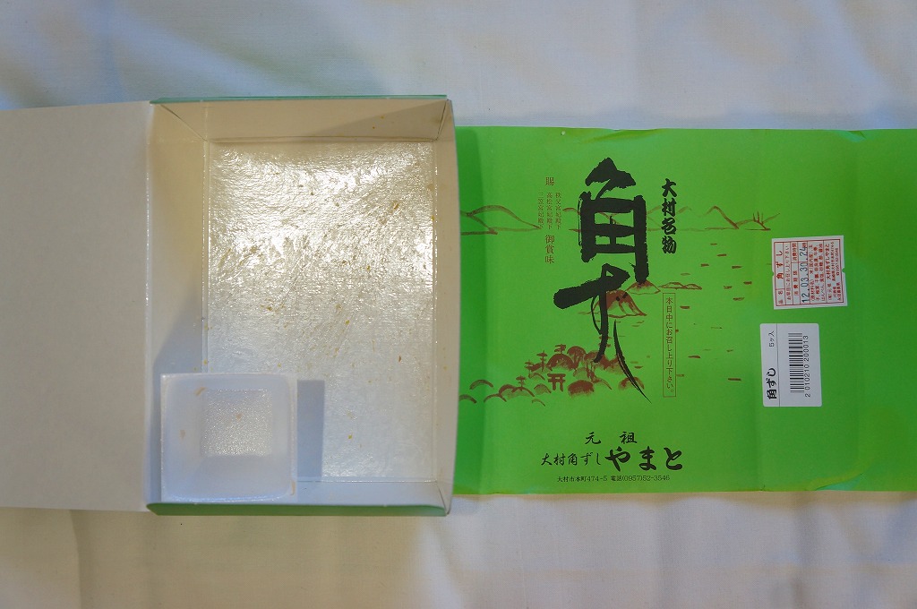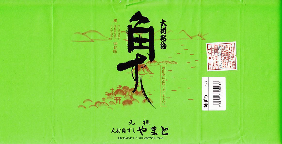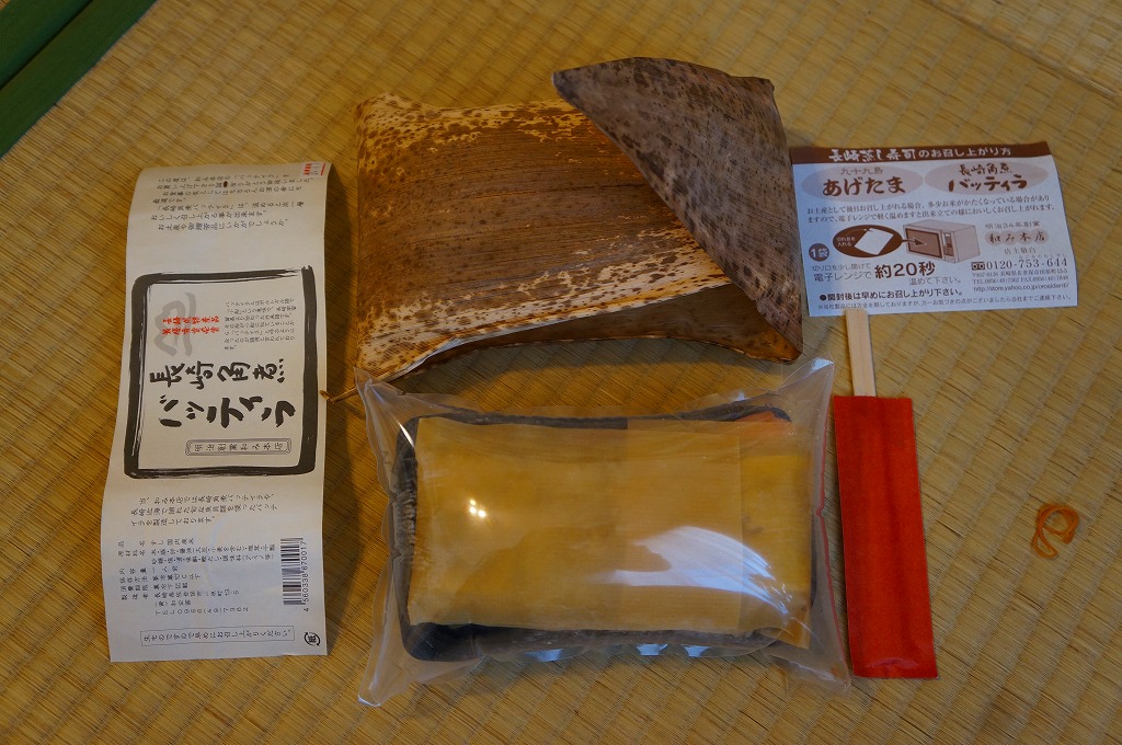 豚角煮を混ぜた酢飯を薄い玉子焼で巻いた俵飯が5個、竹皮風の紙でまとめて包まれて食品トレーに載り、透明な緩衝材でパンパンに膨れたものを竹皮で巻き、掛紙と割りばしとしおりをまとめて輪ゴムで留めていた。電子レンジで温めることが推奨される土産物。 【長崎空港】1955(昭和30)年5月1日開港 長崎県大村市箕島町593 http://www.nabic.co.jp/ 【合資会社和企画】長崎県佐世保市田原町13−5 0956(49)7362 大村名物角ずし(735円) 2012年3月30日に長崎空港旅客ターミナルビル内エアポートショップで購入