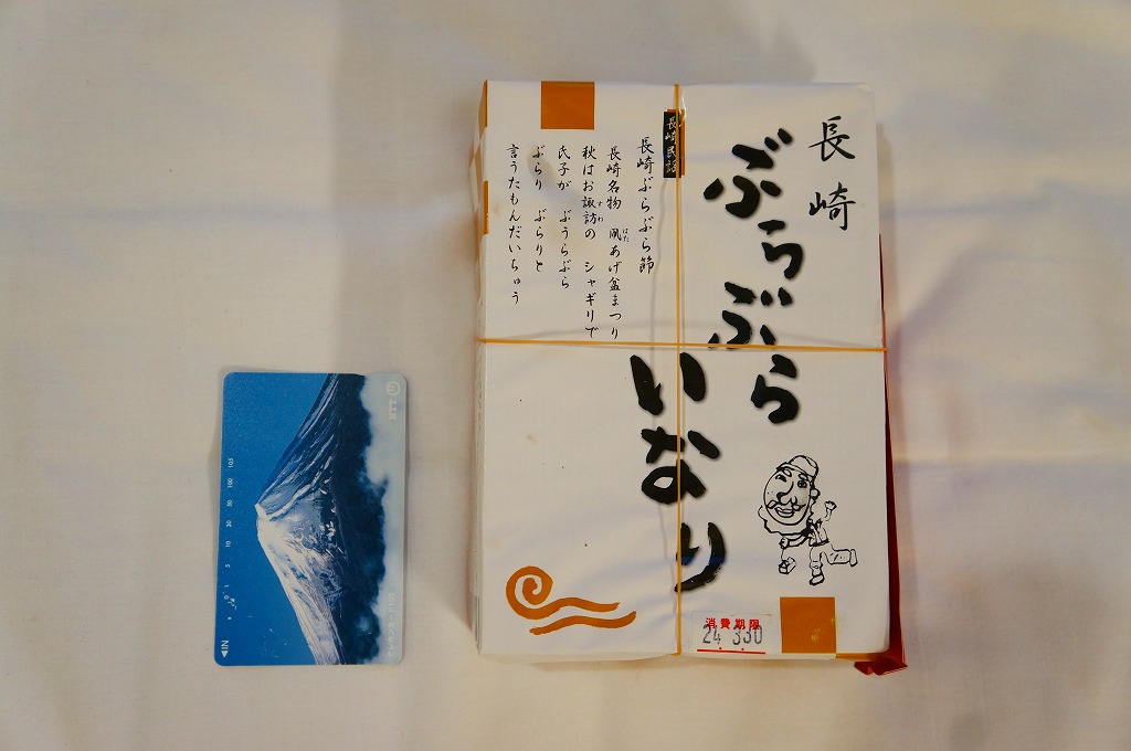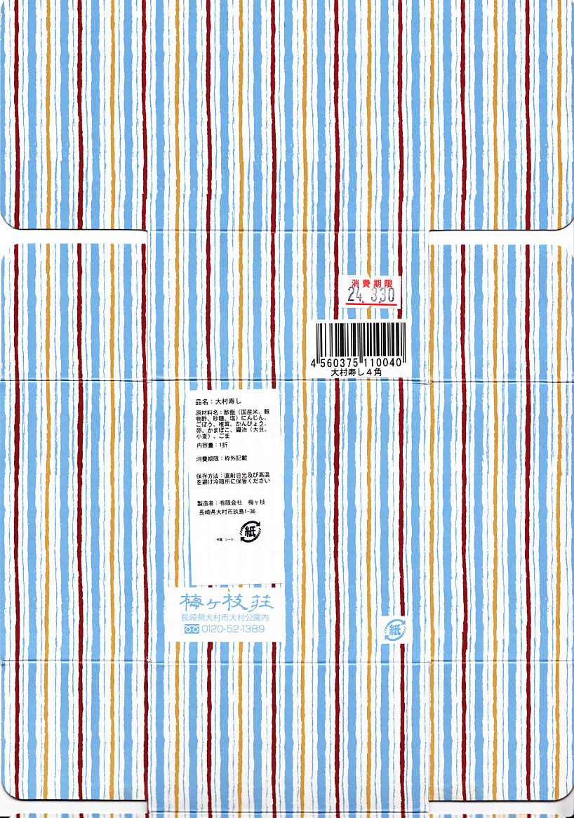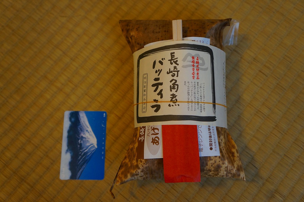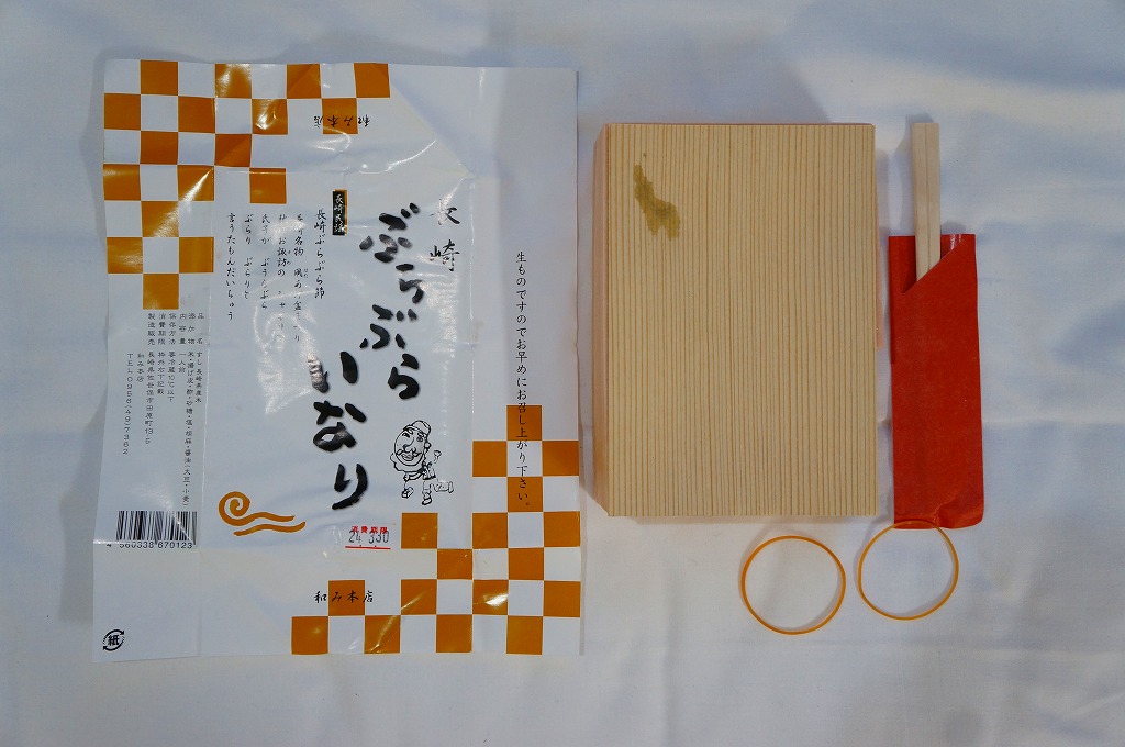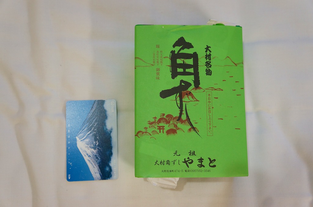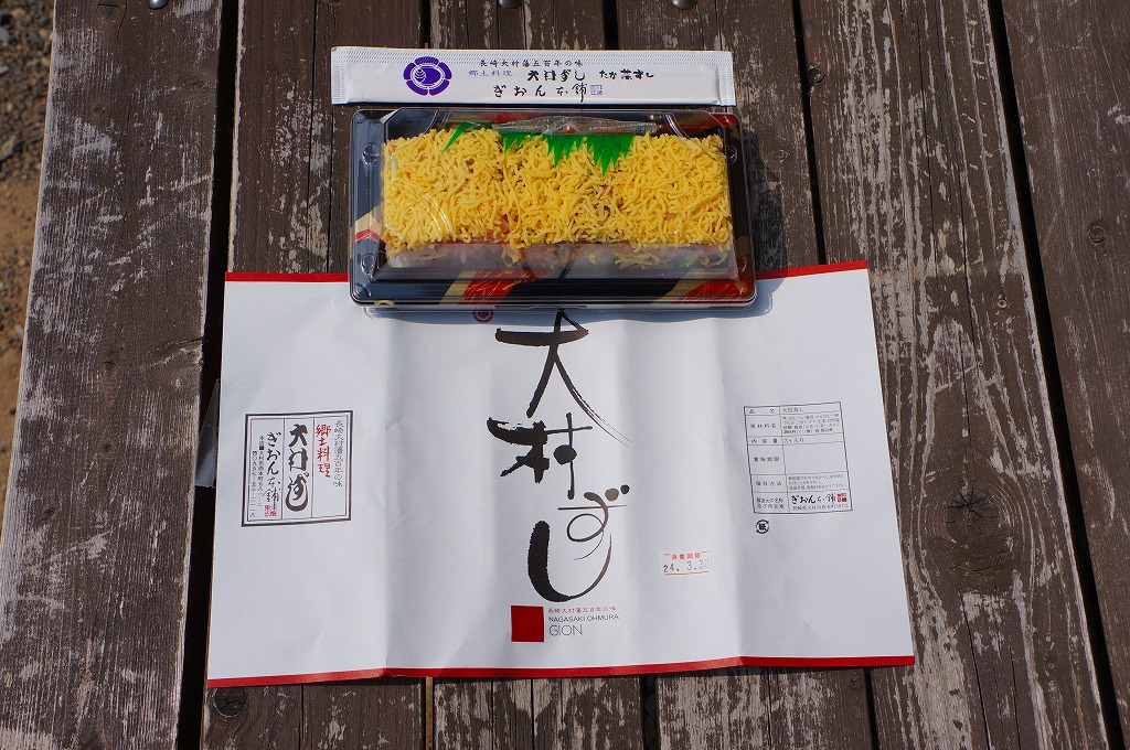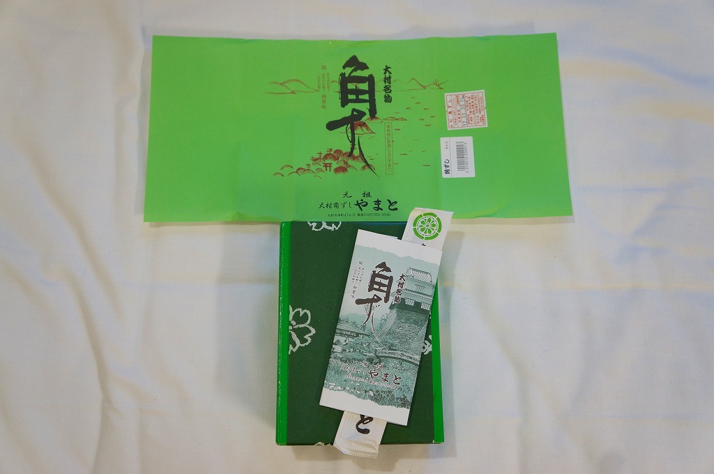 豚角煮を混ぜた酢飯を薄い玉子焼で巻いた俵飯が5個、竹皮風の紙でまとめて包まれて食品トレーに載り、透明な緩衝材でパンパンに膨れたものを竹皮で巻き、掛紙と割りばしとしおりをまとめて輪ゴムで留めていた。電子レンジで温めることが推奨される土産物。 【長崎空港】1955(昭和30)年5月1日開港 長崎県大村市箕島町593 http://www.nabic.co.jp/ 【合資会社和企画】長崎県佐世保市田原町13−5 0956(49)7362 大村名物角ずし(735円) 2012年3月30日に長崎空港旅客ターミナルビル内エアポートショップで購入