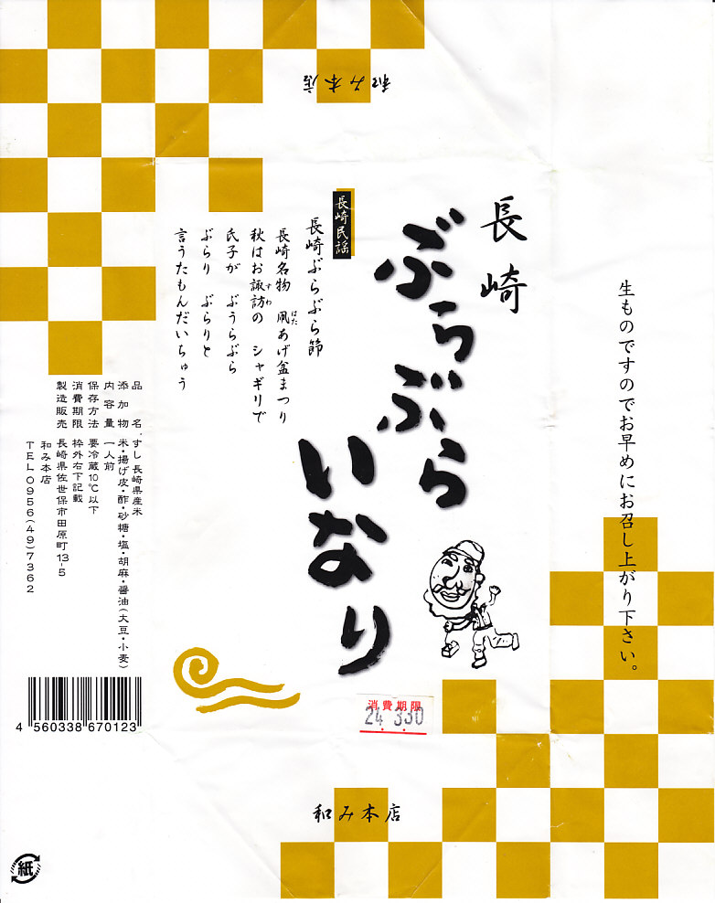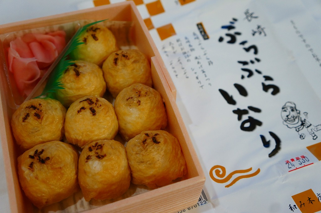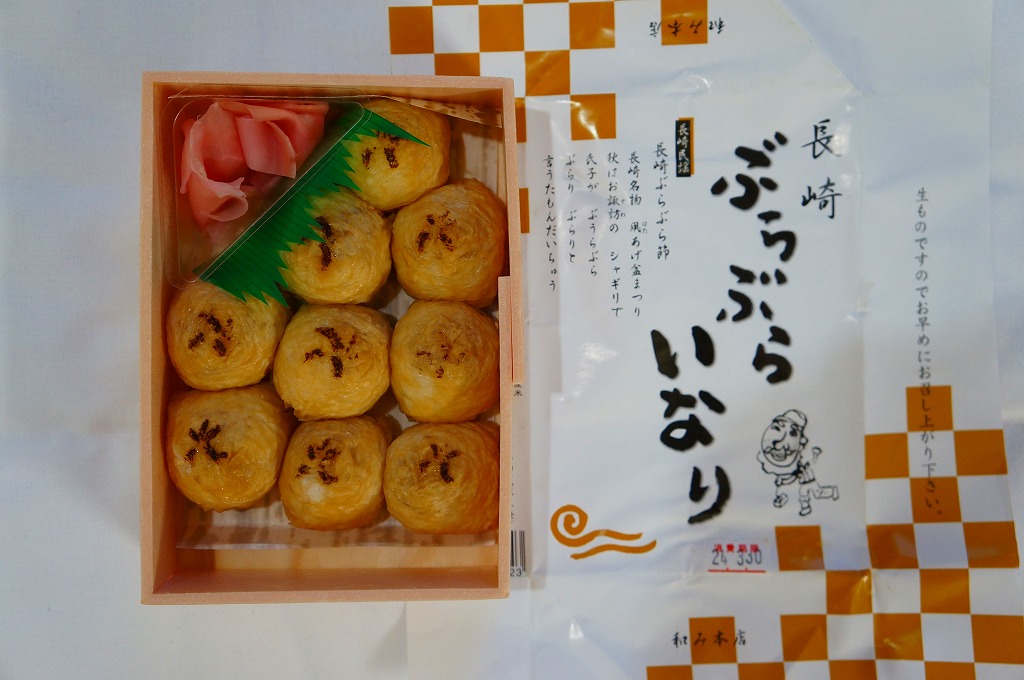 デパートでもおなじみの下記「大村名物角ずし」の、空港で買えた5個入り版。緑色の専用紙箱に大村寿司を5個分詰めてガリを添え、包装紙を巻き、割りばしとしおりを添え、さらに掛紙で包んでいた。「やまと」と「ぎおん」は大村寿司の二大ブランドである感じ。 【長崎空港】1955(昭和30)年5月1日開港 長崎県大村市箕島町593 http://www.nabic.co.jp/ 【有限会社元祖大村角ずしやまと】長崎県大村市本町474−5 0957(52)3546 http://www.kakuzushi.jp/ 長崎ぶらぶらいなり(525円) 2012年3月30日に長崎空港旅客ターミナルビル内エアポートショップで購入