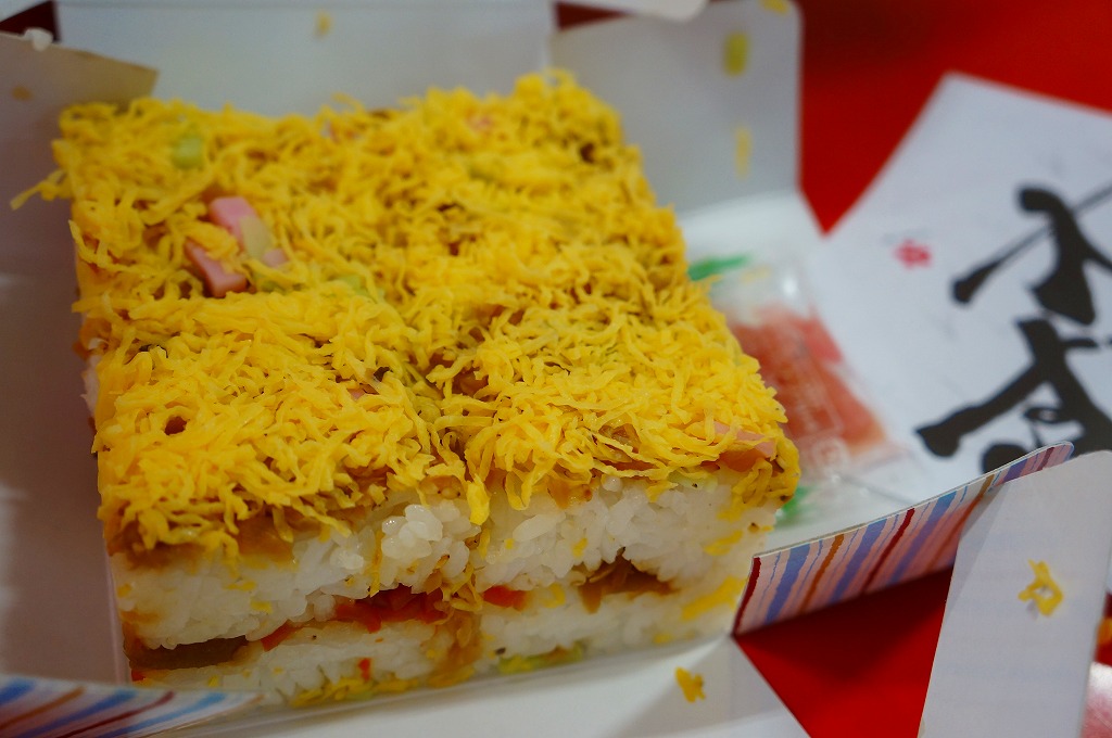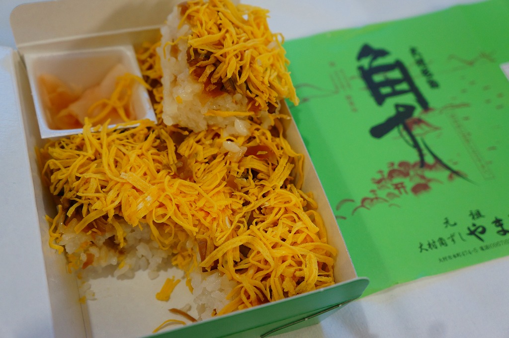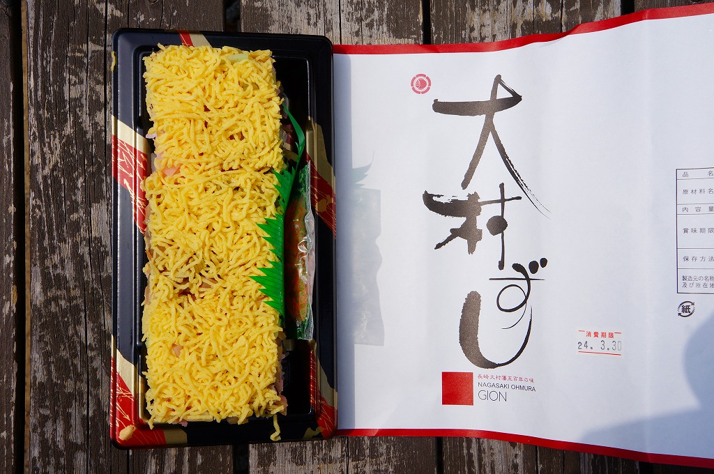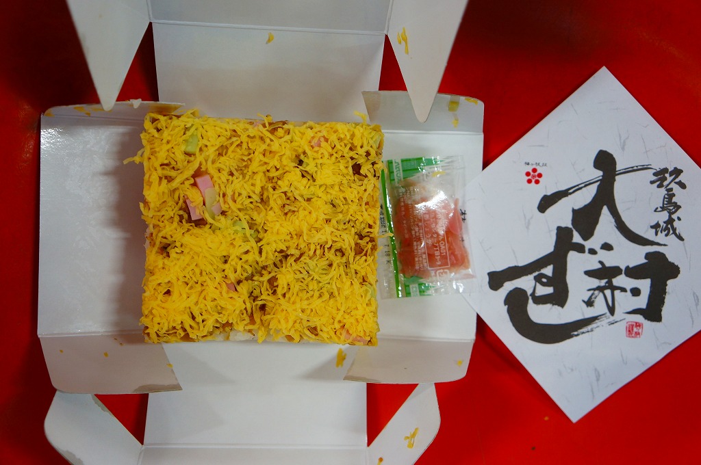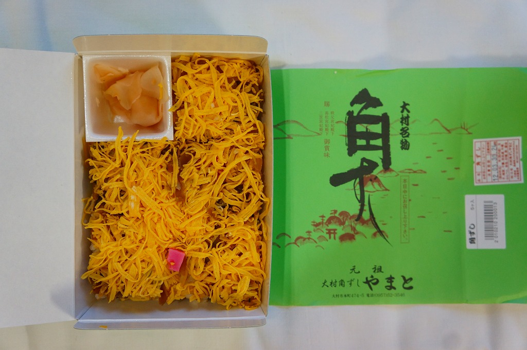 惣菜用の正方形発泡材容器に透明なふたをして輪ゴムでしばり、商品名を書いた緑色のボール紙の枠にはめる。中身は商品名のとおり、大村名物という角ずしが4ブロック入る。酢飯の上にシイタケやカンピョウやゴボウを細かく刻み、錦糸卵で覆う押寿司。おにぎりの代わりにおかずいらずでいただける手軽な御飯物。 1474年に島原の有馬氏に敗れ大村を明け渡した大村純伊(すみこれ)が1480年に大村を奪還した際に、喜んだ領民達が侍を迎えるにあたり、各家庭にあったもろぶたと呼ばれる木箱に御飯と錦糸卵とありあわせの材料を詰めて押し寿司をこしらえ、侍達がこれを脇差で縦横に切って食べたのが、大村寿司の由来だそうだ。だから押寿司なのに円形でも棒状でもなく、正方形の形をしている。 しかし大村で500年以上の歴史を刻む本来の大村寿司は、白身の魚の酢締めも入る2層構造であり、この商品のような魚のない1層構造ではないようだ。ただ、大村市街に店を構えるやまとの角ずしは評判が高く、これが長崎駅や長崎空港の売店ほか県内各地で販売され、県民に親しまれている。 【長崎空港】1955(昭和30)年5月1日開港 長崎県大村市箕島町593 http://www.nabic.co.jp/ 【有限会社やまと】長崎県長崎市ダイヤランド1丁目29−24 095(879)2680 http://www.kakuzushi.jp/ 大村角寿し(819円) 2003年1月21日に京王百貨店駅弁大会で購入