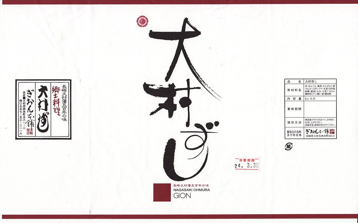 惣菜寿司用の食品トレーが、商品名を書いた白い掛紙に巻かれる。中身は大村寿司が3切れ分。はんぺん、しいたけ、かんぴょう、でんぶ、ごぼう、ごまが入っている。調製元は大村市内の食事もできる大村寿司屋さん。この日もここでは多種多様な、しかし見た目も味もその差が分からない大村寿司が売られていた。 【長崎空港】1955(昭和30)年5月1日開港 長崎県大村市箕島町593 http://www.nabic.co.jp/ 【ぎおん本舗】長崎県大村市西本町581−2 0957(53)2118 http://www.octp-net.ne.jp/~o-gion/ 大村名物角ずし(504円) 2009年1月25日に阪神百貨店駅弁大会で購入