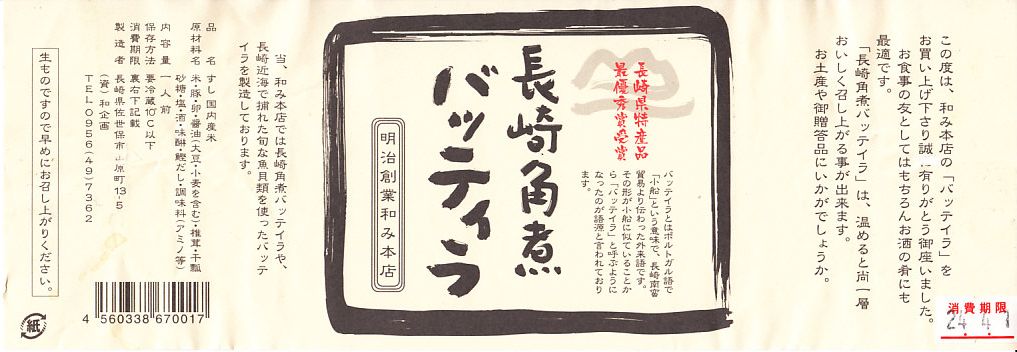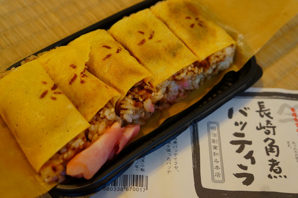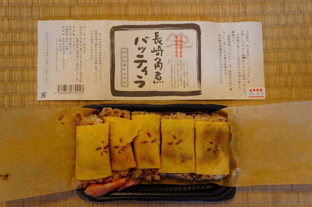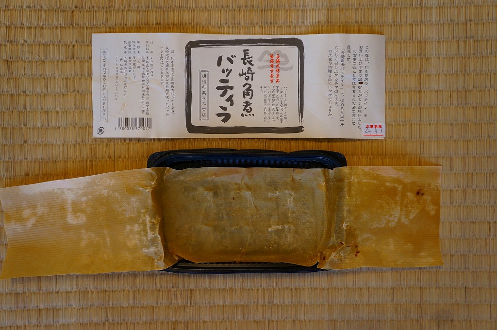 日本海側を中心に各地で空弁や駅弁や土産物になっているサバの棒寿司の、長崎空港版。空弁の名前こそ長崎っぽいが、中身は他の地域のものと変わらず、焼かずに酢締めの松浦旬サバを、長崎県産米の酢飯に合わせ、白板昆布で覆い、白ゴマを置いてガリを添え、竹皮柄の紙を巻いて醤油を添え、竹皮と掛紙で巻く。小柄と安価がお手頃で、もはや忘れ去られつつある空弁の特徴を押さえているように感じた。 【長崎空港】1955(昭和30)年5月1日開港 長崎県大村市箕島町593 http://www.nabic.co.jp/ 【和み本店】長崎県佐世保市田原町13−5 0956(49)7362 長崎角煮バッティラ(945円) 2012年3月30日に長崎空港旅客ターミナルビル内エアポートショップで購入
