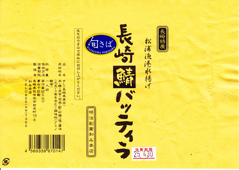 長崎鯖バッティラ(870円?) 2012年3月30日に長崎空港旅客ターミナルビル内エアポートショップで購入