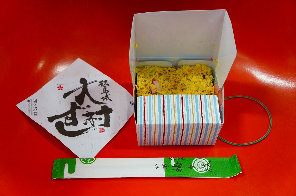 商品名と長崎民謡「長崎ぶらぶら節」を記した包装紙に包まれる長方形の容器に、タコ焼きのような形状でおいなりさんを9個詰め、ガリを添える。滋賀県のJR草津駅の駅弁より、和歌山県のJR御坊駅の駅弁より、かわいらしく食べやすい軽食。 【長崎空港】1955(昭和30)年5月1日開港 長崎県大村市箕島町593 http://www.nabic.co.jp/ 【和み本店】長崎県佐世保市田原町13−5 0956(49)7362 玖島城大村ずし(735円) 2012年3月30日に長崎空港旅客ターミナルビル内スカイショップで購入