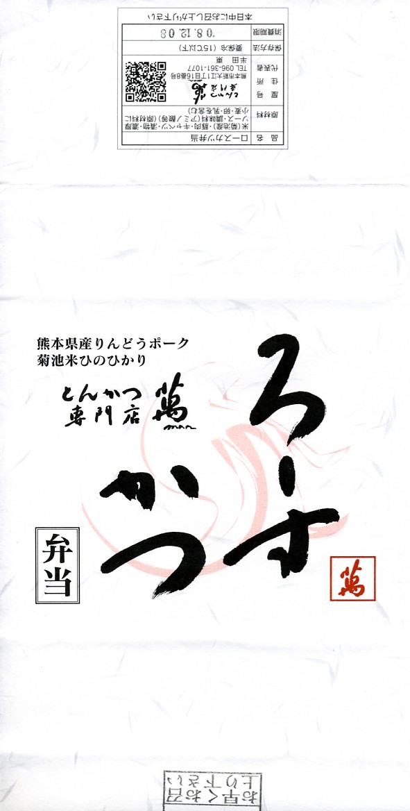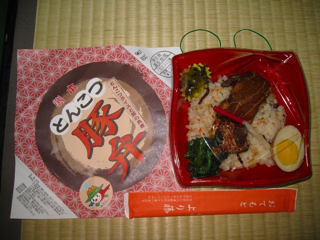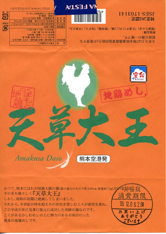 黒いボール紙の箱に、商品名を書いた白い掛紙を巻く。半透明のトレーに収まる中身は、熊本県の菊池米ヒノヒカリの白御飯の上に千切りキャベツを敷き、熊本県産りんどうポークのロースカツをひとつ、ソースに浸けて9切れ程度にカットして載せ、漬け物を添えるもの。風味はデパ地下タイプ。調製元は熊本市内、水前寺駅近くのおしゃれなトンカツ食堂。 【熊本空港】1960(昭和35)年4月1日開港 熊本県上益城郡益城町大字小谷1802 http://www.kmj-ab.co.jp/ 【とんかつ専門店 萬】熊本県熊本市新大江1丁目16番8号 096(361)1077 天草大王(880円) 2008年12月8日に熊本空港搭乗待合室内ANAFESTAで購入