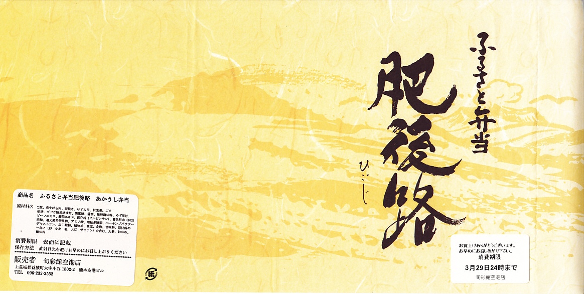 熊本空港で買えたサンドイッチ。この姿は北海道から九州まで、各地の空港で見た気がする。ここでは小柄なオムレツサンド、ハムサンド、ハムポテトサンド、チキン南蛮タマゴポテトサンド、タマゴサンド。全体的に少量も、具のほうがだいぶ多いサンドイッチだった。調製元もまた、全国チェーンのパン会社。 【熊本空港】1960(昭和35)年4月1日開港 熊本県上益城郡益城町大字小谷1802 http://www.kmj-ab.co.jp/ 【株式会社 サンデリカ 熊本工場】熊本県宇城市松橋町浦川内2388 0120-580-551 ふるさと弁当肥後路(700円) 2015年3月29日に熊本空港ターミナルビル内売店「旬彩館」で購入