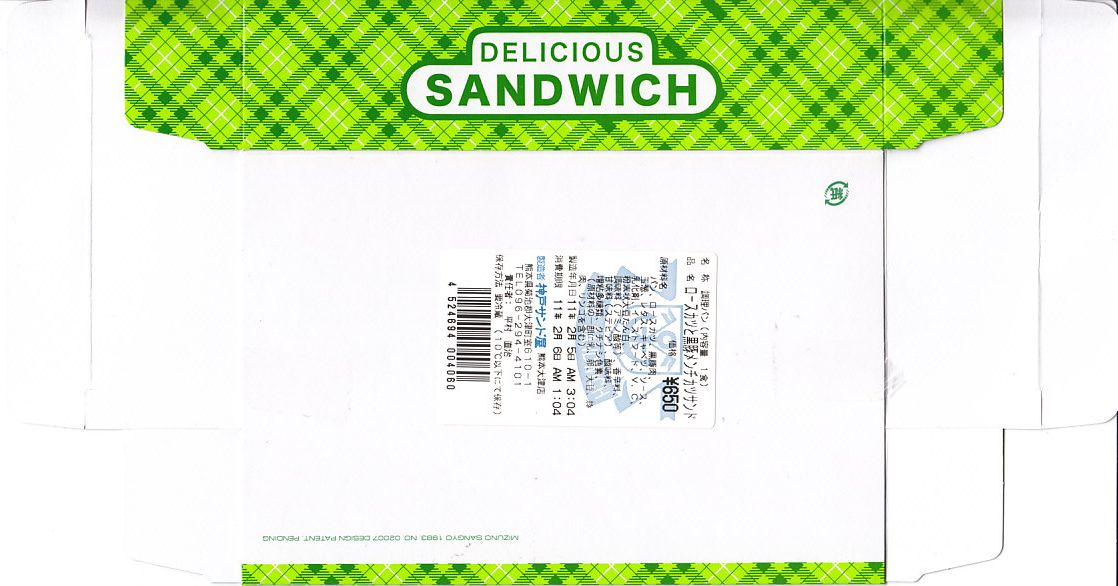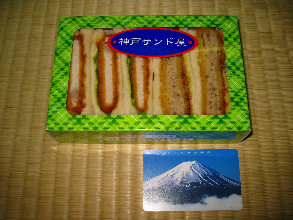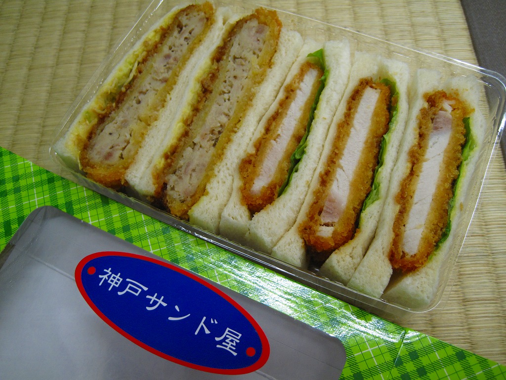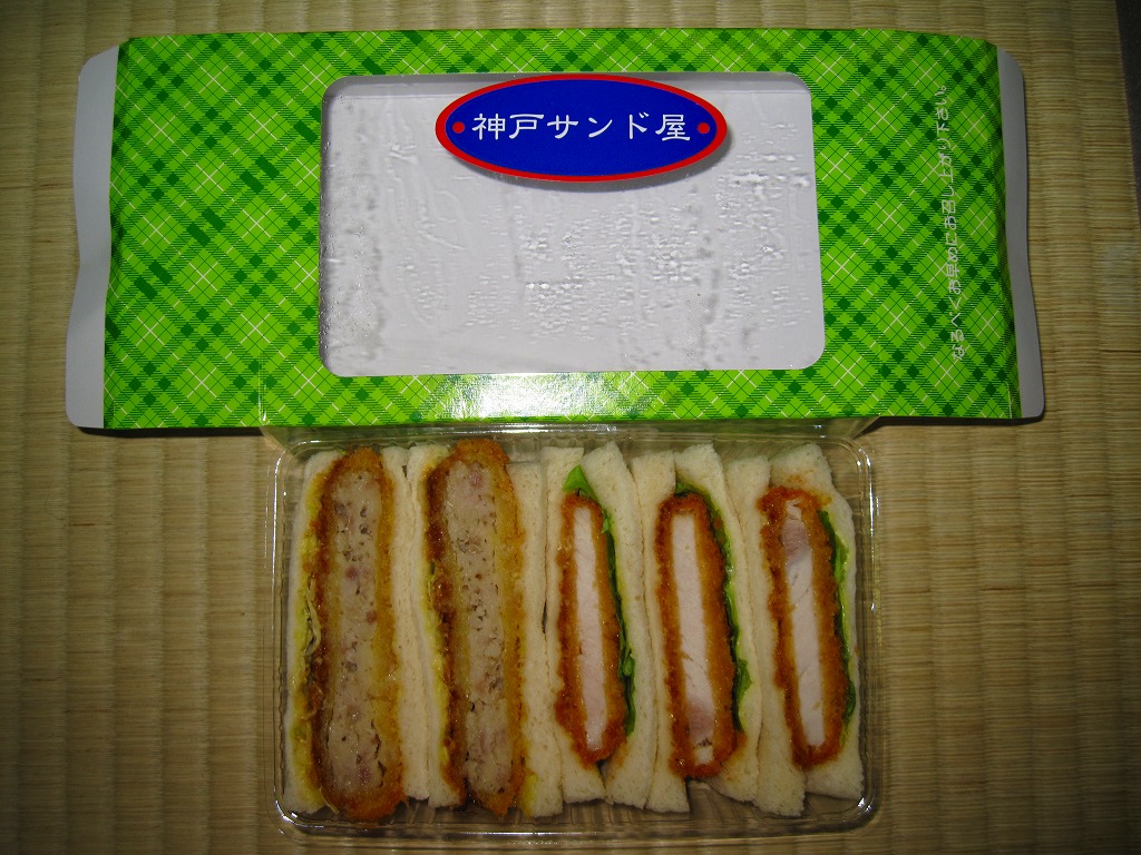 熊本県が県内中小企業を対象にした補助事業「阿蘇くまもと空港キャラクター「あそらくん」を活用した県産品づくり推進事業」により、2010年6月に商品化された16事業者19商品のひとつ。ただし2011年2月の購入時点でも売り場では新商品として紹介されていた。 スーパーの惣菜容器に駅弁のような正方形の掛紙をかける。中身はとんこつライスなる五目飯の上に、棒状の豚角煮、半身の煮玉子、高菜、菜の花、はじかみ、紅生姜を置いたもの。赤身がしっかりしているのに柔らかい豚角煮が味わい深い。なお、ネットで見付けた九州物産展用商品とは掛紙が同じで中身が違う模様。 あそらくんとは2009年5月に誕生した熊本空港のキャラクター。名前は「阿蘇」と「空」から取り、色は熊本の「火の国の赤」と「水の都の青」から取り、阿蘇の五岳と草原をイメージした帽子をかぶっているそうな。熊本市街と阿蘇の中間に位置する熊本空港そのものも、2007年4月から愛称「阿蘇くまもと空港」を名乗っており、気象条件ともども熊本空港と阿蘇は切っても切れない関係にある。 【熊本空港】1960(昭和35)年4月1日開港 熊本県上益城郡益城町大字小谷1802 http://www.kmj-ab.co.jp/ 【有限会社みなみの風】熊本県八代市萩原町2丁目1−6 0965(39)5150 【合資会社頼藤商店】熊本県八代市萩原町2丁目1−6 0965(33)1145 http://www.yorifuji.org/ 神戸サンド屋(ロースカツと黒豚メンチカツサンド)(650円) 2011年2月5日に熊本空港搭乗待合室内ANAFESTAで購入