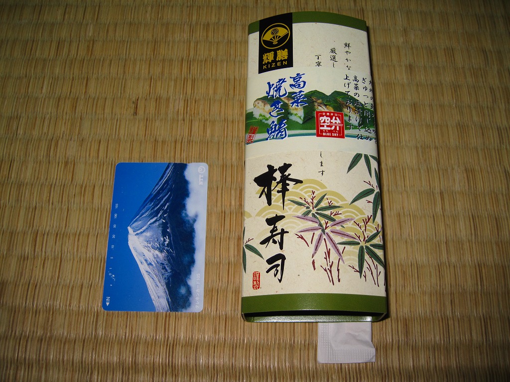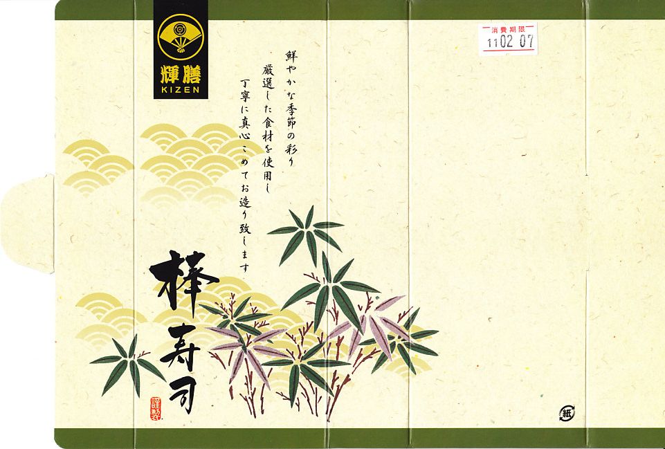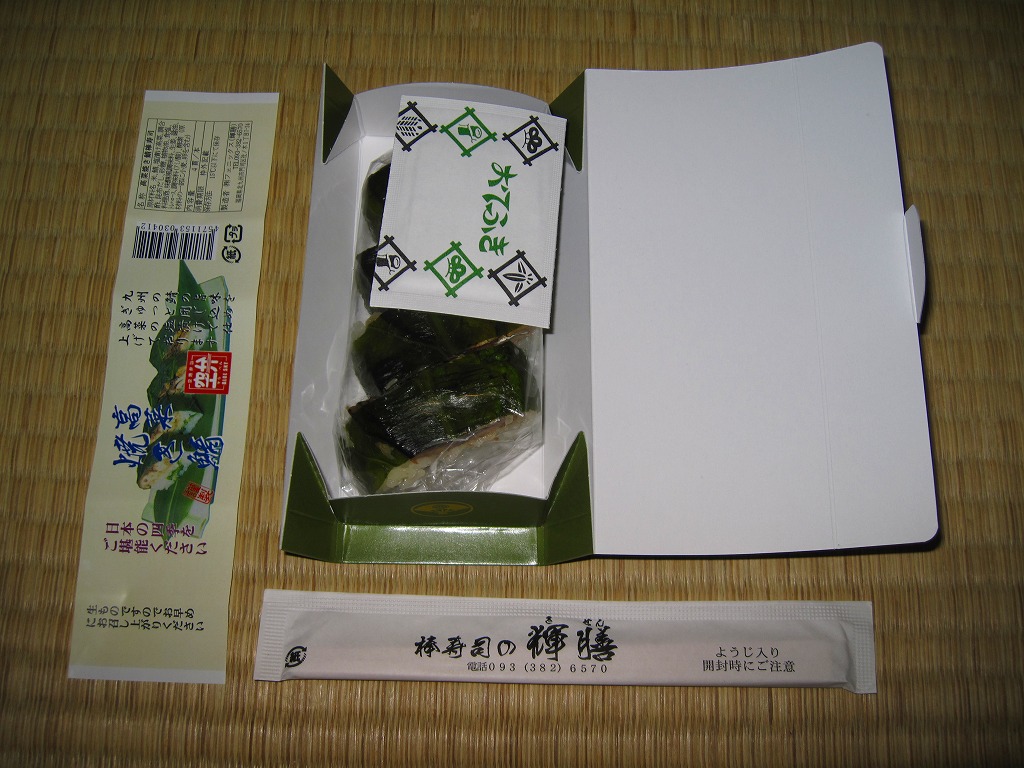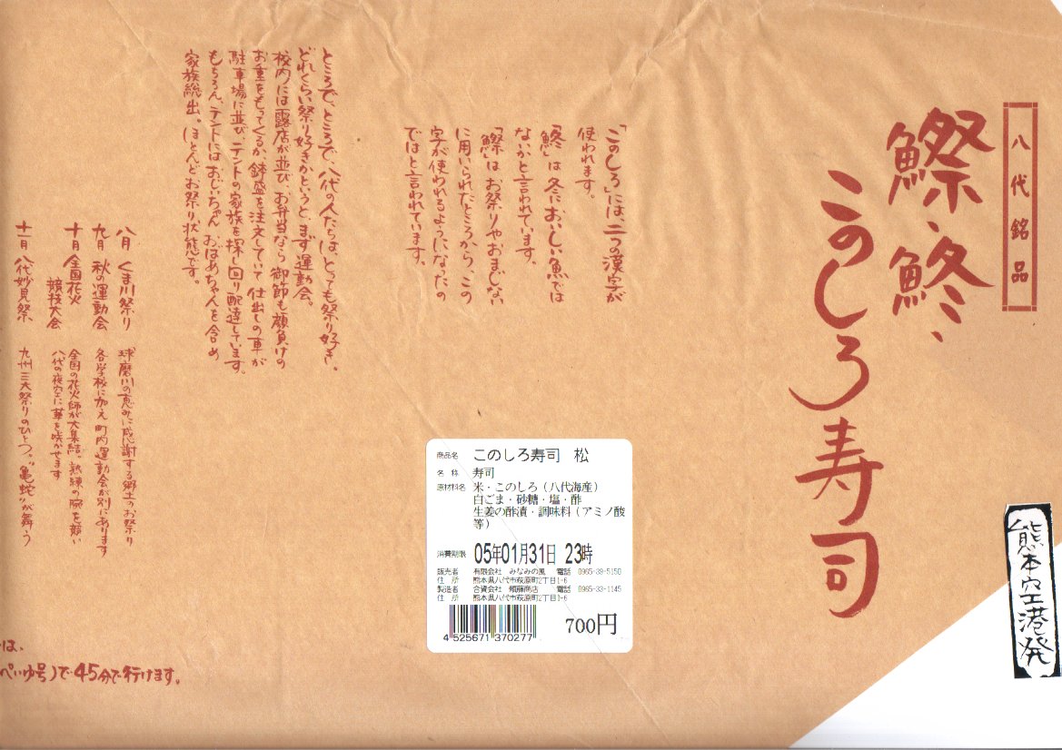 小さな長方形の発泡材容器をオレンジ色の掛紙で包む。中身は鶏炊込飯の上を、ゴボウ混じりの鶏肉フレークと錦糸卵に菜の花や桜大根と椎茸で覆い、うぐいす豆を添えるもの。調製元はJR新八代駅の駅弁に進出した鮎問屋で、駅弁でも同じ名前の商品があるが、空弁はそれより120円安く、中身の分量は体感値で1/3しかないので、こちらは割高が過ぎるのではないかと思う。空弁マークの使用代が嵩んだのだろうか。 【熊本空港】1960(昭和35)年4月1日開港 熊本県上益城郡益城町大字小谷1802 http://www.kmj-ab.co.jp/ 【有限会社みなみの風】所在地の記載なし 0965(39)5150 【合資会社頼藤商店】熊本県八代市萩原町2丁目1−6 0965(33)1145 http://www.yorifuji.org/ ?・鮗・このしろ寿司(700円) 2005年1月30日に阪神百貨店駅弁大会で購入