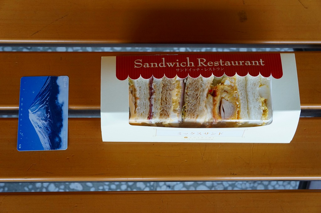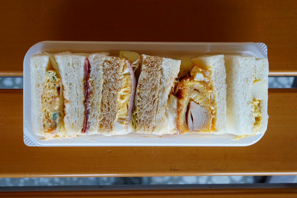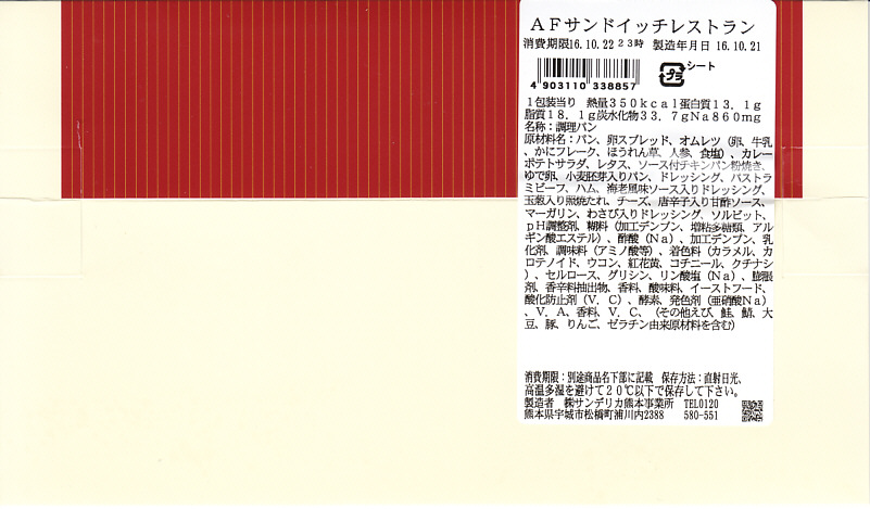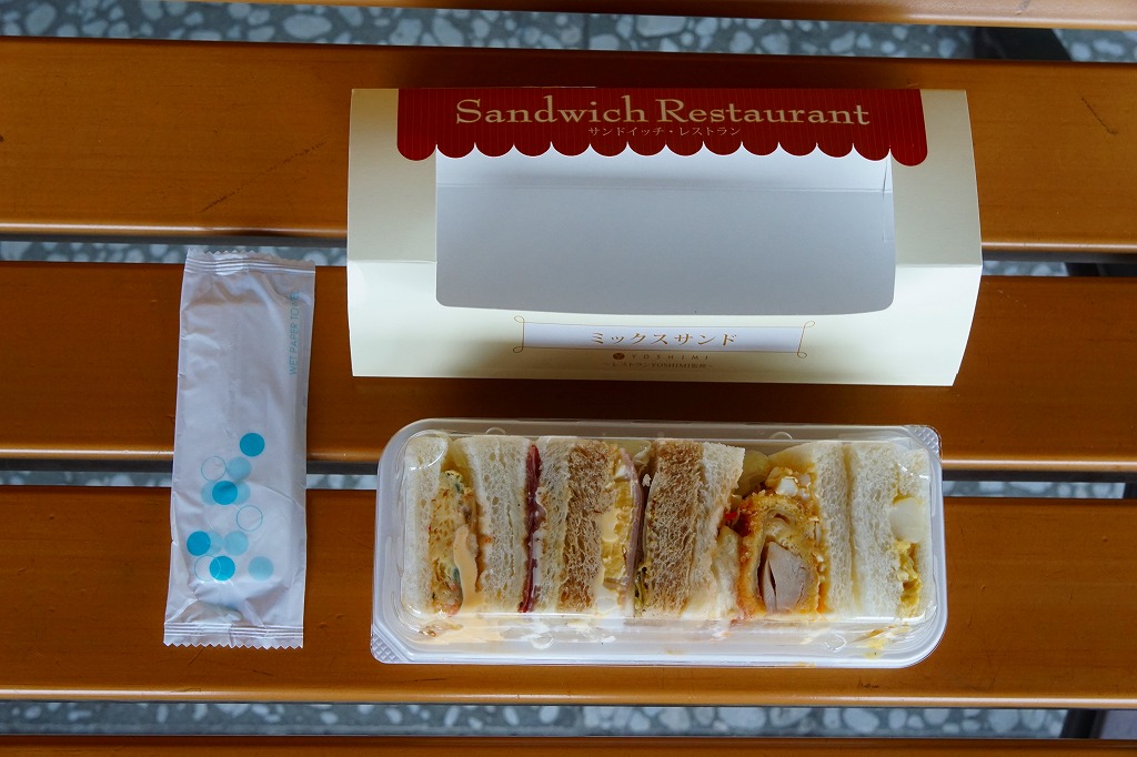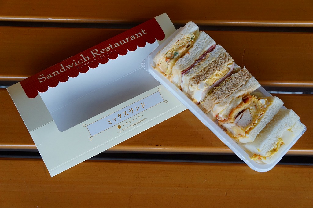 熊本空港で買えた稲荷寿司。2019年に福岡、熊本、佐賀の各空港の売店「ANAFESTA」で発売か。細身の、しかし酢飯を油揚げの袋に詰めるのでなく、板状の油揚げで巻いた、小柄なおいなりさん3個のみを箱詰め。6個入りのものもあるそうな。 南関いなりとは、熊本県玉名郡南関町のみで親しまれる油揚げ「南関あげ」を使う、2010年頃から出回り始めたと思う稲荷寿司。南関あげは同地の名産で、江戸時代前期に伊予松山からの移住者が始めたと考えられる保存食。約30センチ角にもなる薄い油揚げの乾燥品は、地元で味噌汁や海苔巻きならぬ「南関あげ巻き寿司」などに活用される。町内の商店ではどこでも買え、近年は町外の土産物屋でも時々見掛けるようになった。 【熊本空港】1960(昭和35)年4月1日開港 熊本県上益城郡益城町大字小谷1802 http://www.kmj-ab.co.jp/ 【株式会社 グルメトラベラー】福岡県福岡市中央区草香江1−8−19 092(724)3008 http://www.gourmet-traveler.co/ サンドイッチ・レストラン ミックスサンド(580円) 2016年10月22日に熊本空港ターミナルビルの売店で購入