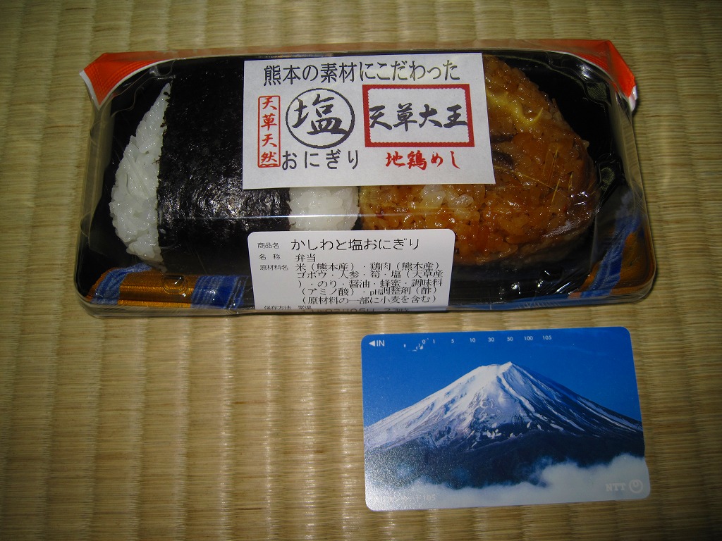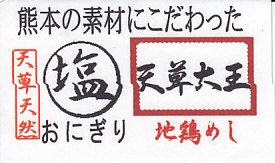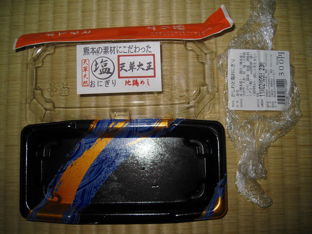熊本空港で販売されていた箱サンド。市販の箱サンド用容器に、ロースカツサンドを3切れとメンチカツサンドを2切れ詰めている。いずれも柔らかいのに脂身感の薄い、昔にも最近にもないような、スマートで爽やかなお味。容器の窓にシールも貼ってある神戸サンド屋とは、兵庫県神戸市でも熊本県でもない大分県大分市に本社を構える手作りサンドウィッチ専門店フランチャイズチェーンである模様。 【熊本空港】1960(昭和35)年4月1日開港 熊本県上益城郡益城町大字小谷1802 http://www.kmj-ab.co.jp/ 【神戸サンド屋熊本大津店】熊本県菊池郡大津町室610−1 096(264)4101 http://www.retasu.co.jp/ 塩おにぎり天草大王地鶏めし(かしわと塩おにぎり)(300円) 2011年2月5日に熊本空港搭乗待合室内ANAFESTAで購入