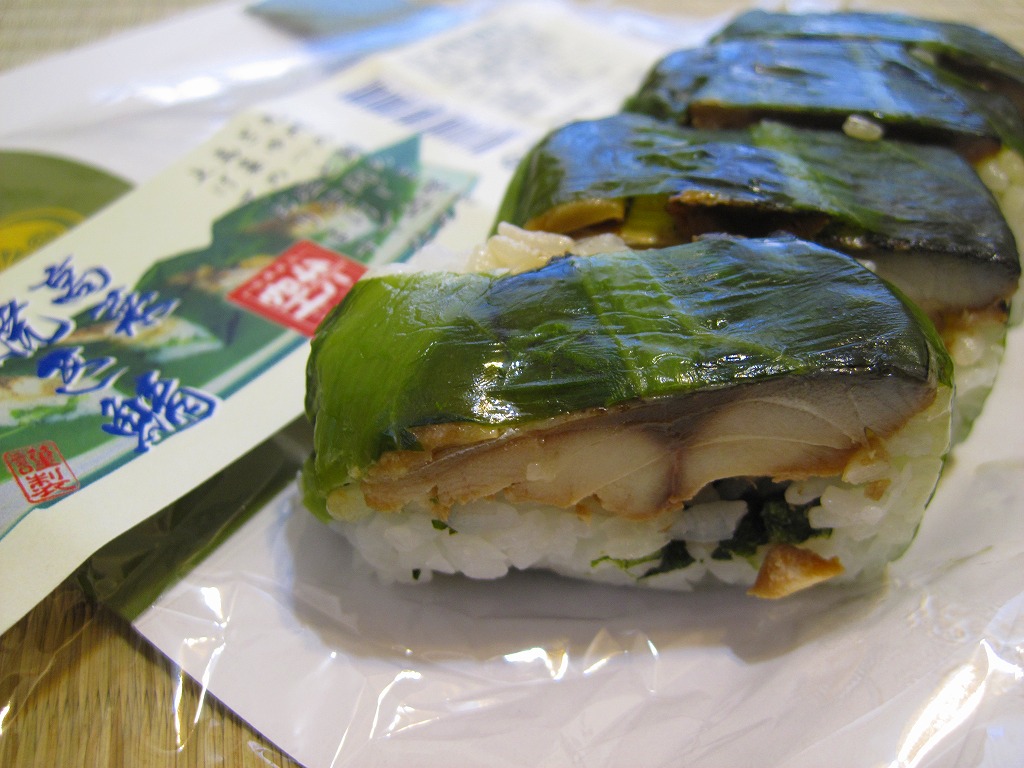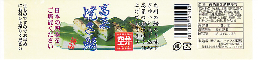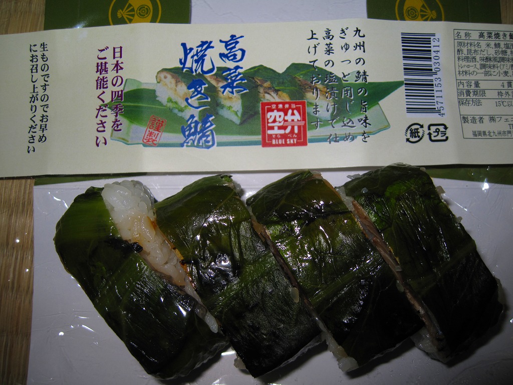 2011年までに発売か。売店での表示は「あか牛弁当」。御飯の上に牛肉煮を広げて紅生姜を置き、玉子焼とゆずダイコンを添える、見た目は普通な牛丼弁当。阿蘇あか牛のバラ肉を使ったというメインの牛肉煮が、コチコチに固くて筋だらけで、まったくうまくなし。よく噛んで最大限に評価して、この牛と肉の特徴であるワイルドな赤身の香りが少々。過去には同じ名前と掛紙で、高菜飯に馬肉煮や辛子蓮根などを詰めて600円という、今とまったく違ってうまい弁当であった模様。この日の夕方の空港内で発見できた弁当は、この1種1個だけであった。 【熊本空港】1960(昭和35)年4月1日開港 熊本県上益城郡益城町大字小谷1802 http://www.kmj-ab.co.jp/ 【旬彩館空港店】熊本県上益城郡益城町大字小谷1802−2 熊本空港ビル 096(232)3352 http://www.kyusanko.co.jp/retail/shunsaikan/ 高菜焼き鯖(680円) 2011年2月5日に熊本空港搭乗待合室内BLUESKYで購入
