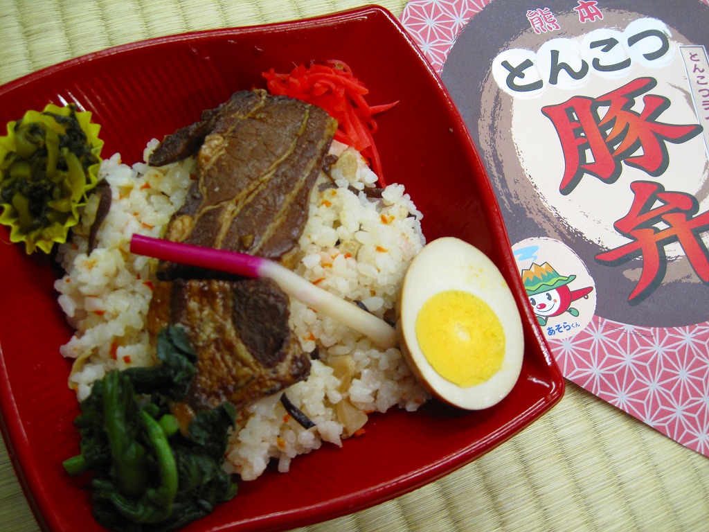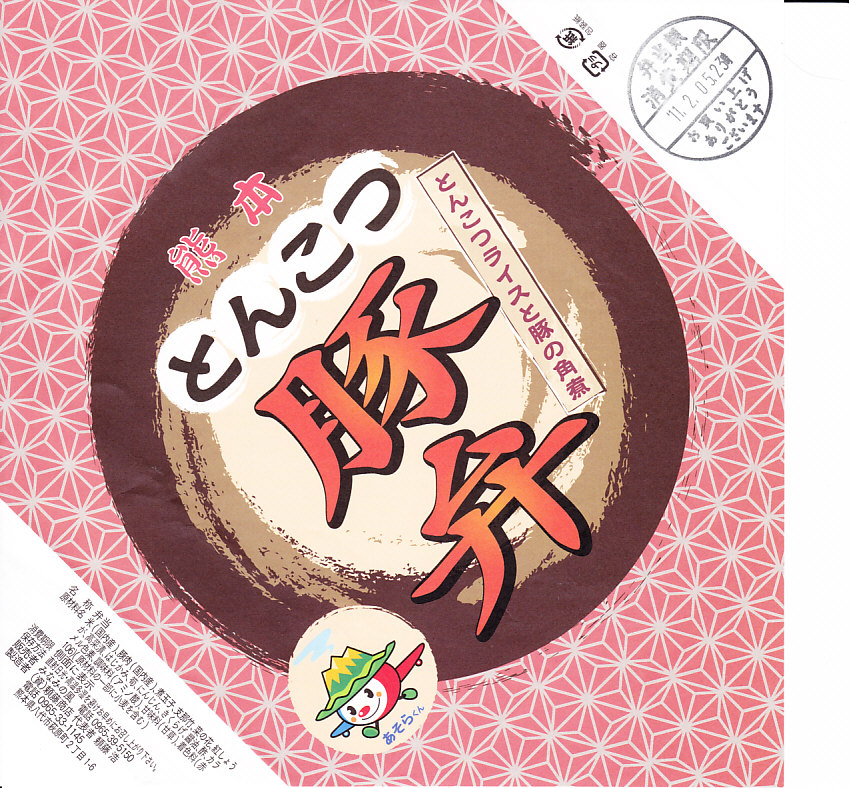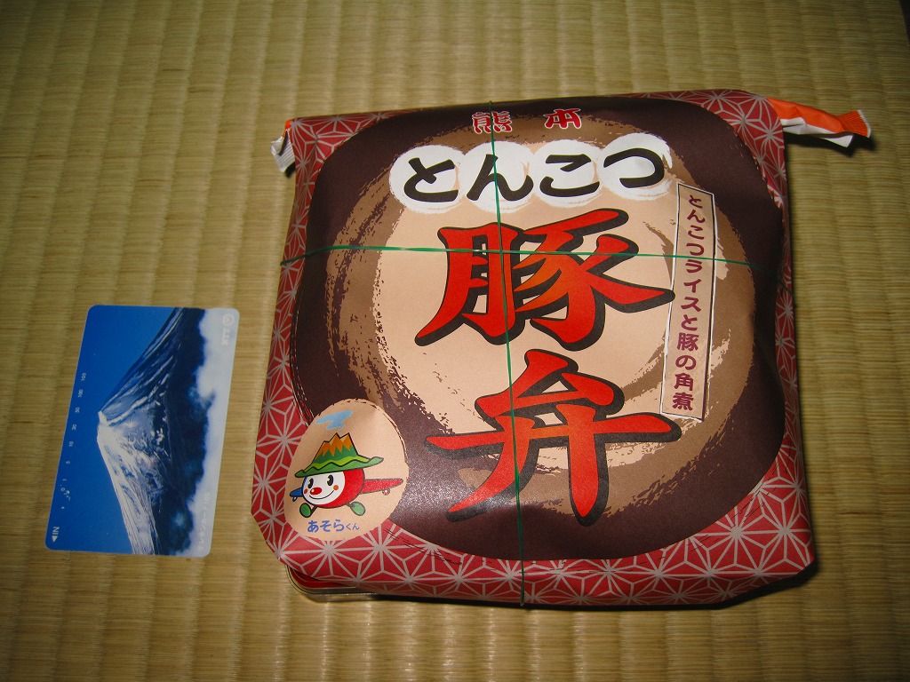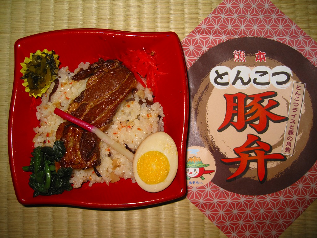 空弁の定番である焼サバ寿司の九州版。高菜を挟んだ棒状酢飯の上に、JAL公式サイトで煮込んで焼いた長崎産と紹介される焼サバを貼り、高菜の塩漬けで巻いてカットして4切れをボール紙の箱に詰めるもの。かなり小柄で少量だが、味がくどくなく食べやすい感じ。北九州、長崎、熊本、大分の各空港のJAL系売店「BLUESKY」で販売されているという。 【熊本空港】1960(昭和35)年4月1日開港 熊本県上益城郡益城町大字小谷1802 http://www.kmj-ab.co.jp/ 【株式会社フェニックス(輝膳)】福岡県北九州市門司区社ノ木1丁目7−34 093(382)6570 とんこつ豚弁(750円) 2011年2月5日に熊本空港搭乗待合室内ANAFESTAで購入
