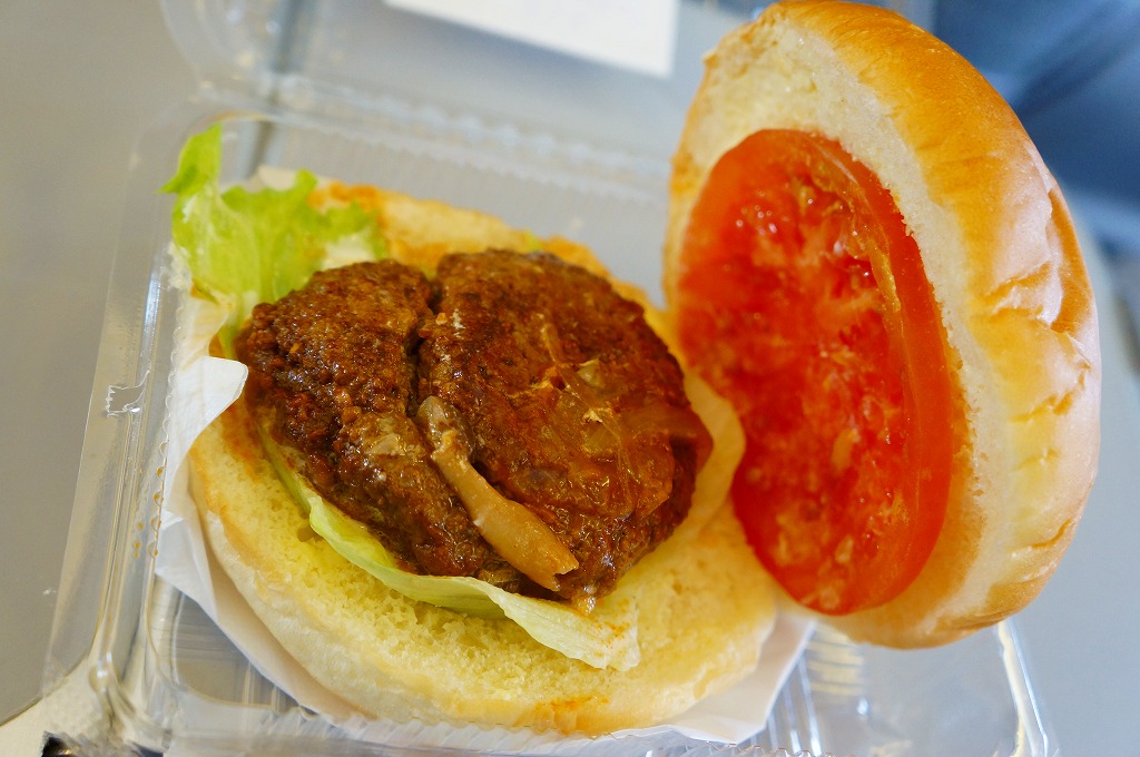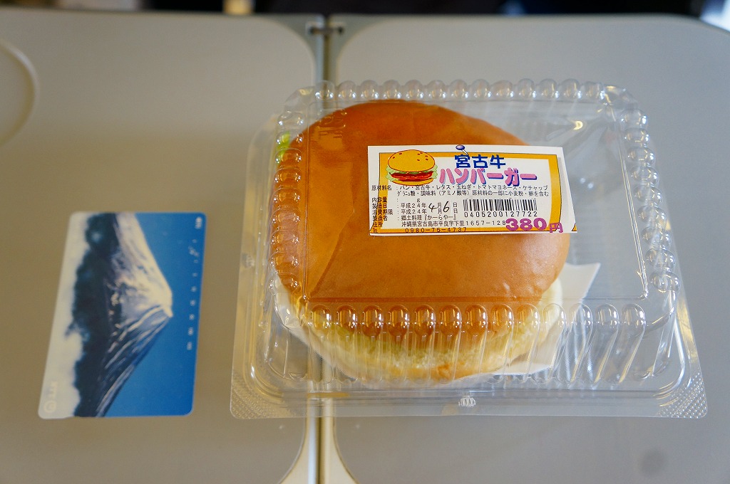 宮古空港カフェスタンドの惣菜のひとつ。コッペパンにマグロの揚げ物、タルタルソース、きゅうり、トマト、レタスを挟んだものが1本、透明なプラ製惣菜容器に収まる。何ら地域性のない商品ではあるが、空港でも駅でもコンビニでも、野菜をそこそこの分量で挟むサンドイッチや、肉ではなく魚を挟むサンドイッチはなかなか買えないから、その点が良い。 宮古島はいわゆる平成の大合併の影響による2005年10月の1市5町合併により、すべて宮古島(みやこじま)市となった。当初は宮古市を名乗ると決めていたが、1941年から市制を敷く岩手県宮古市から物言いが付き、現在の名称へ落ち着いた。町村と違い市は既存の名称を使えないのに、なぜおかしな結論を出してしまったのだろうか。 【宮古空港】1943(昭和18)年6月開港 沖縄県宮古島市平良字下里 http://www.miyakoap.co.jp/ 【郷土料理かーらやー】沖縄県宮古島市平良字下里1657−128 0980(75)4737 宮古牛ハンバーガー(380円) 2012年4月6日に宮古空港搭乗待合室カフェスタンドで購入